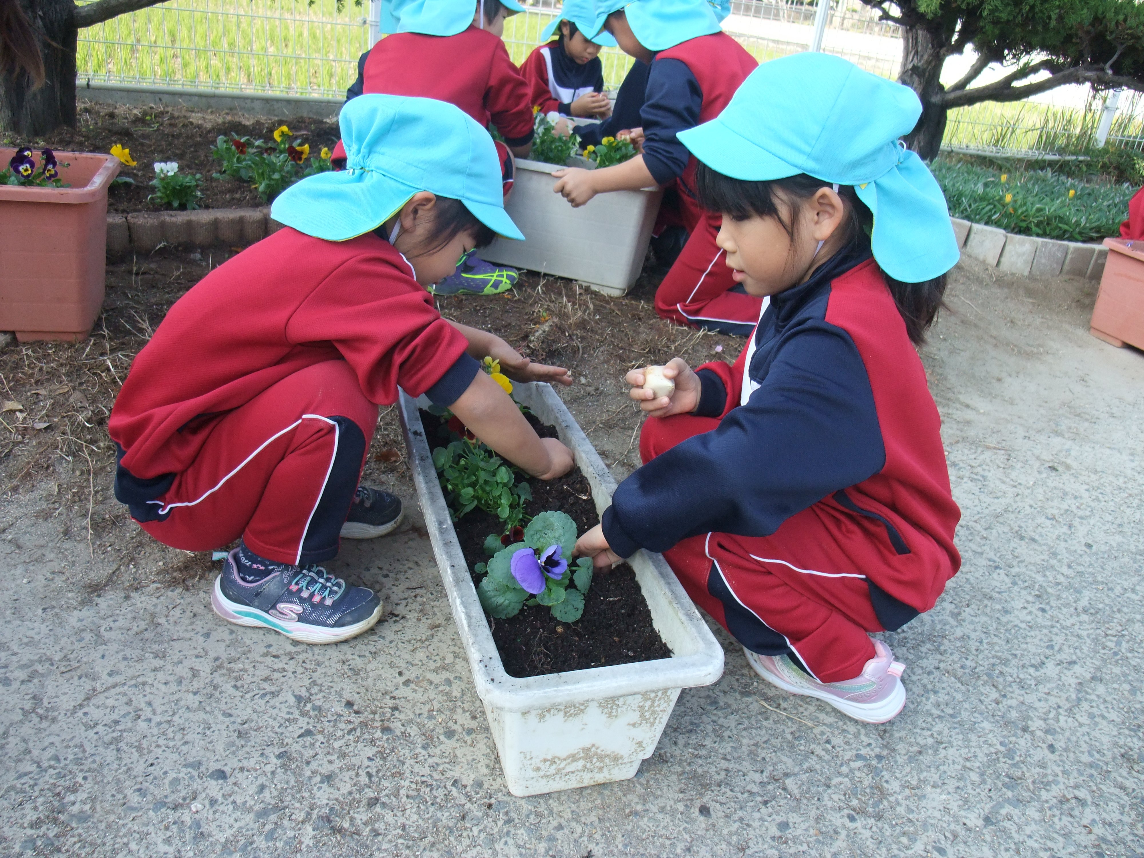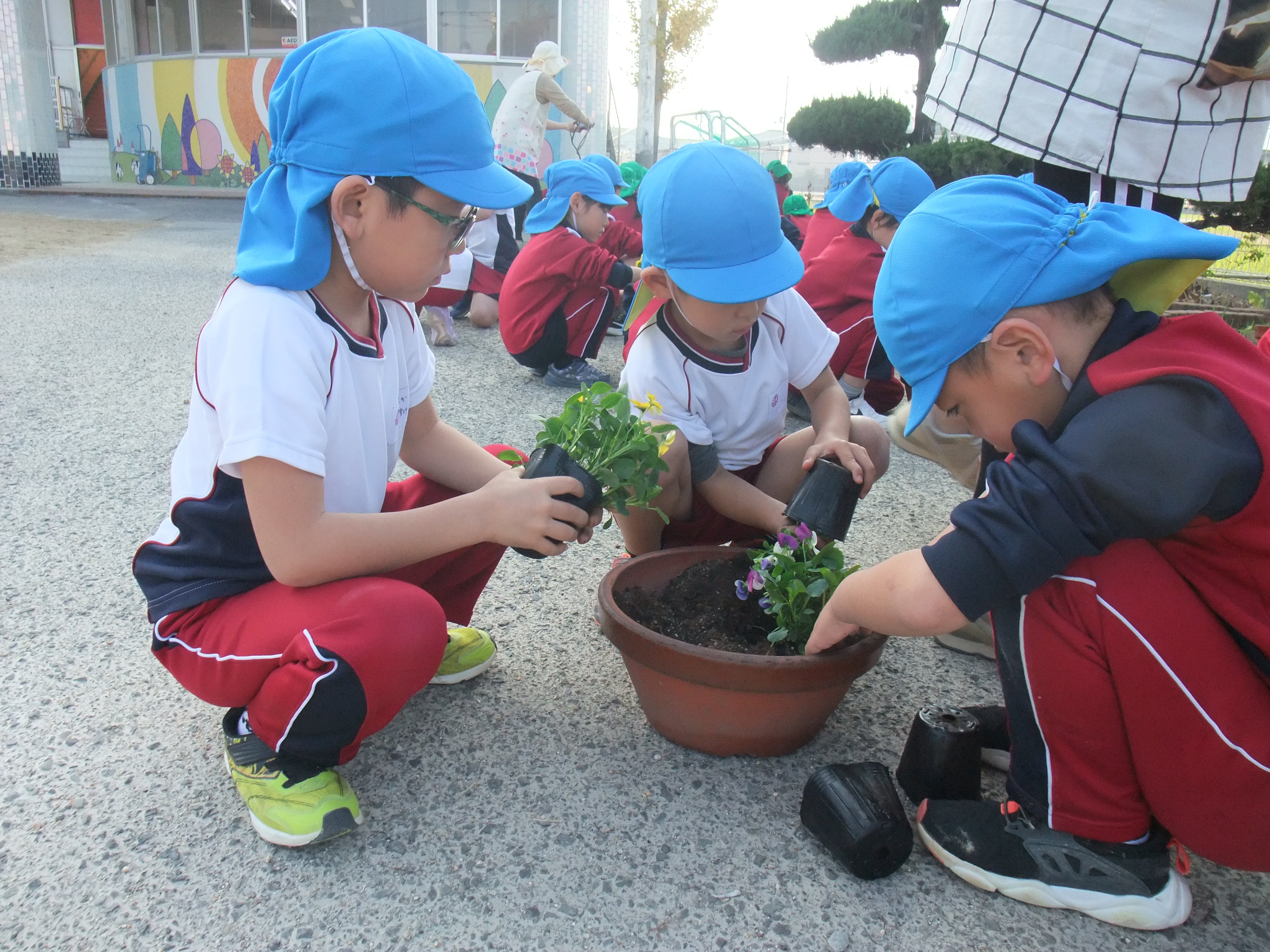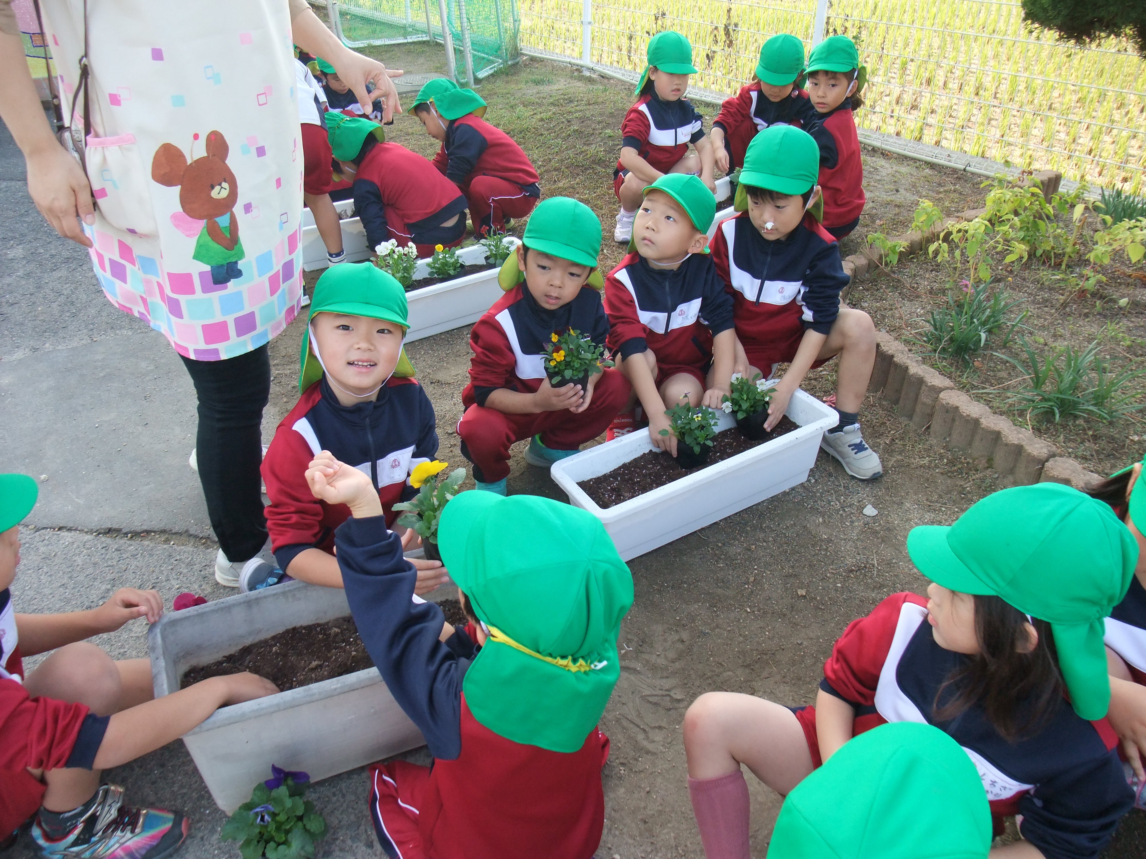 花育活動を行いました 2020年11月18日(水) 年長児が花の里かがわ推進委員会主催の「花育活動」に参加しました。 「きれいな花だね!」「〇〇色が植えたい!」など子どもたちは興味津々。 園庭はパンジーやビオラでいっぱいになりました。