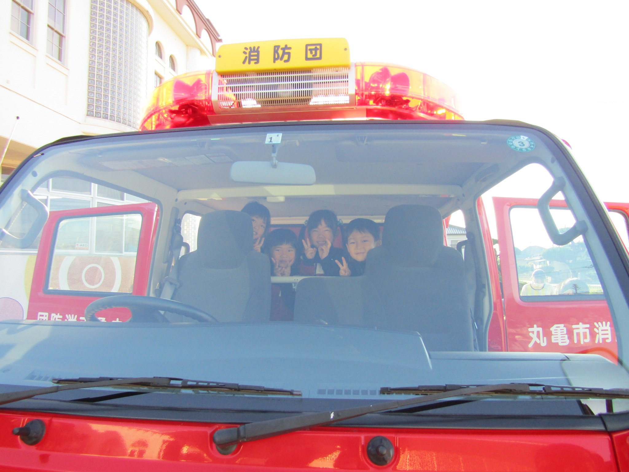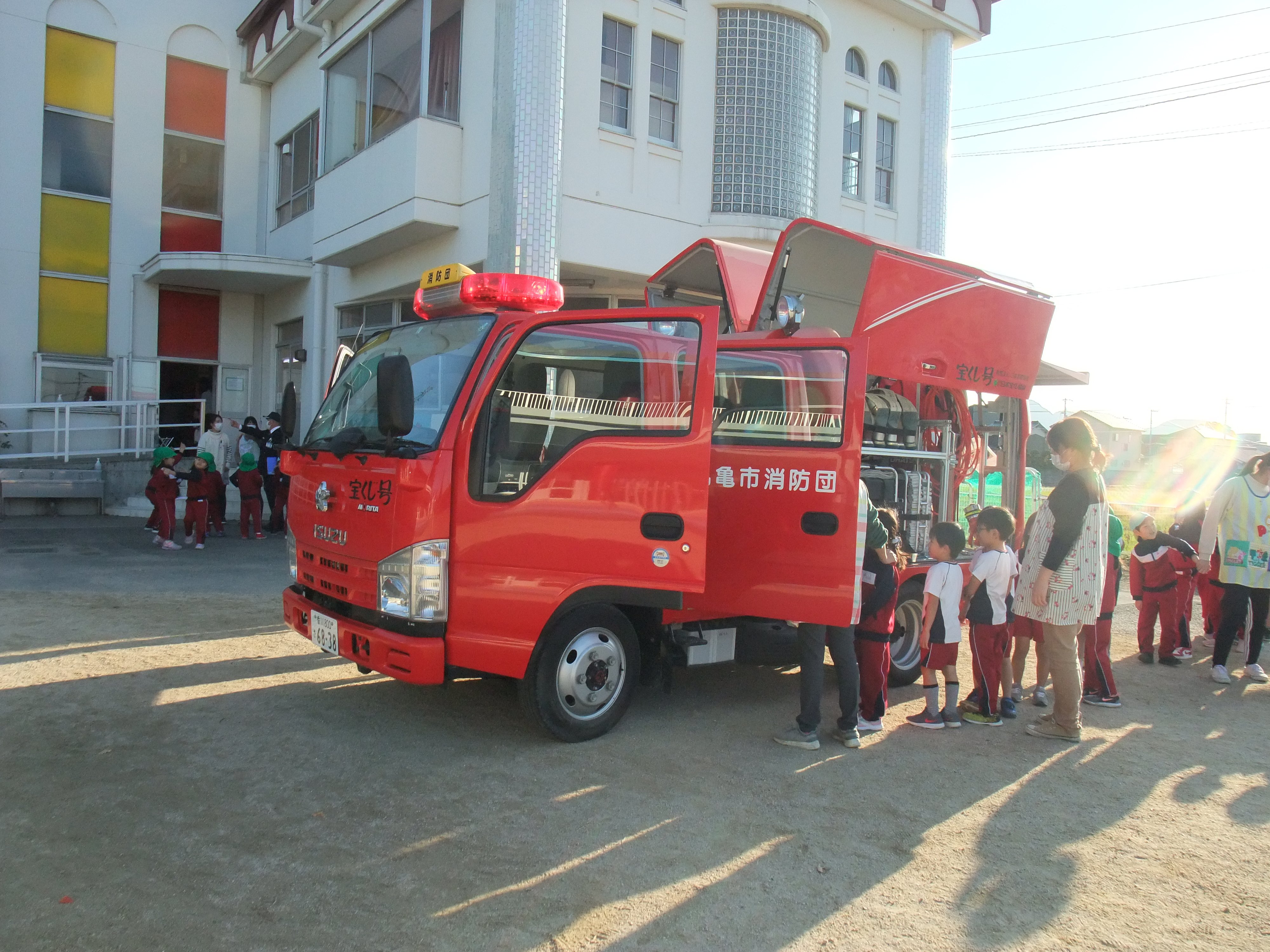 消防車がやってきました 2020年11月24日(火) 園に消防車がやってきました。 預かり保育でを利用している子ども達は興味津々です。 「ウ~、ウ~」と本物さながらにサイレンの真似をする子もいましたよ。 消防車に乗せてもらい、とてもうれしそうでした。