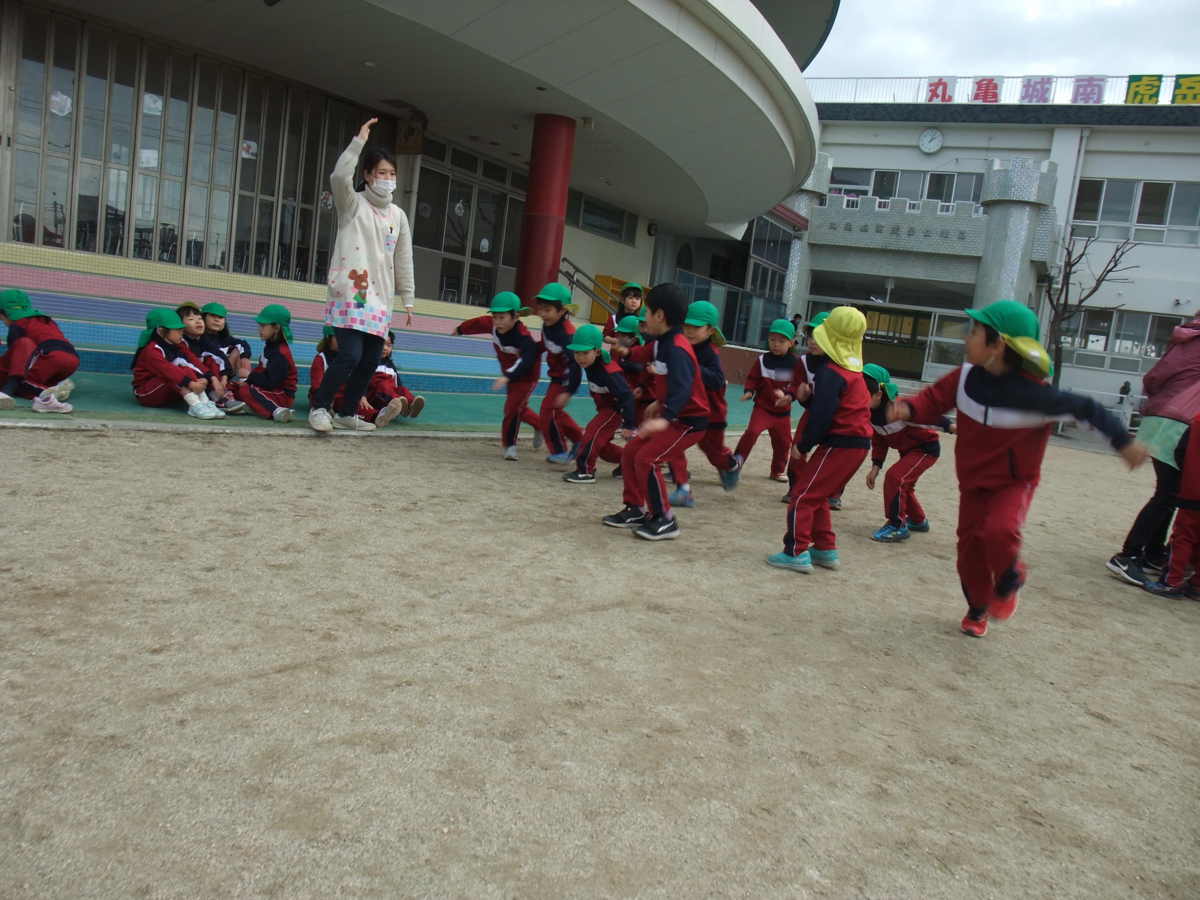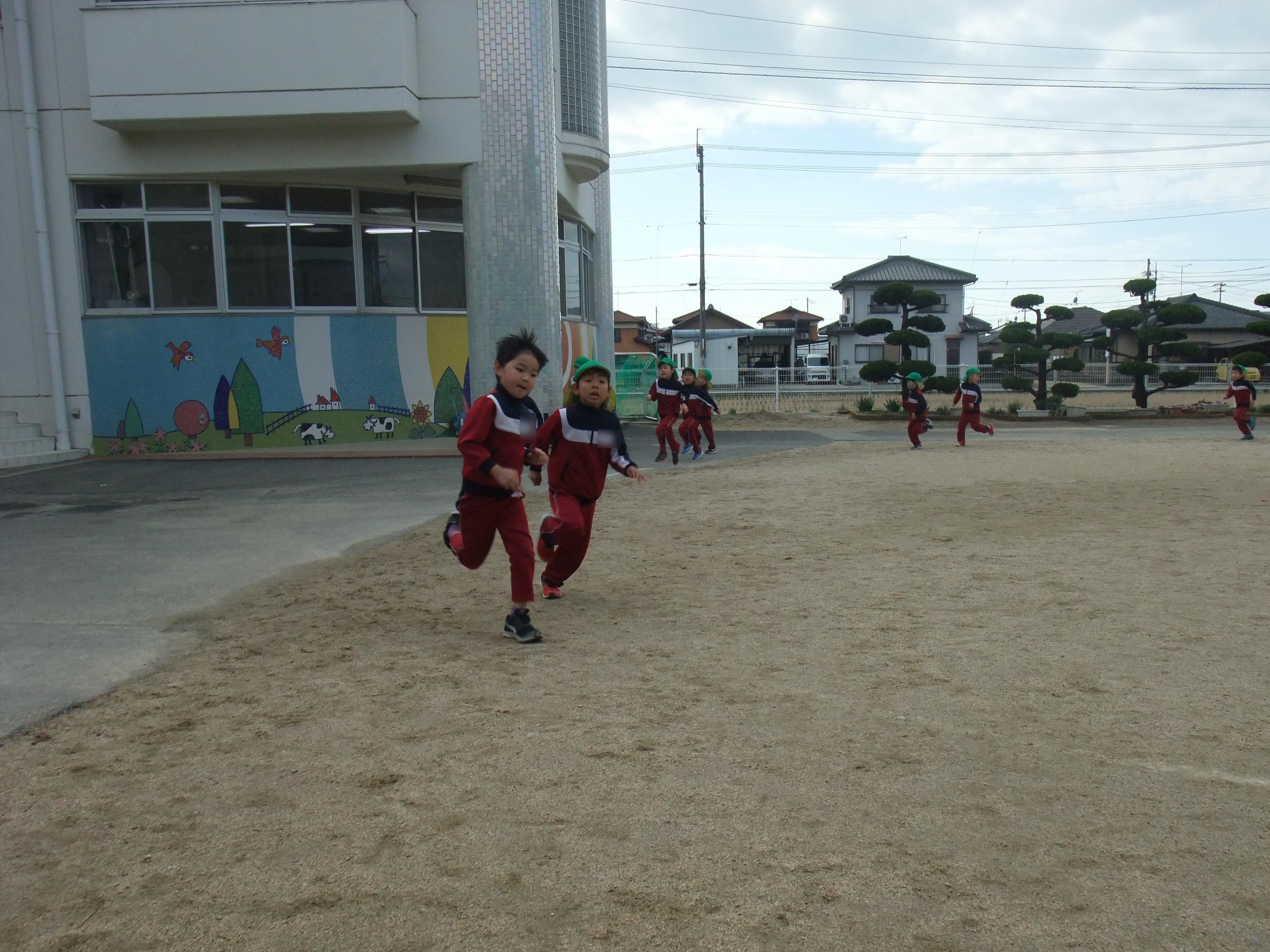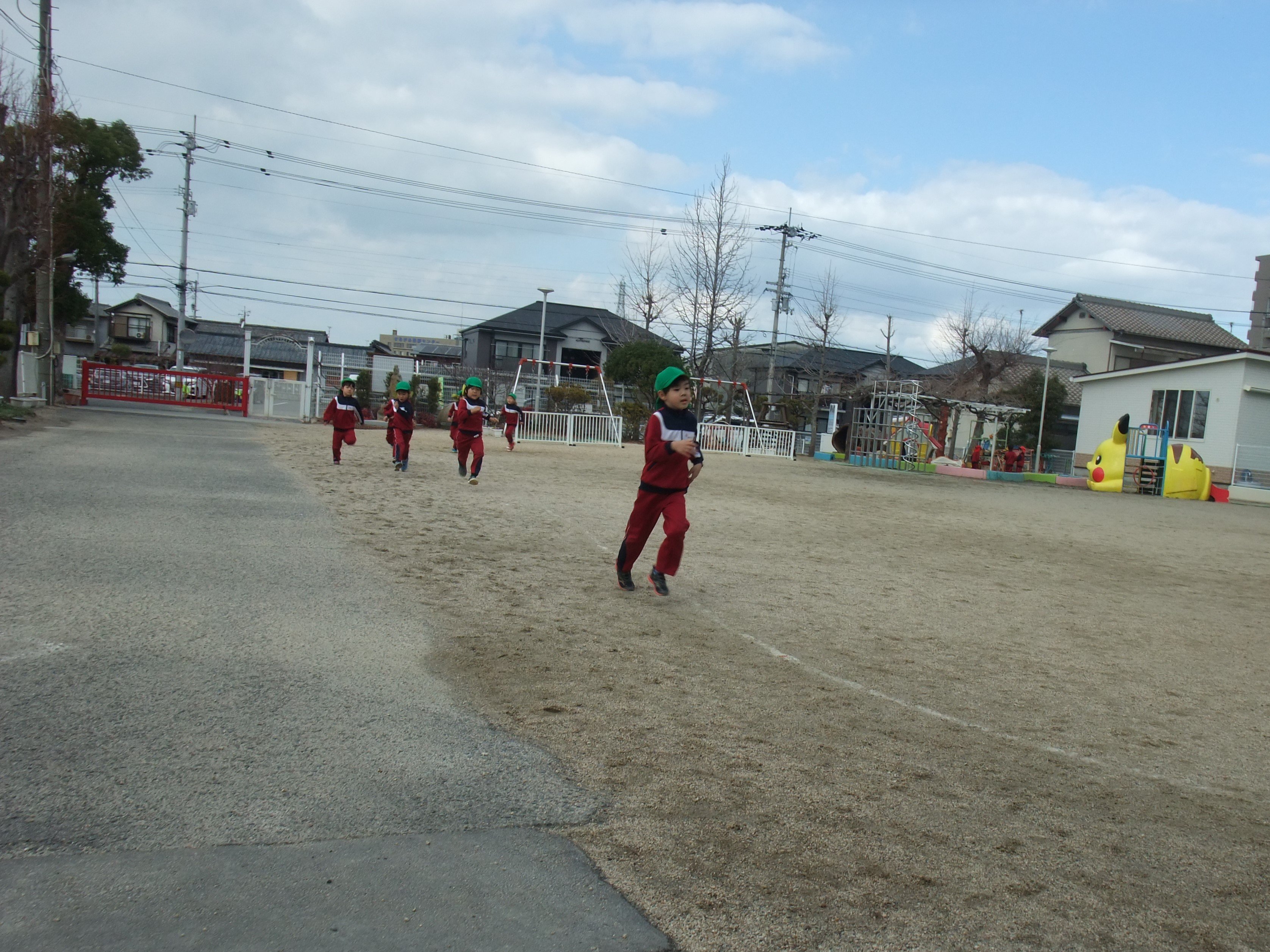 マラソン 2021年01月27日(水) 「よーいどん!」の合図に勢いよく駆け出す子ども達。 年長児クラスの子ども達が園内マラソン大会に向けて走っています。 「あと5周!がんばれ!」のお友達や先生の声援を受け、転んでも、追い抜かれても諦めずに走り切る子ども達でした。