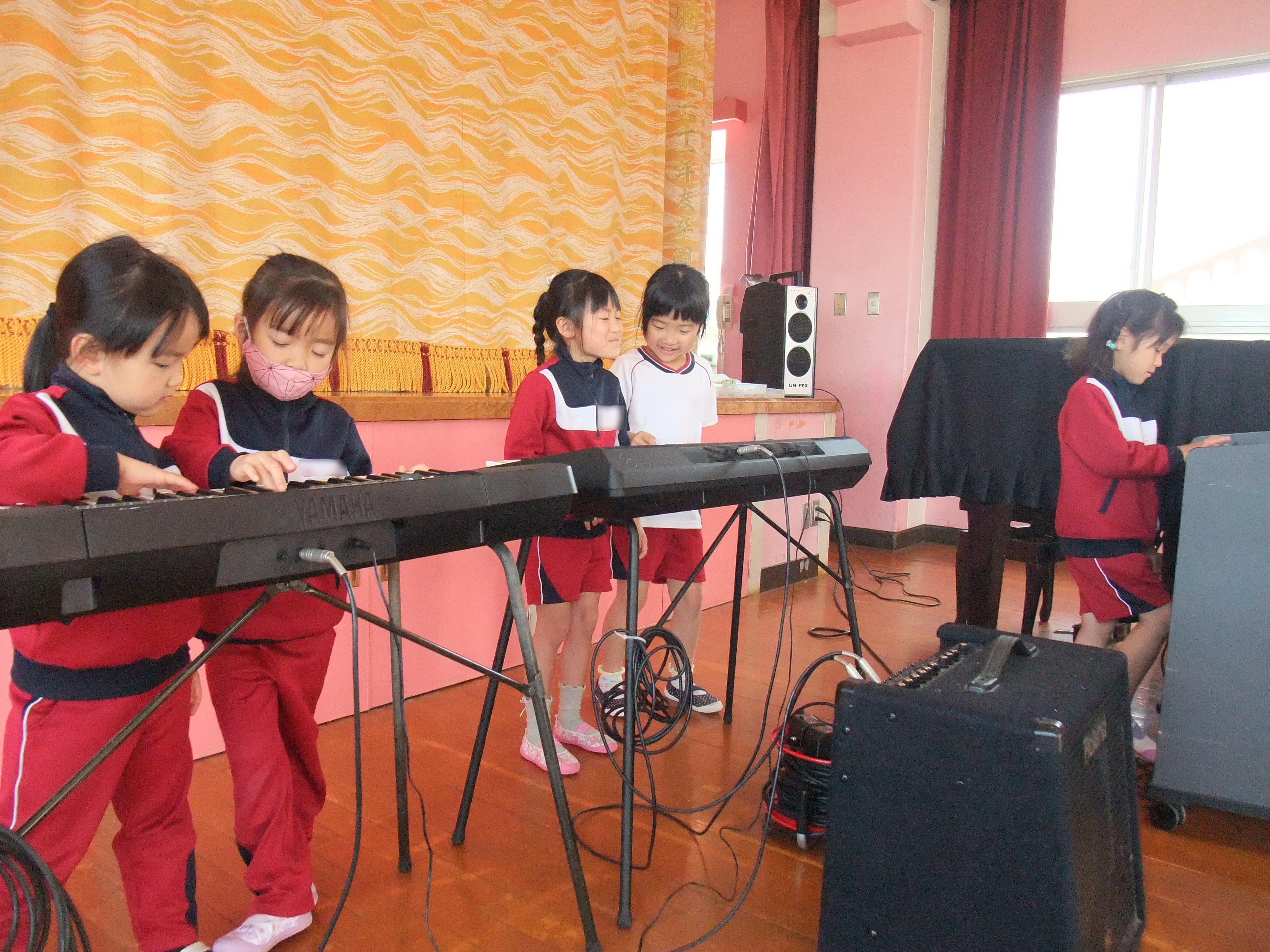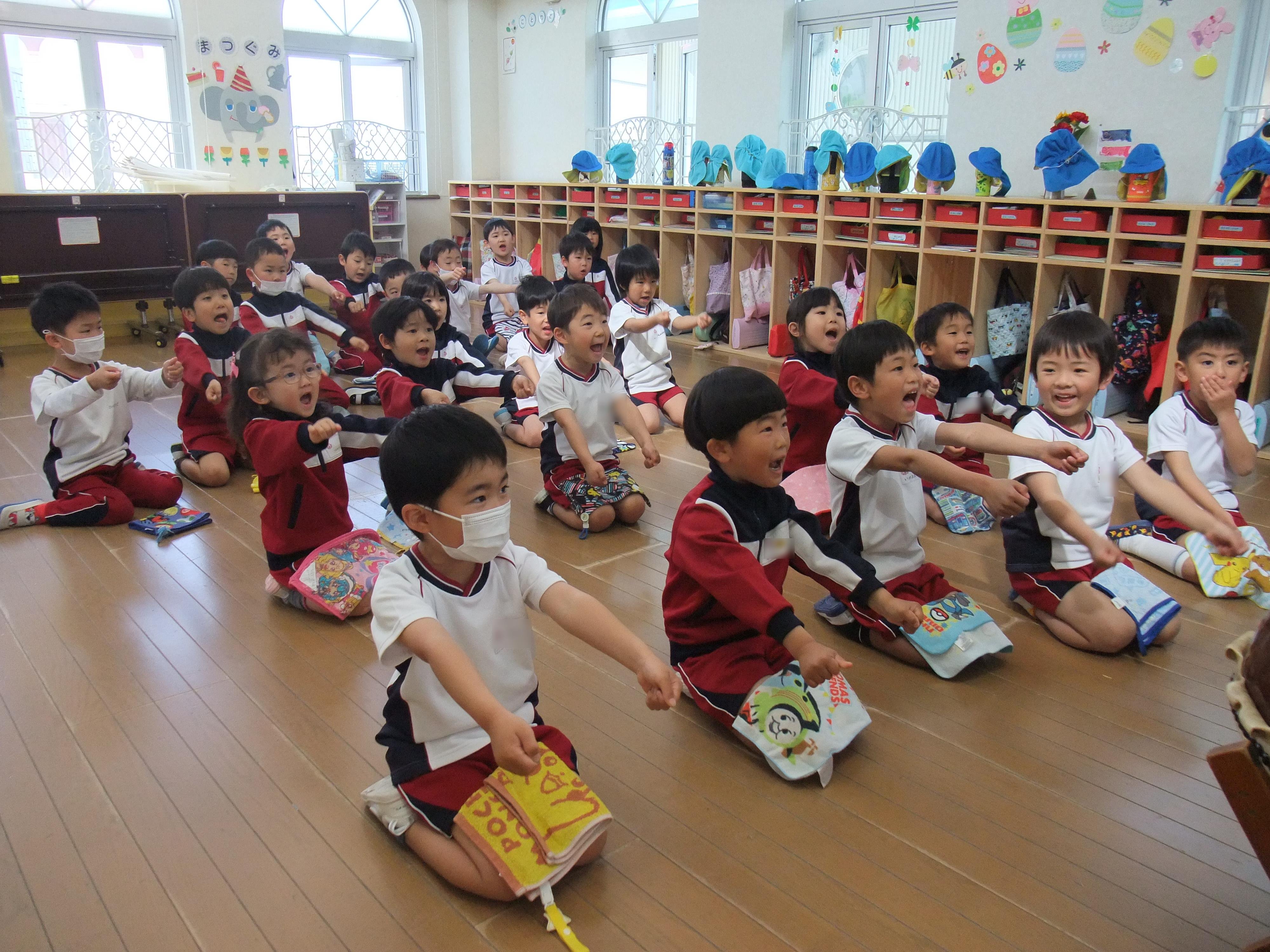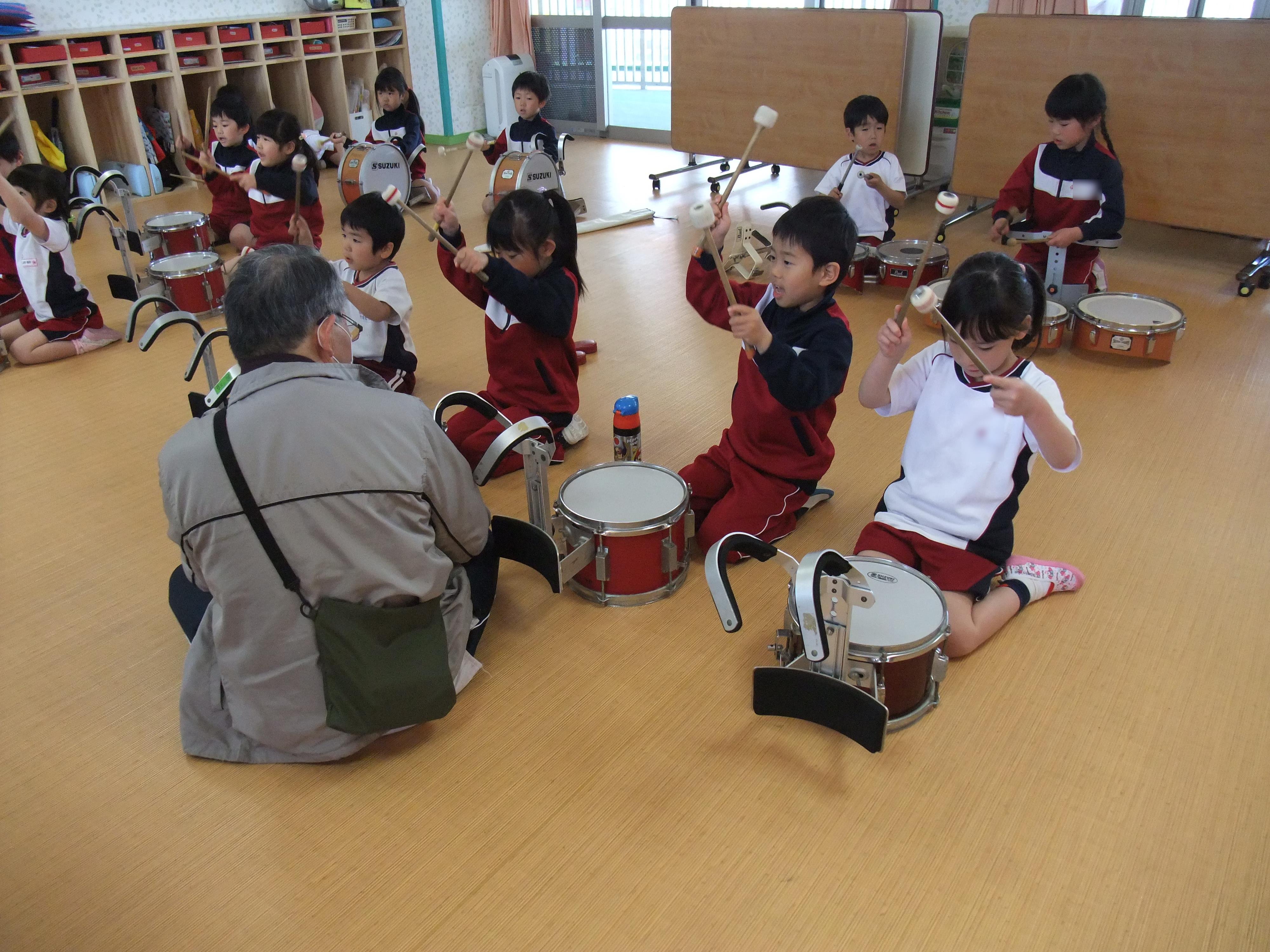 室内音楽(年長児) 2021年04月20日(火) 今日は、年長児クラスの音楽の日です。 音楽講師の新田先生に、10月の運動会で演奏するパレードを教えていただきました。 また、和太鼓演奏をする子ども達は別室で、お膝を太鼓かわりに元気いっぱい練習中です。