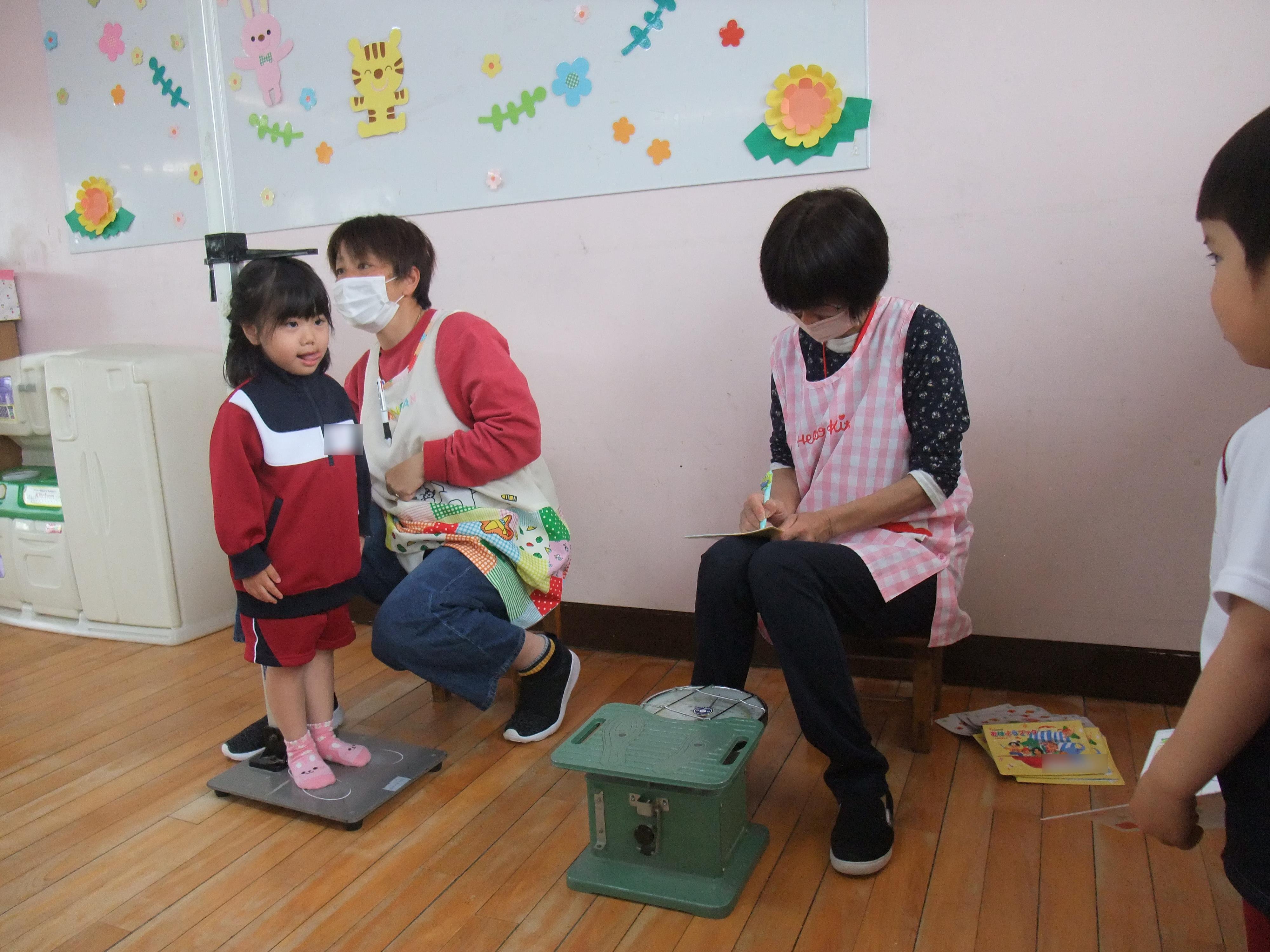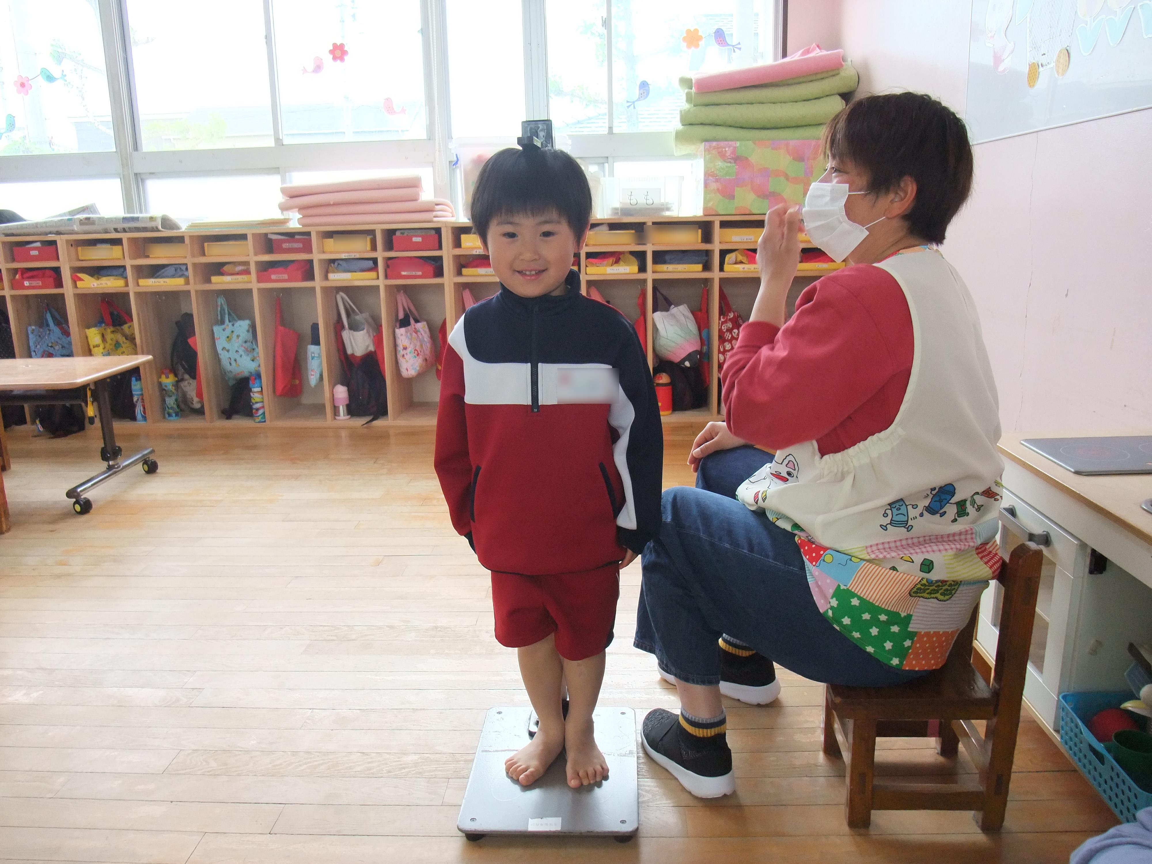 身体測定 2021年04月28日(水) 今日は毎月行っている身体測定の日。 身長と体重を測定します。 「きをつけ、ピッ」と背筋をピンッと伸ばす子、ドキドキ緊張して肩に力が入っている子もいました。 お帳面の後方ページに今日の測定結果を記入しています。ぜひご覧ください。