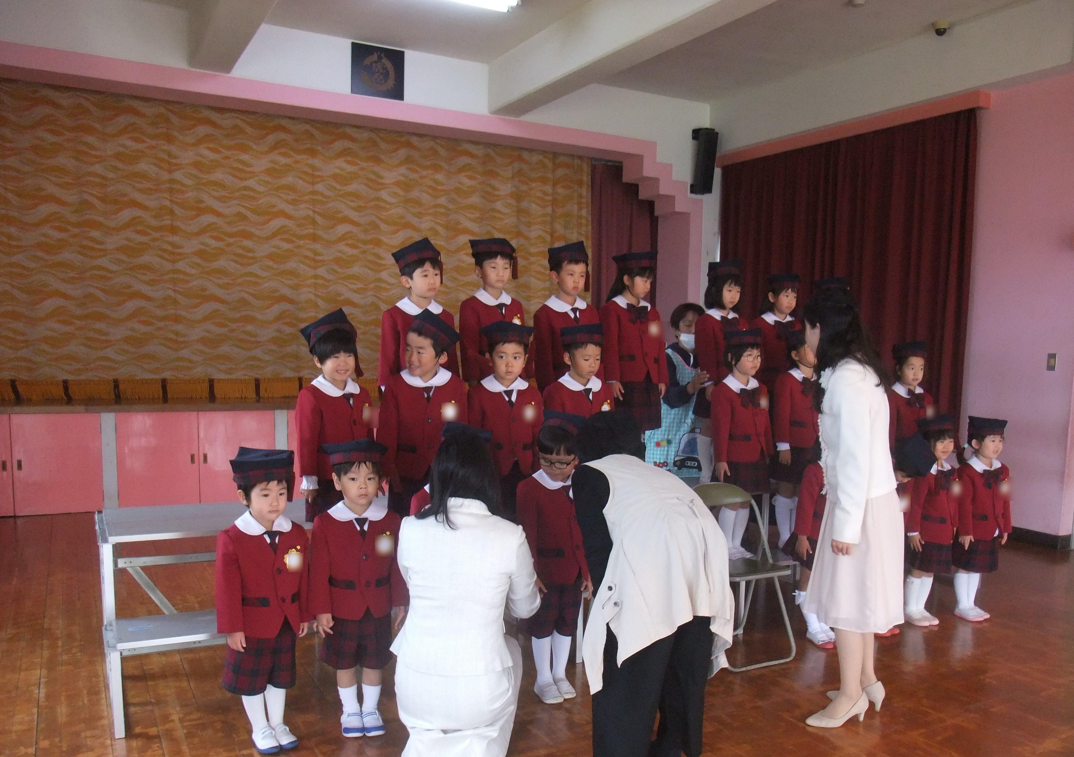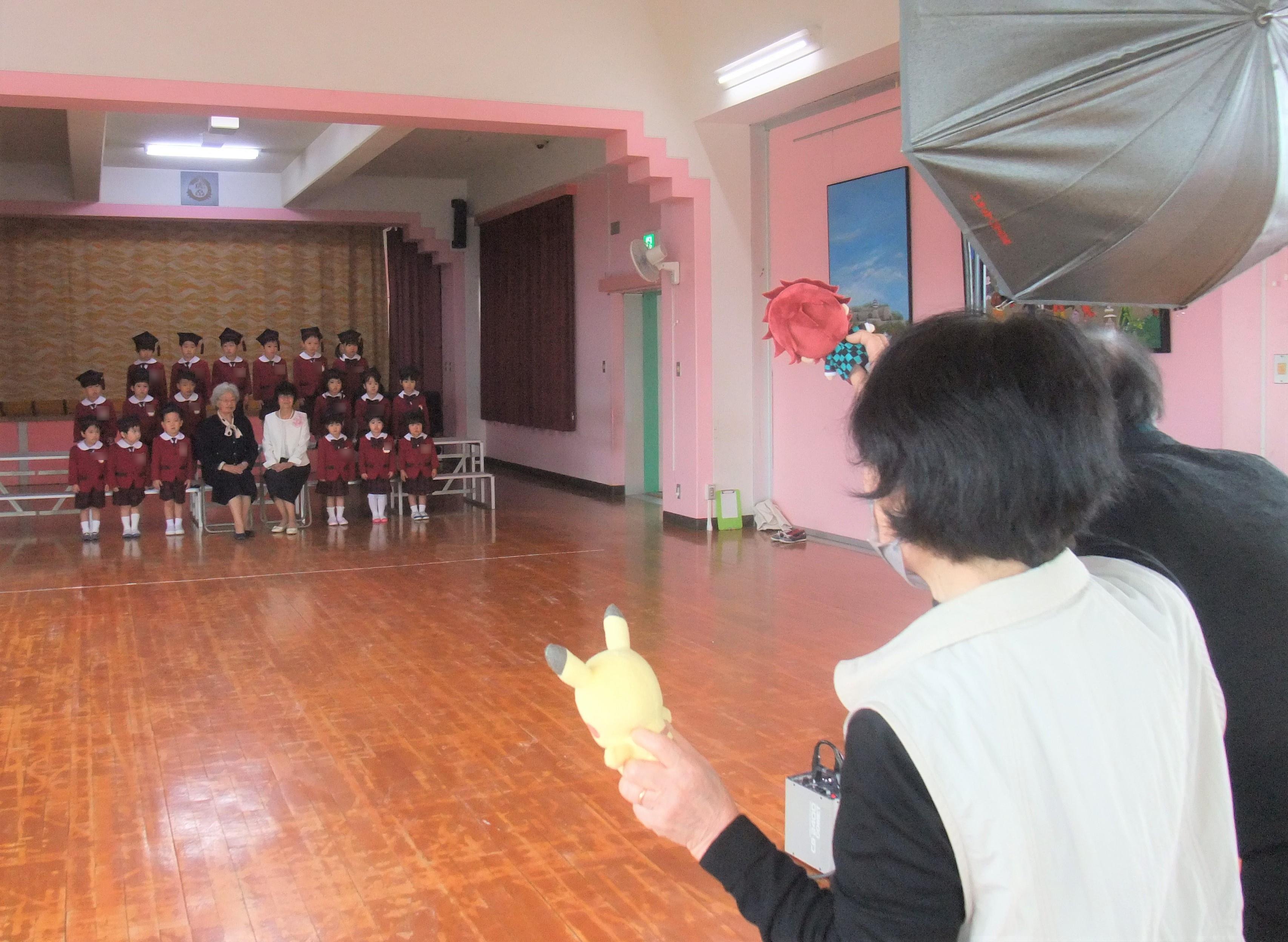 風雨のため、今年はお遊戯室でクラスごとに集合写真を撮りました。