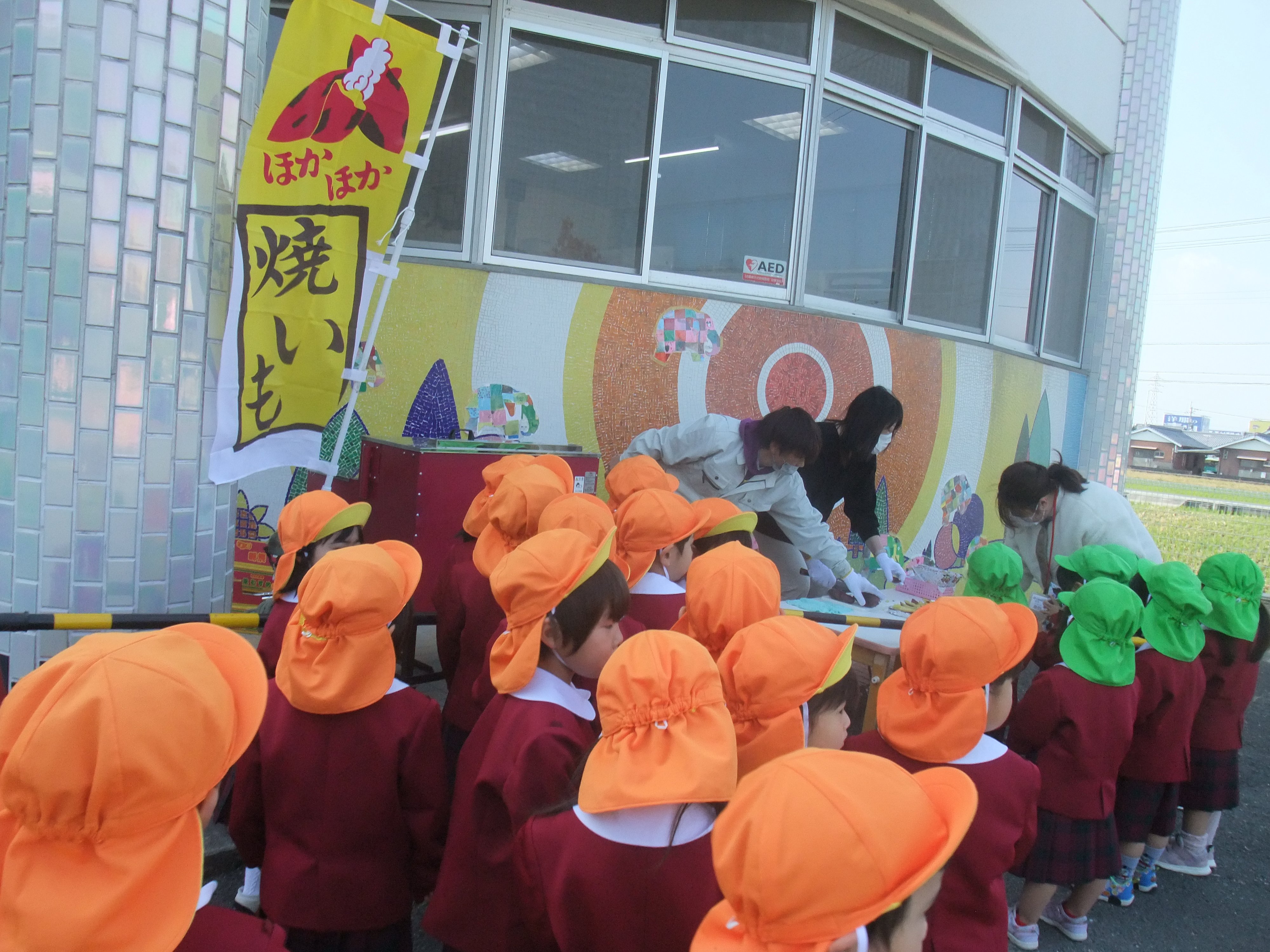 やきいもパーティ 2021年11月15日(月) 七五三参りから帰ると、園庭からいいにおいが! 子どもたちも「いいにおいがする!」「やきいも できたんかな?」と楽しみな様子です。 ほかほかのお芋をもらって嬉しそうな子どもたちでした。