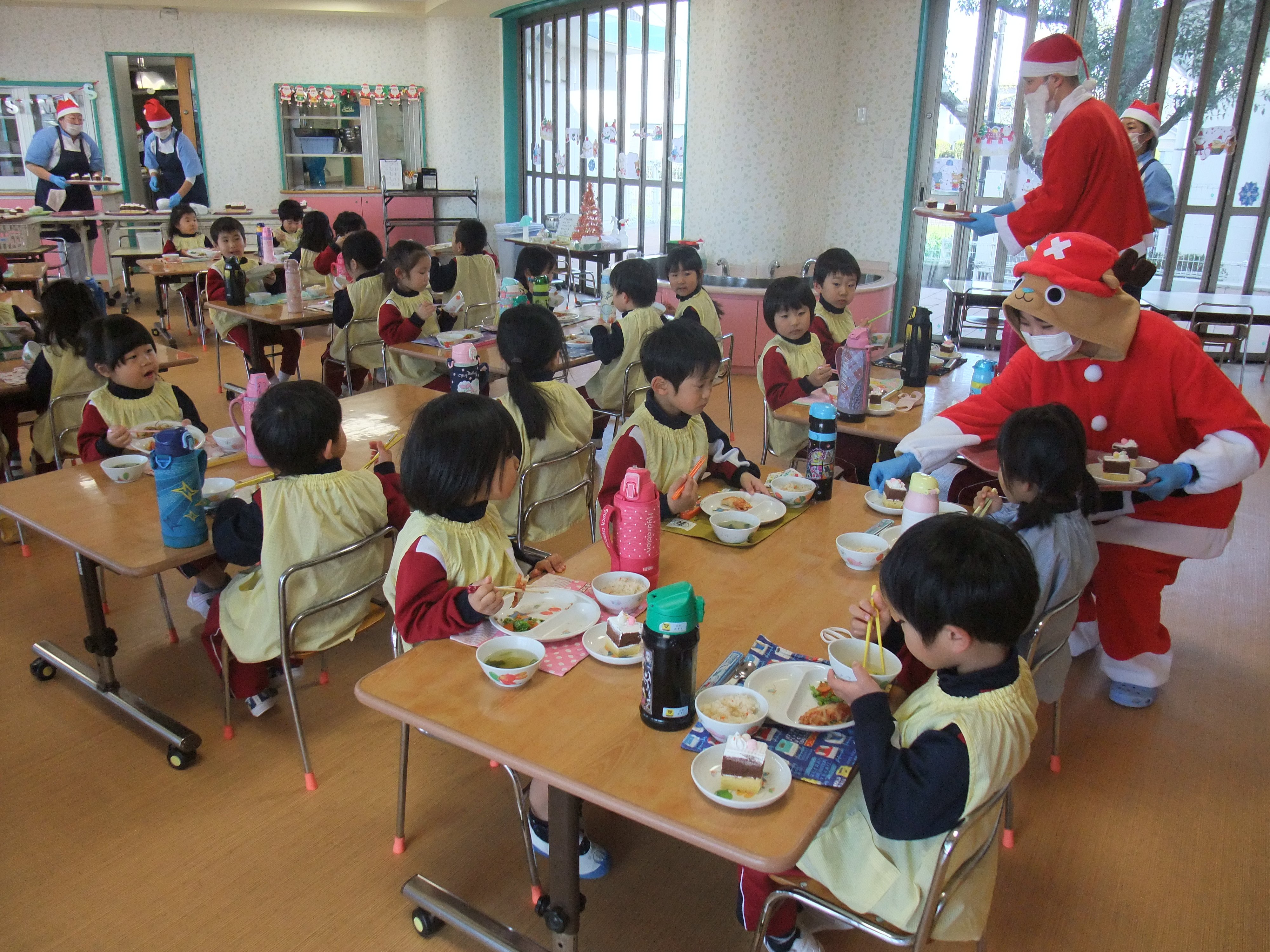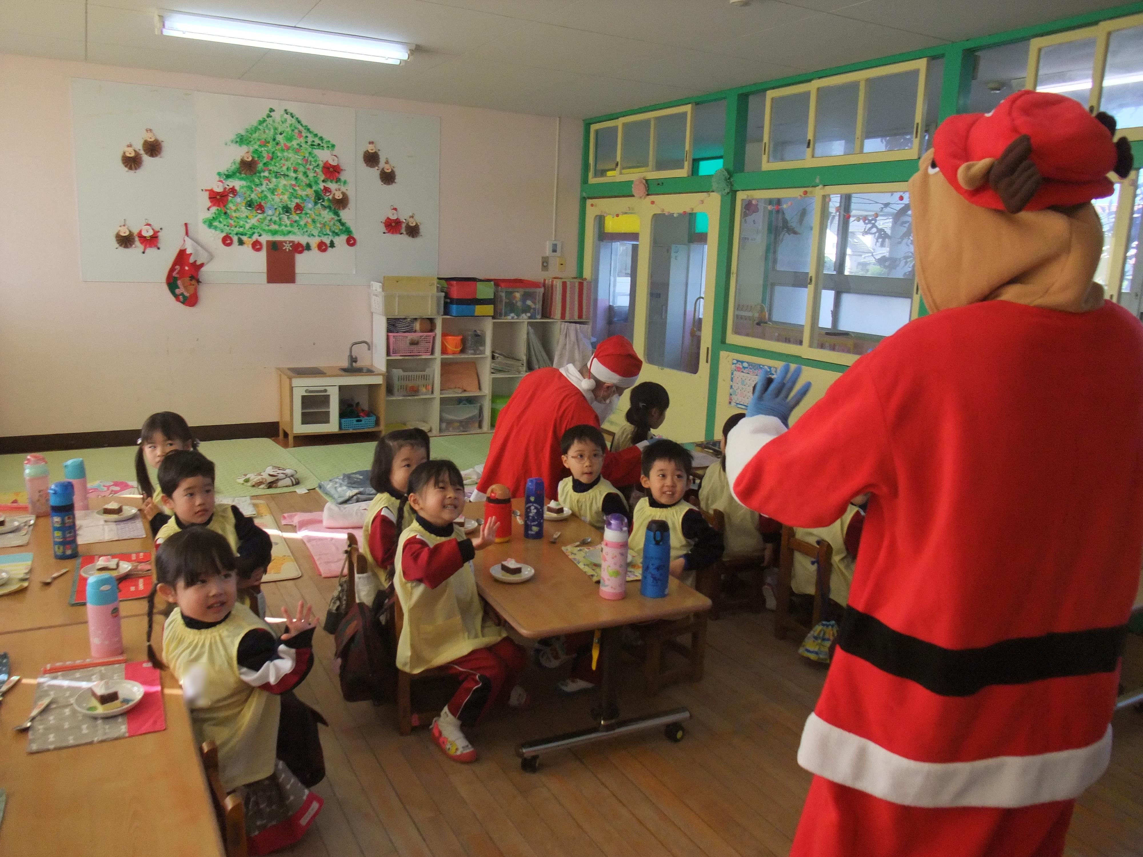 クリスマスケーキ 2021年12月20日(月) 今日の給食はクリスマスメニューです。 サンタさんとトナカイさんからケーキのプレゼントをいただきました。 「おいしいね!」ととても嬉しそうな子どもたち。 クリームを顔につけて、美味しそうにほおばっていましたよ。
