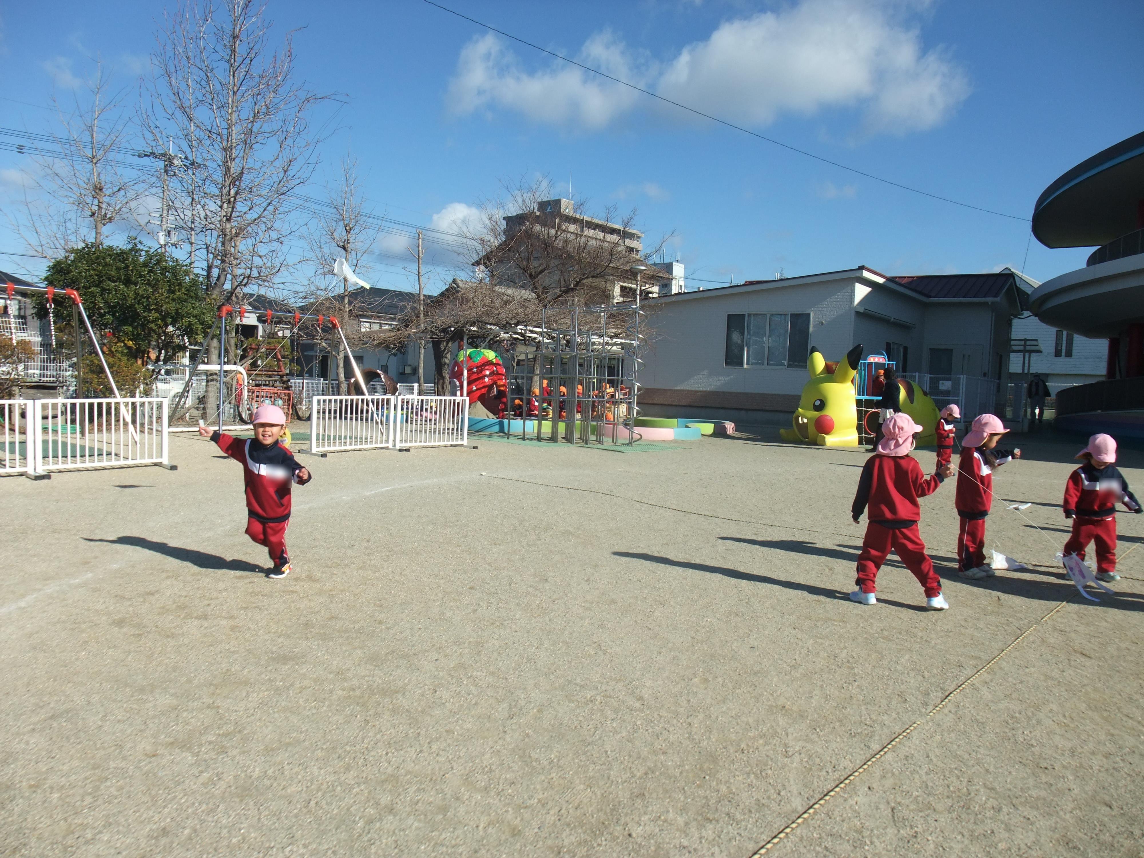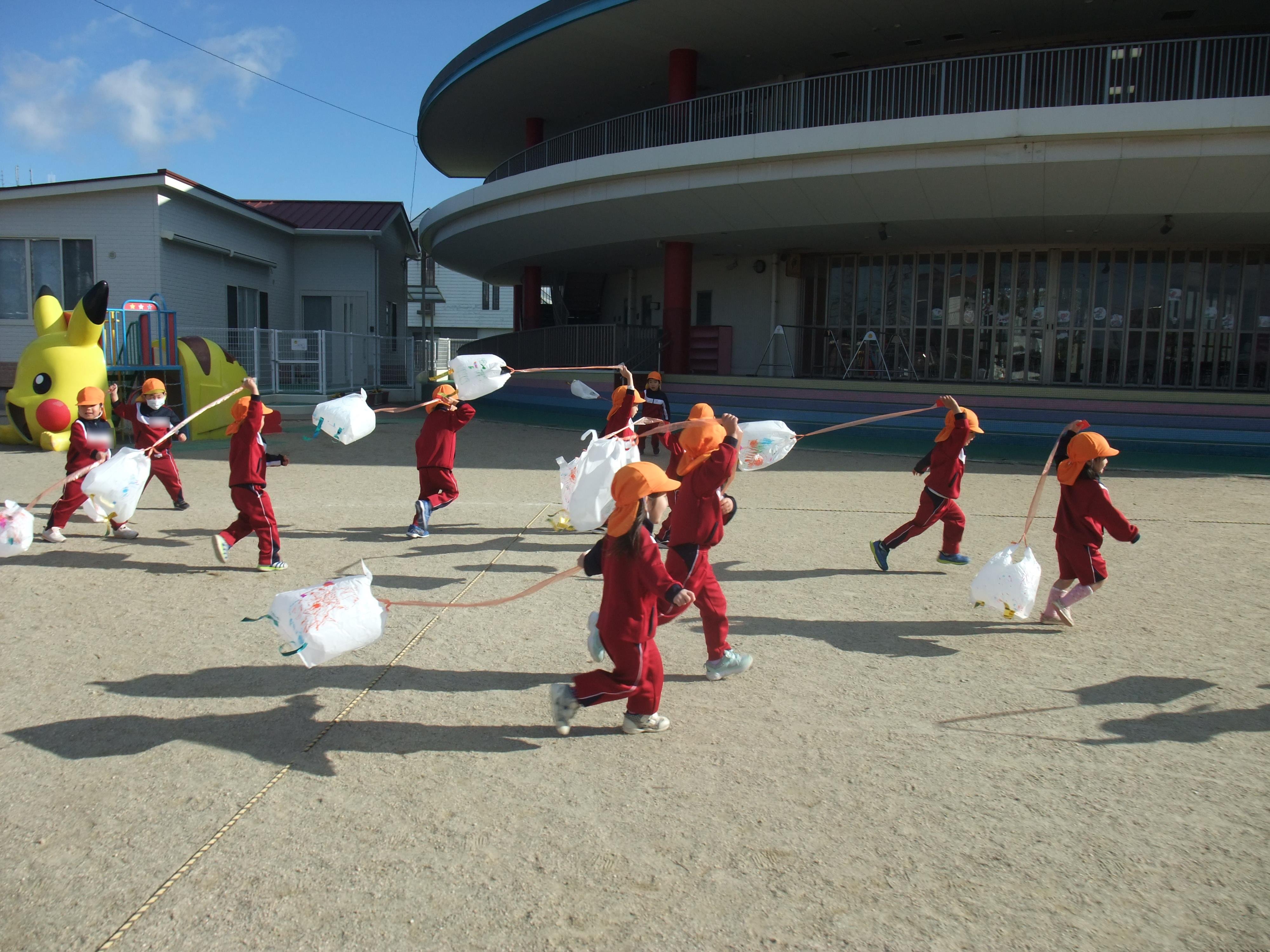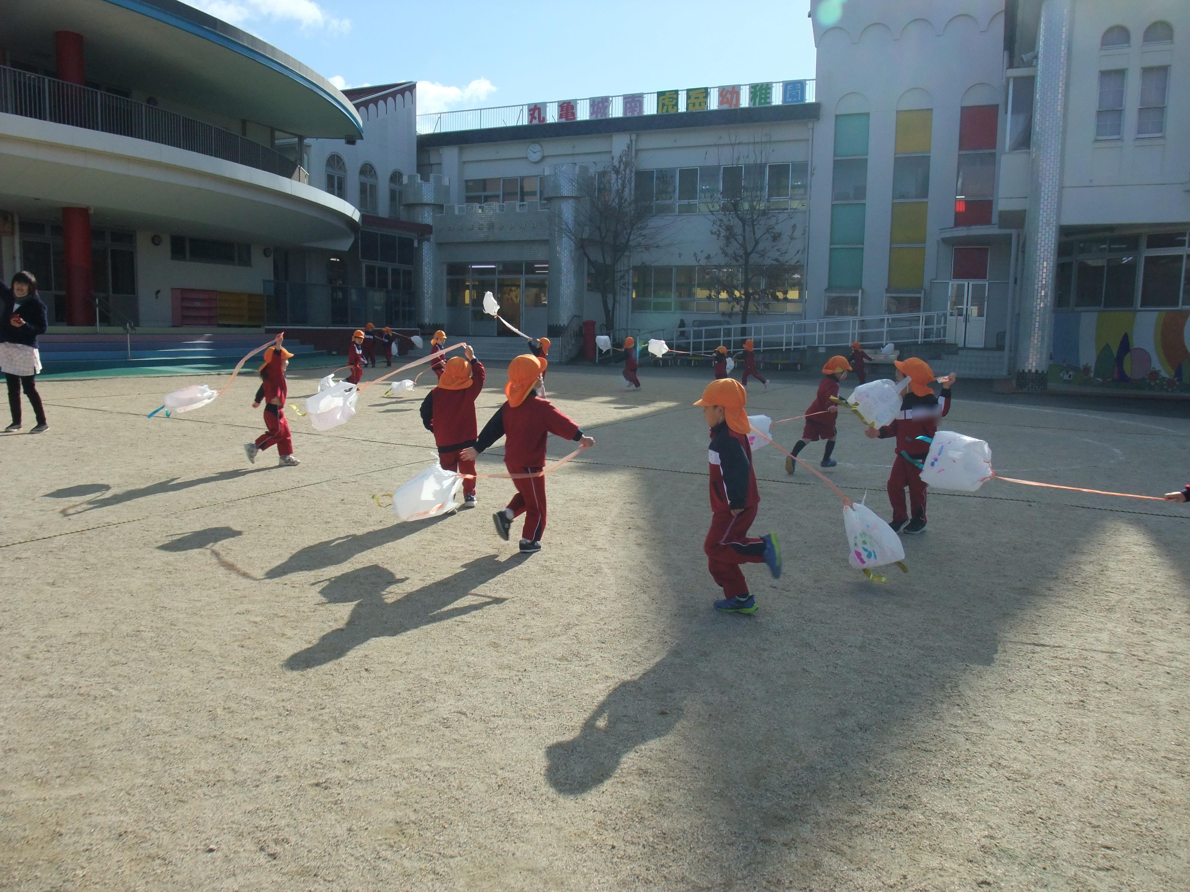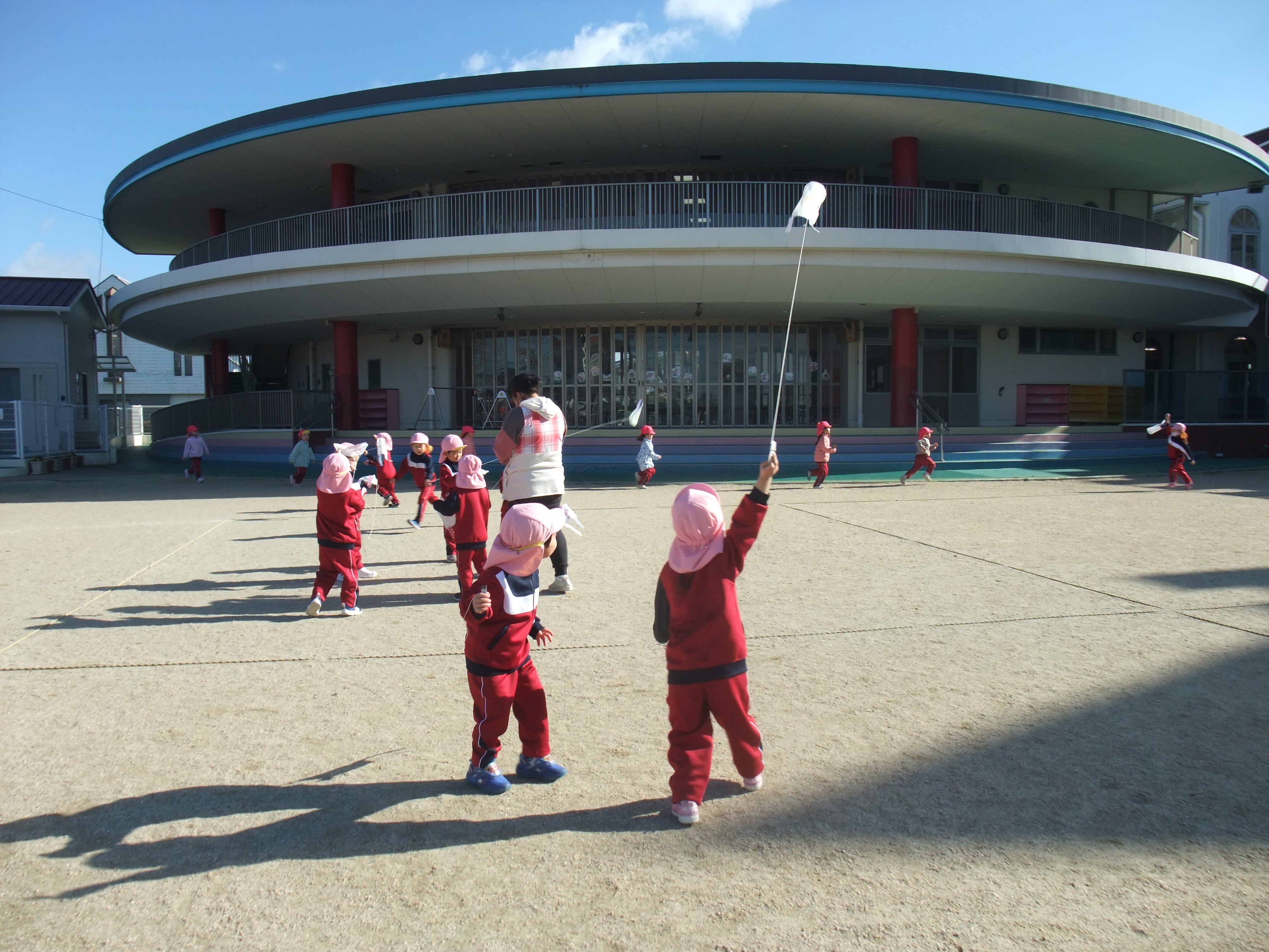 凧あげをしたよ 2022年01月14日(金) 3歳児クラスの子どもたちが、凧あげをしていましたよ。 北風がピューピューと強く、風を受けて高く上がっています。 「かぜがね、ぼー!!ってね、いってる!」と、嬉しそうに凧を持ってかけまわっていました。