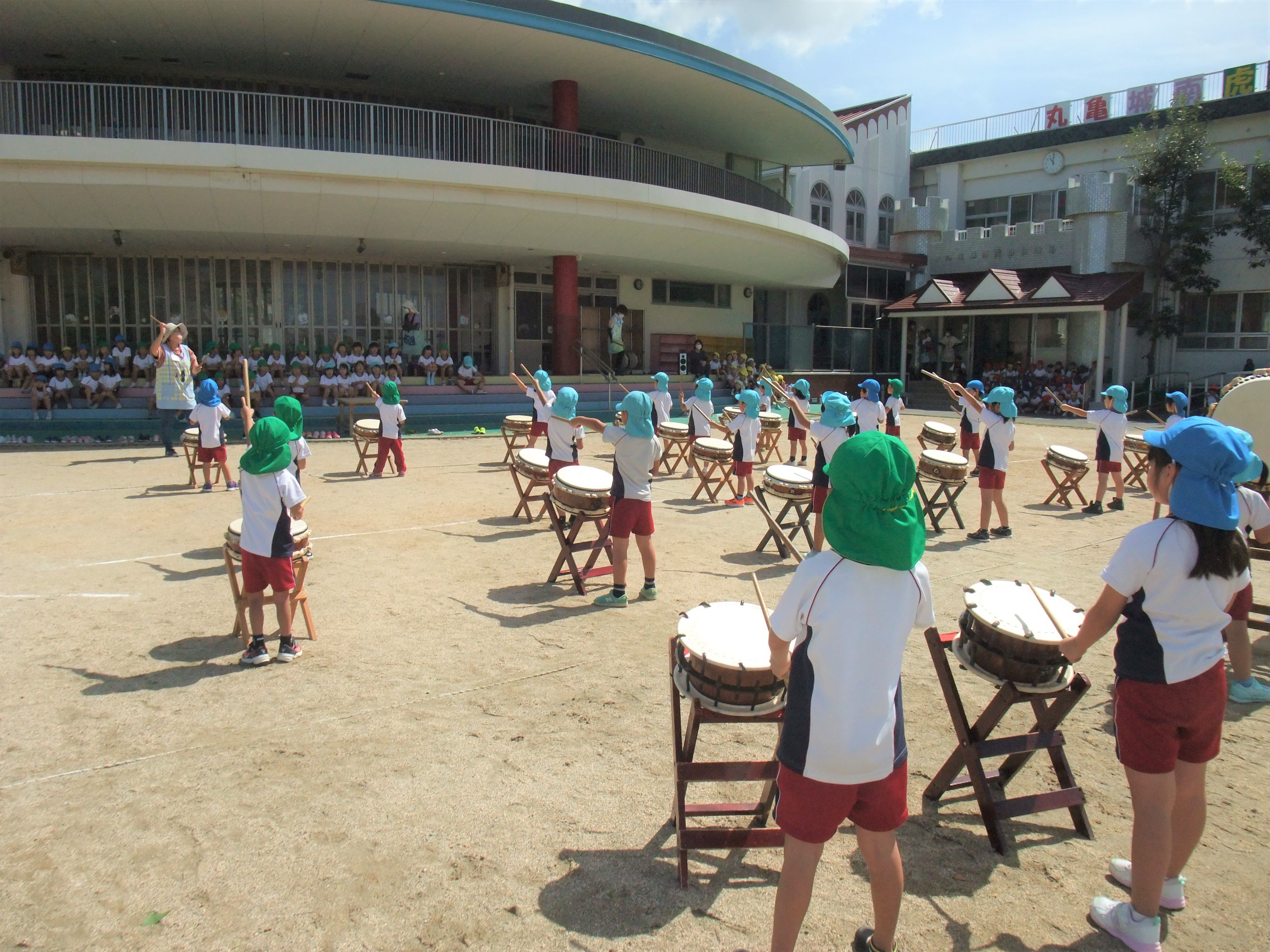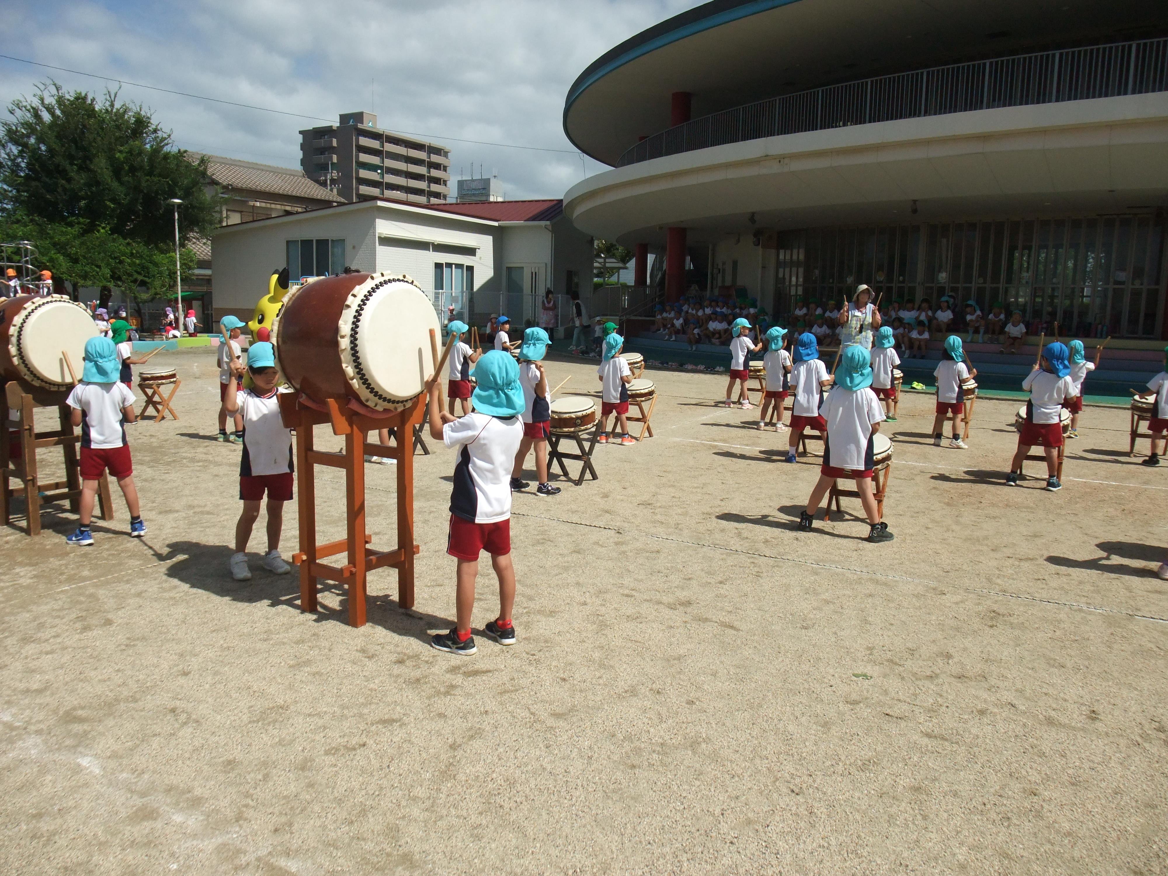 和太鼓演奏(年長児) 2022年09月20日(火) 年長組の子どもたちが和太鼓を演奏しています。 力強い音に、他学年の子どもたちも興味津々ですよ。 来週は、いよいよ運動会。 お家の人に見てもらうのが楽しみですね!