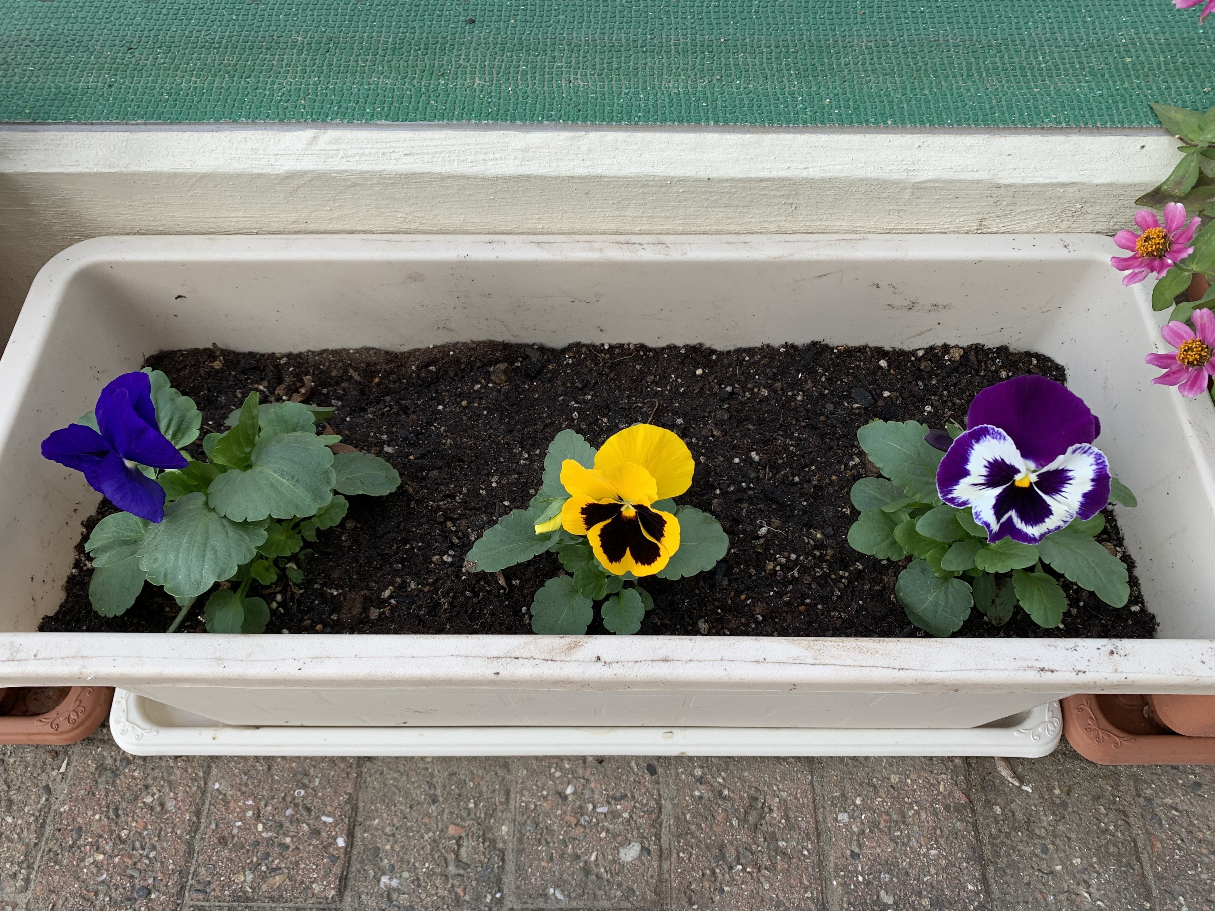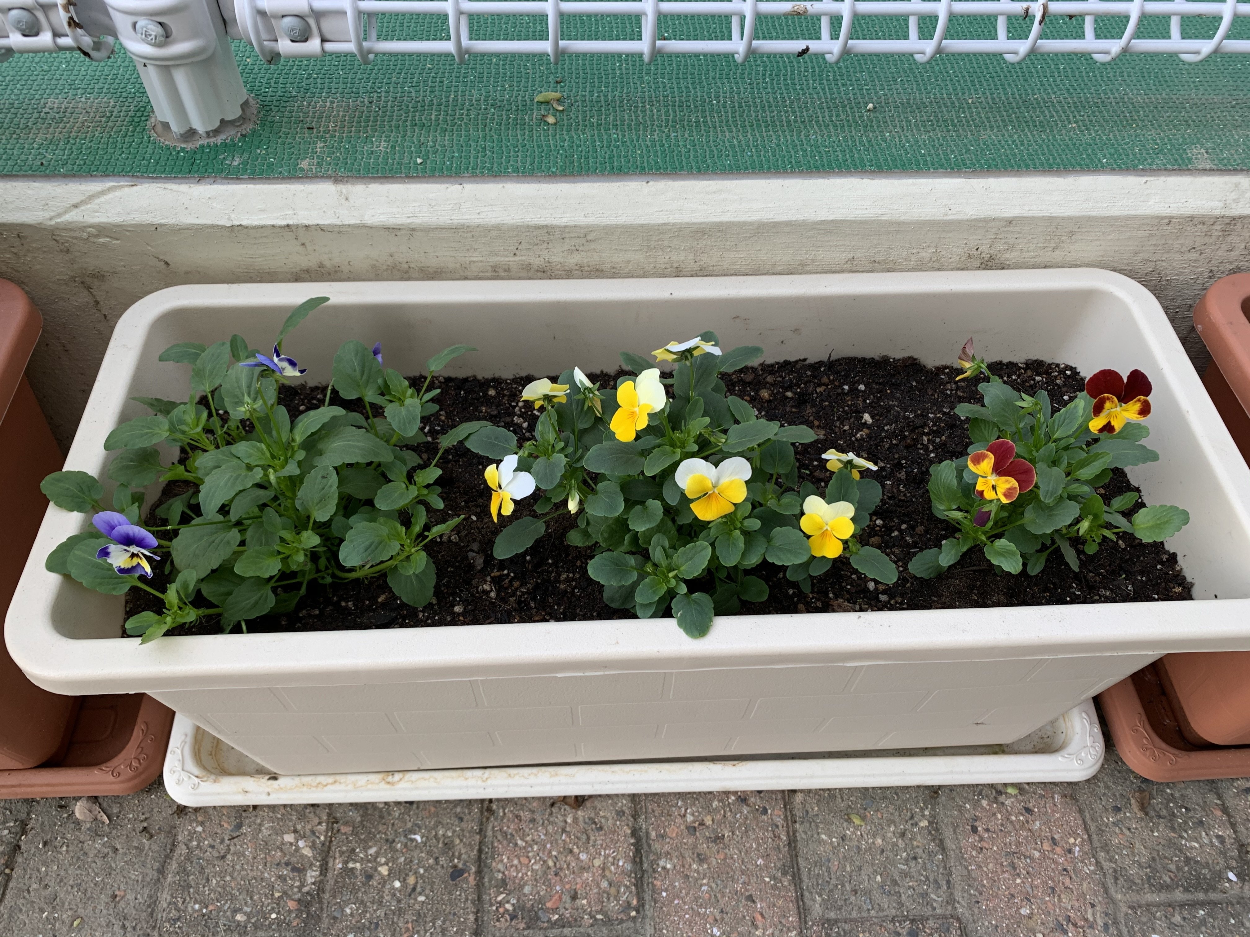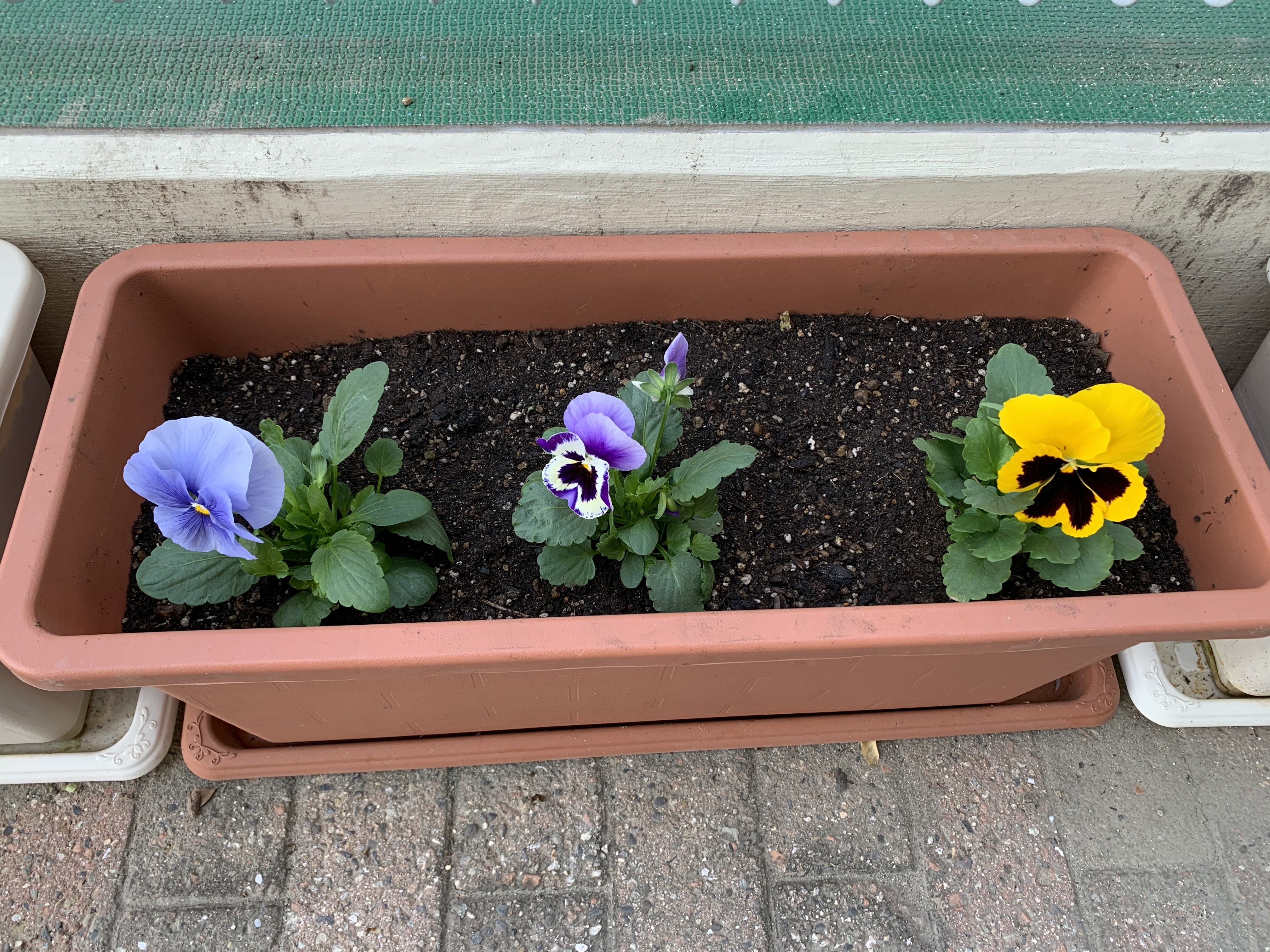 パンジーとビオラを植えました。 まだ見えていませんが、後方の土にはチューリップの球根が隠れています。 芽を出す日が楽しみですね。