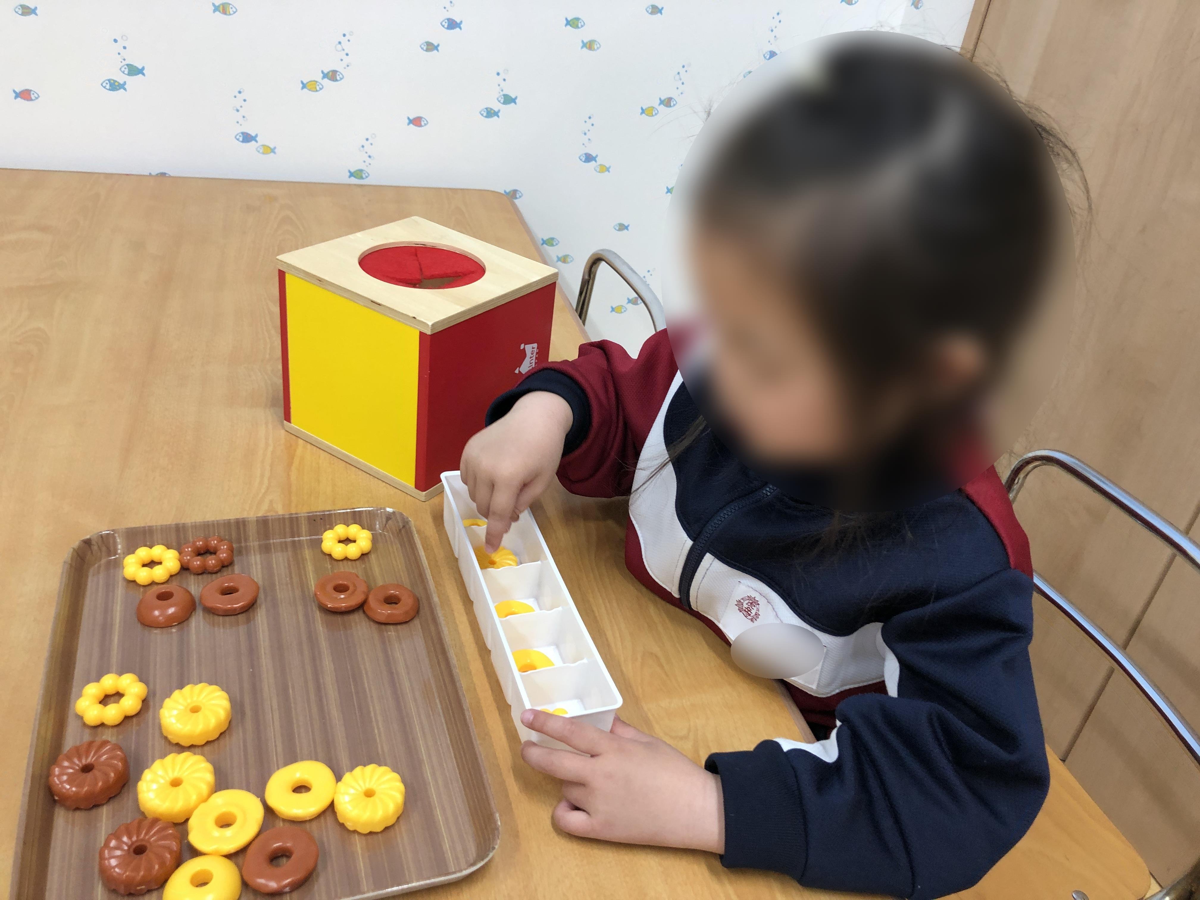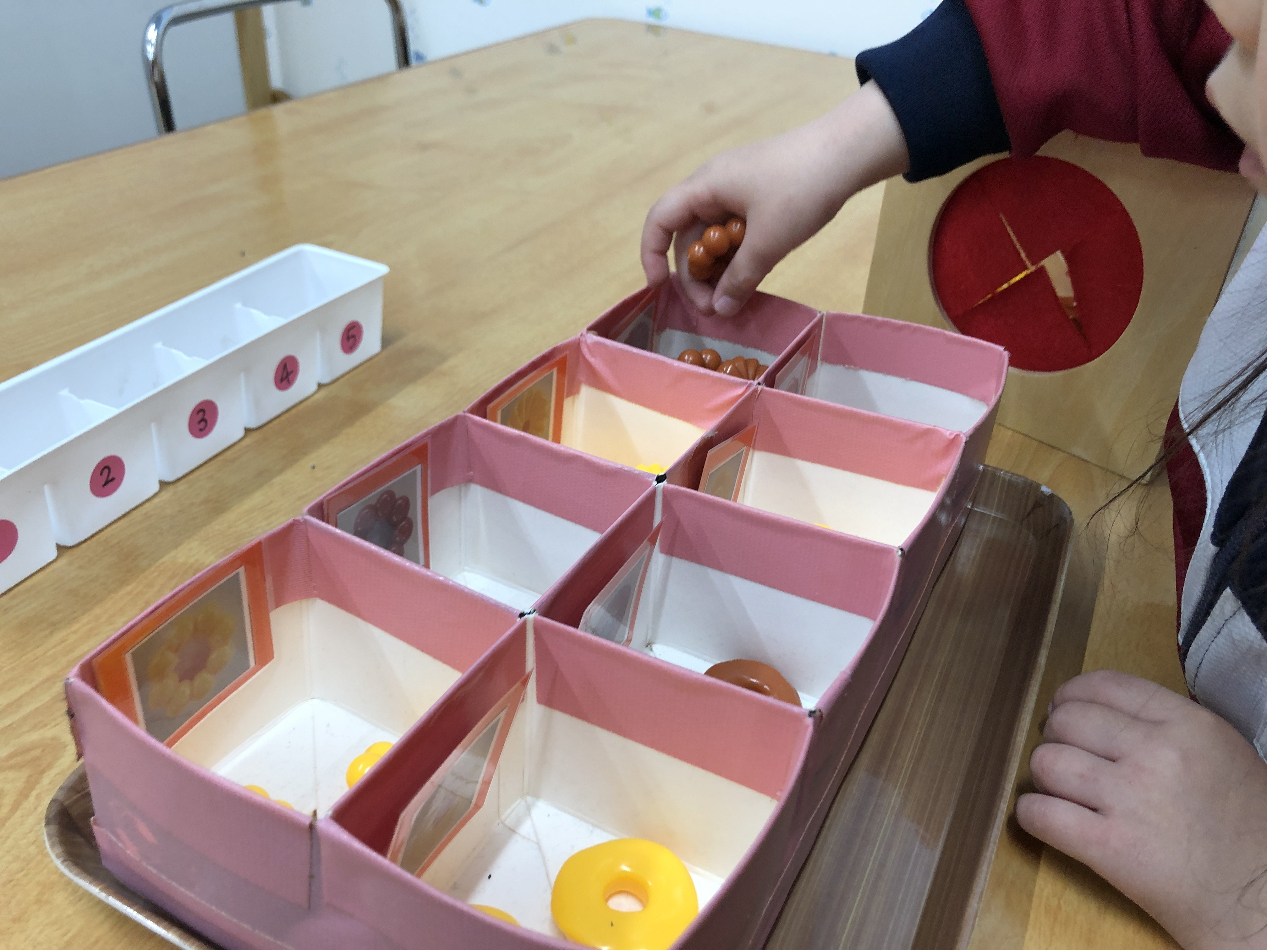 かわいいドーナツ屋さんがオープンしました。 品物ごとに分けたり、数を数えたり・・・。 「おいしいドーナツはいかがですか?」