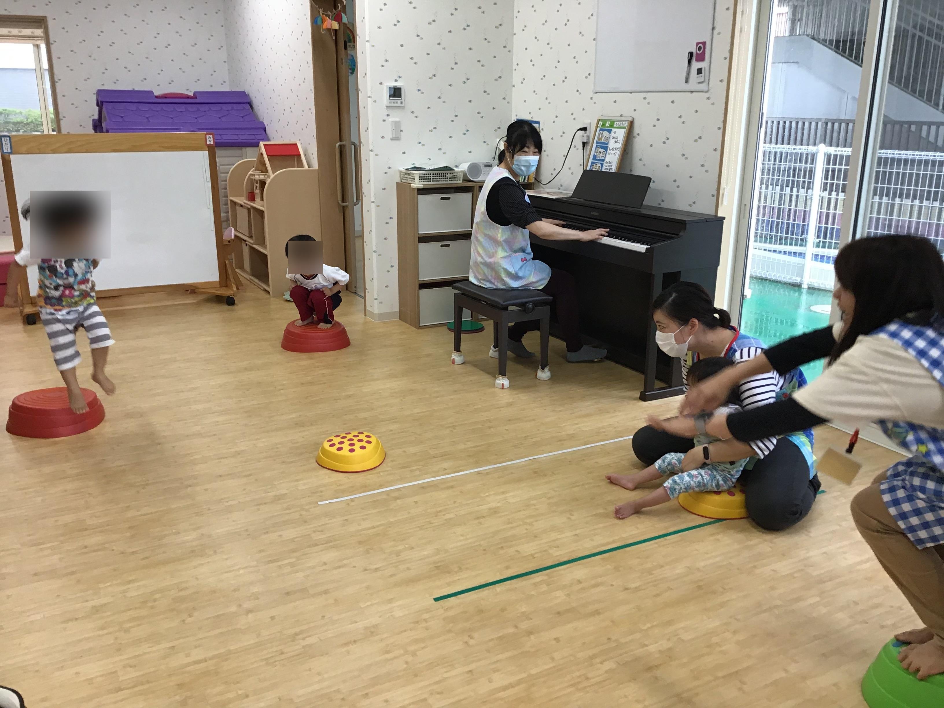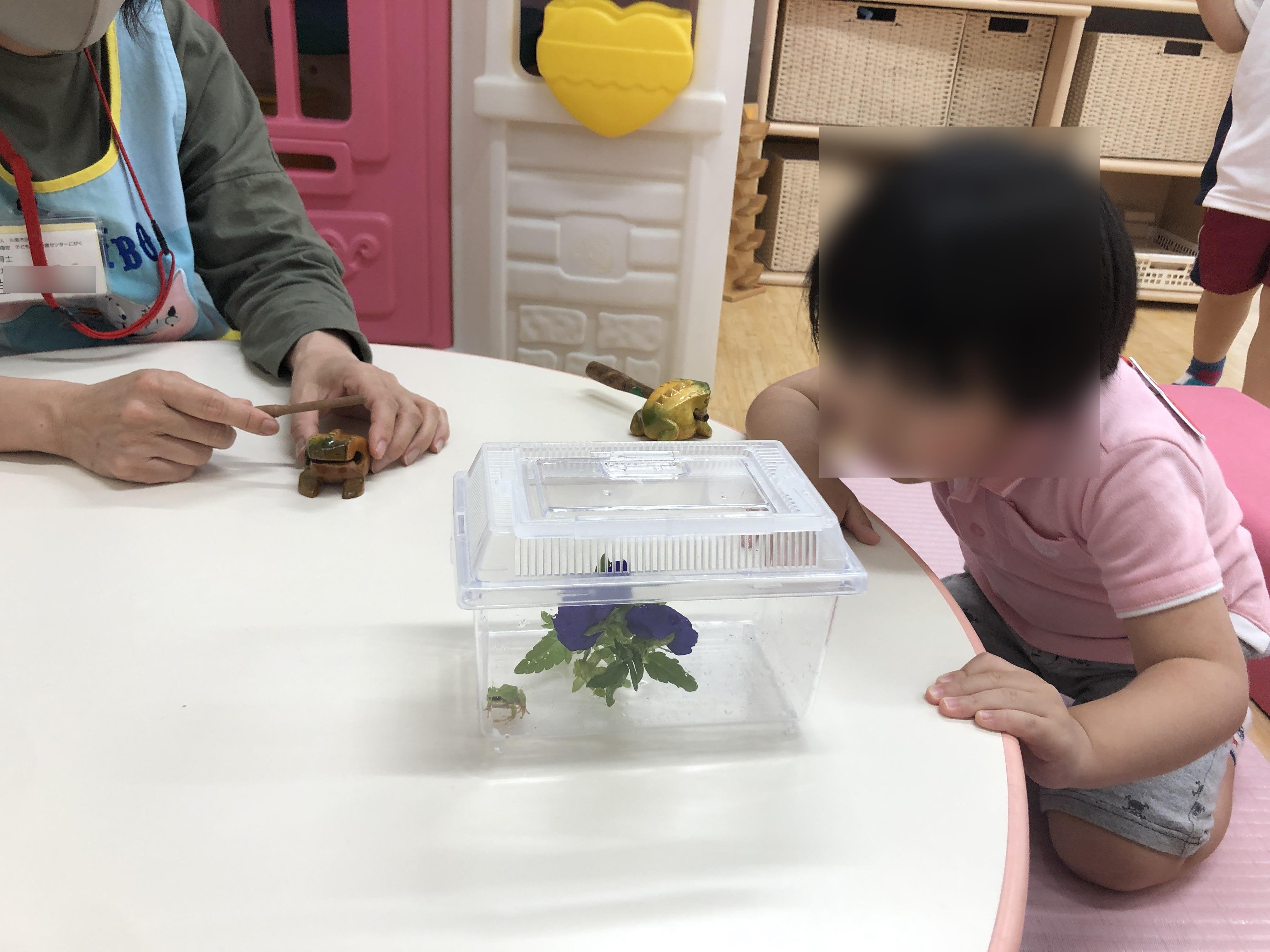 カエルになってピョンピョンピョン 2021年06月04日(金) 雨の日の生き物とたくさん出会う季節になりました。 支援センターにもカエルさんがやってきましたよ。 どこどこ? カエルになって、跳んでみよう!