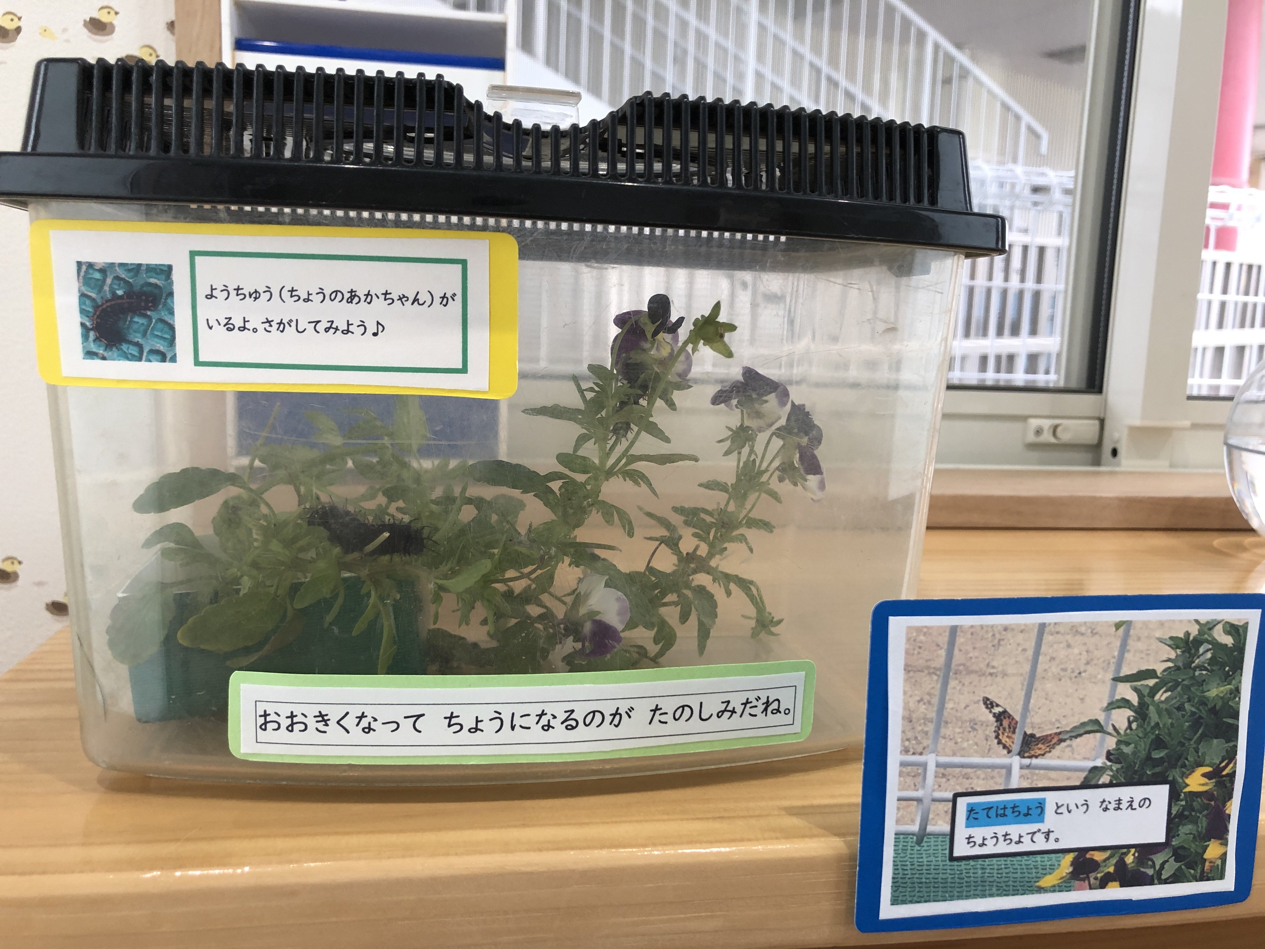飼育日記 2021年06月10日(木) 支援センター玄関にある飼育コーナー。 カエルやかたつむりと一緒にいたタテハチョウの観察日記です。 〇5月28日(金)幼虫がやってきました。 〇6月1日 (火)さなぎになりました。 〇6月10日(木)ちょうちょになりました!