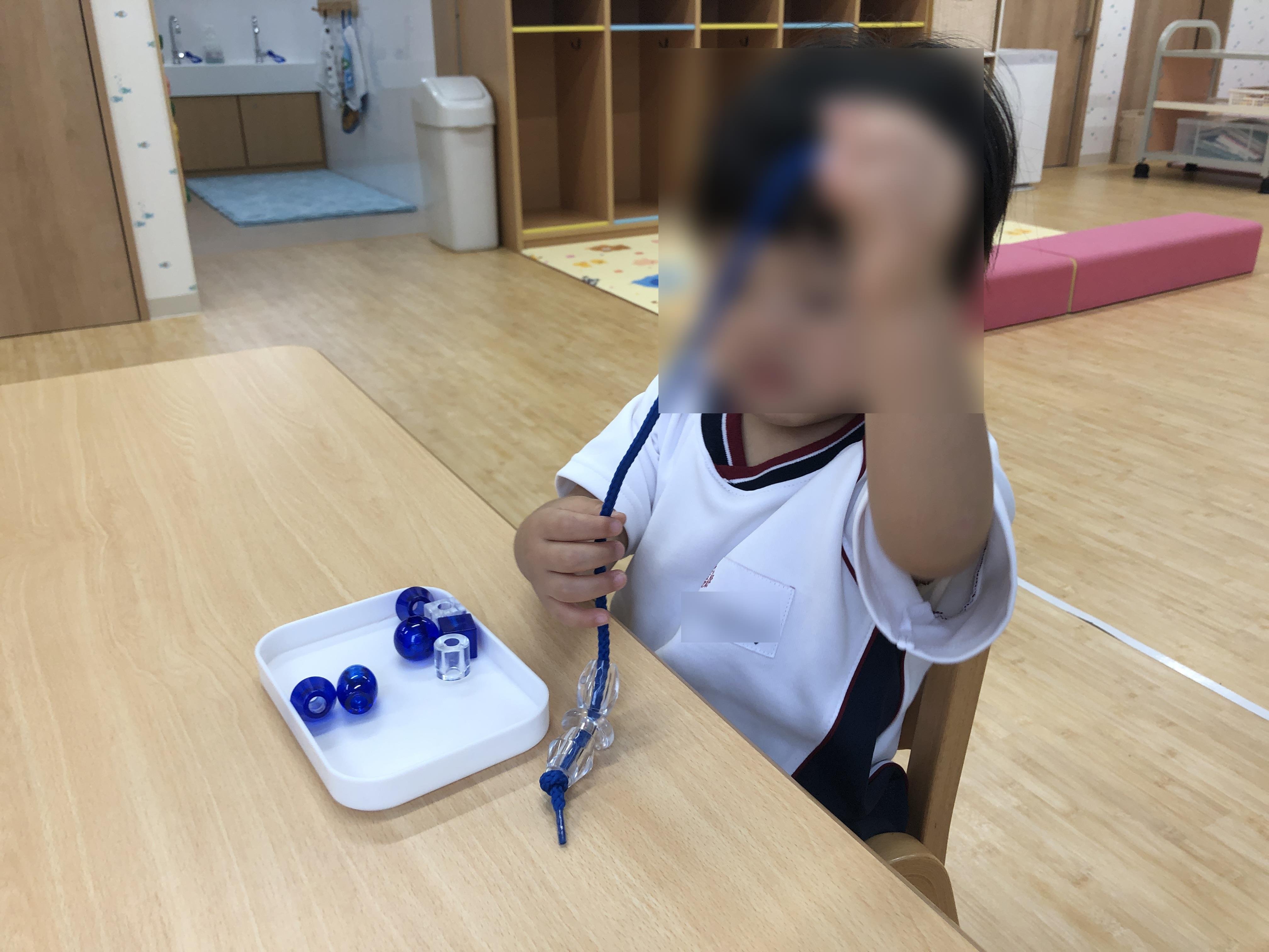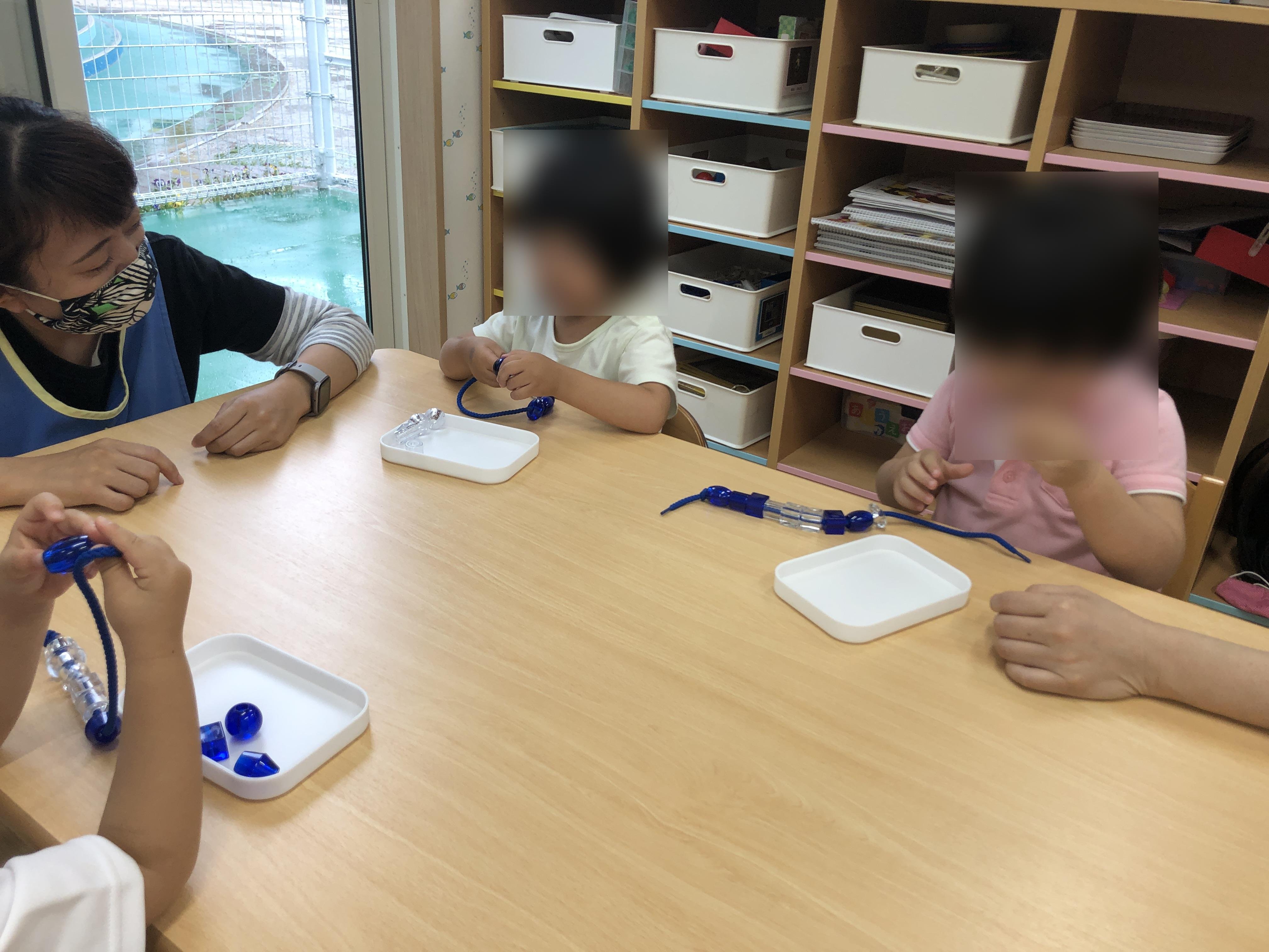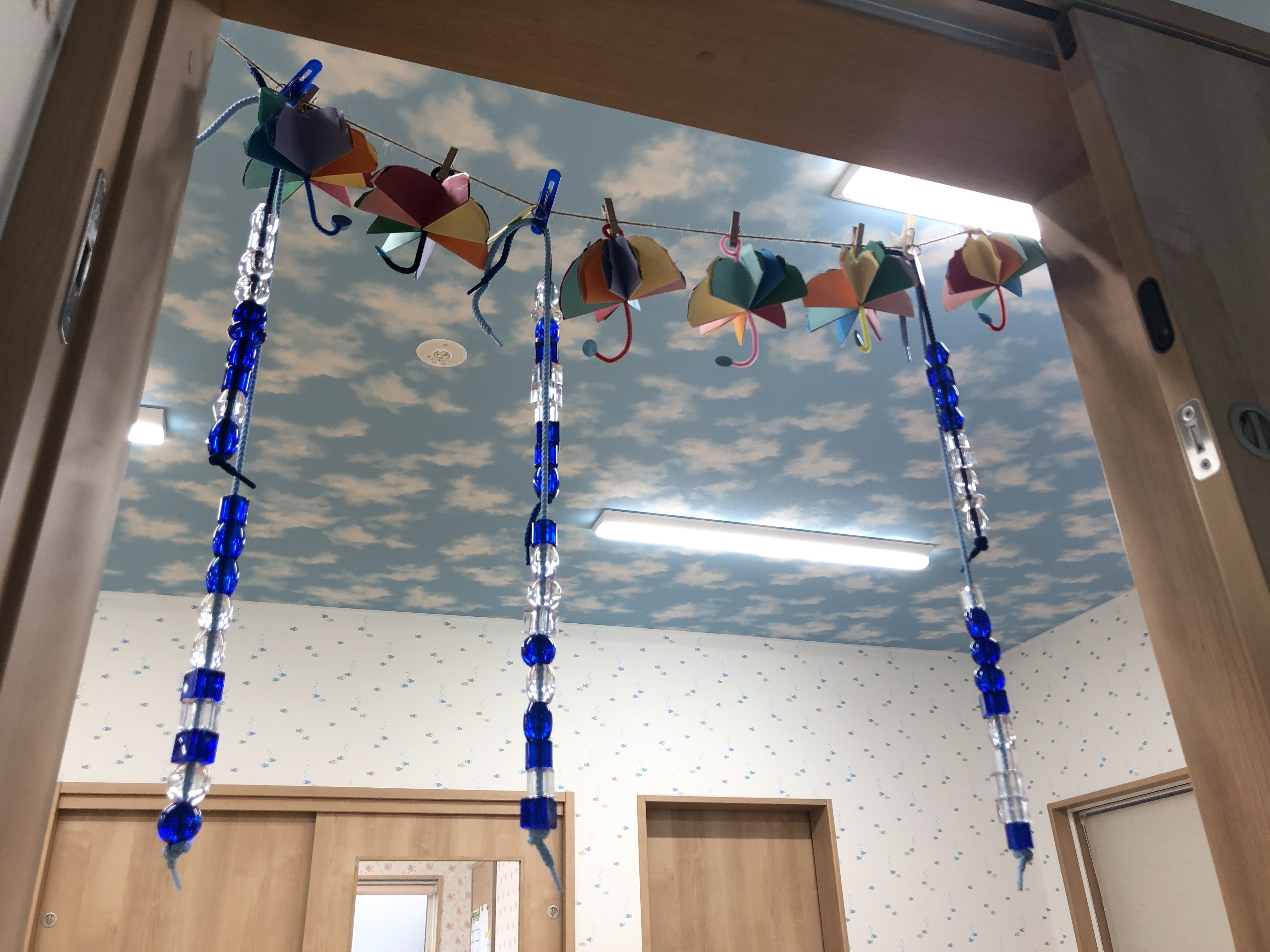 きらきら雨が降ってきました 2021年06月17日(木) おなじみのひも通しも、素材を変えると季節感あふれる作品になります。 今日は、ブルーとクリアの色づかい。 真剣なまなざしです。 入り口に飾ってみました。