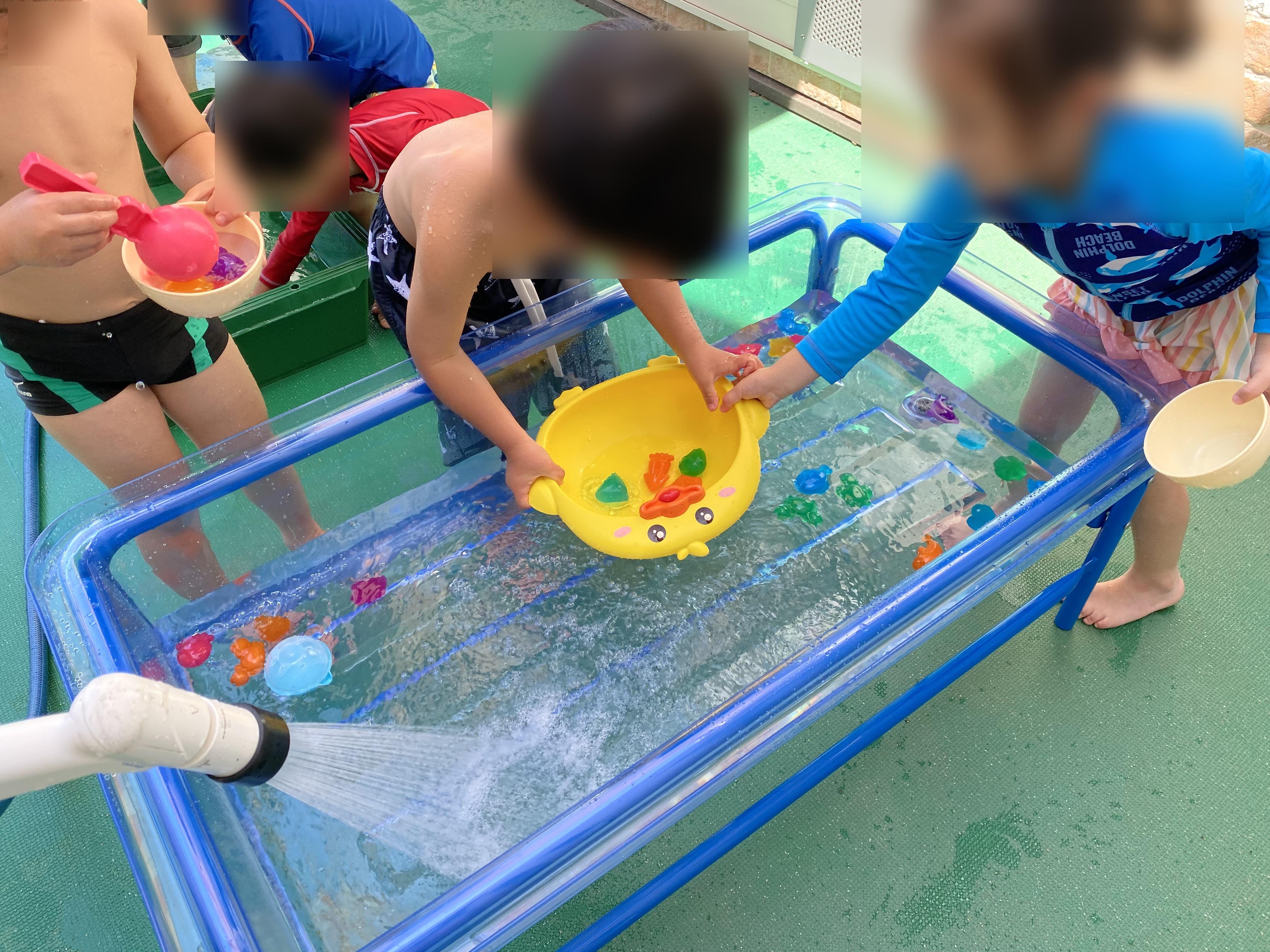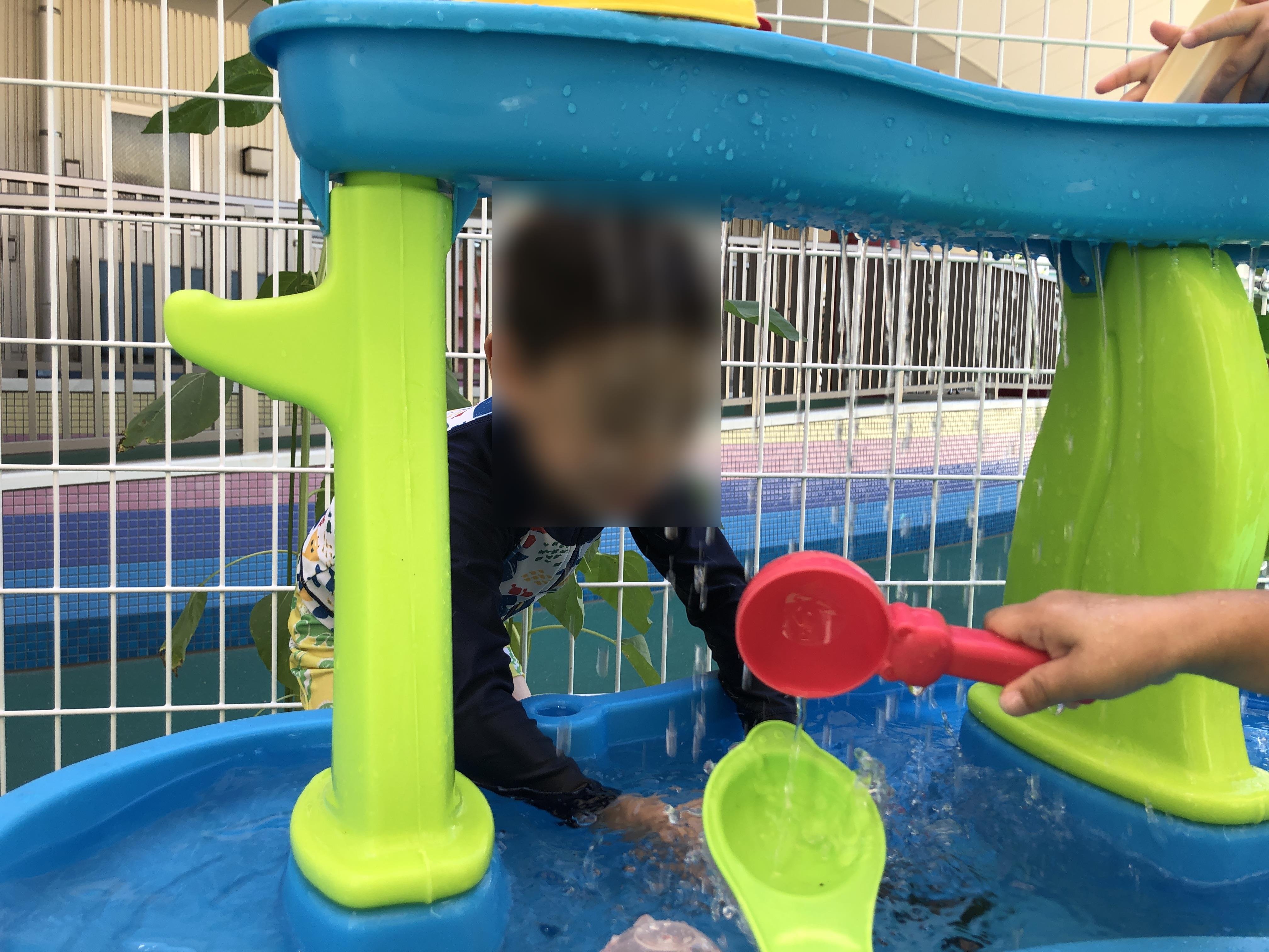 夏休みが始まりました 2021年07月19日(月) 天気の良い日は、支援センターテラスで水遊びを楽しんでいます。 遊びの中で、水感触や友達との触れ合いをしっかり楽しんでほしいと思います。 これ、かしてね。 雨が降っているみたい!