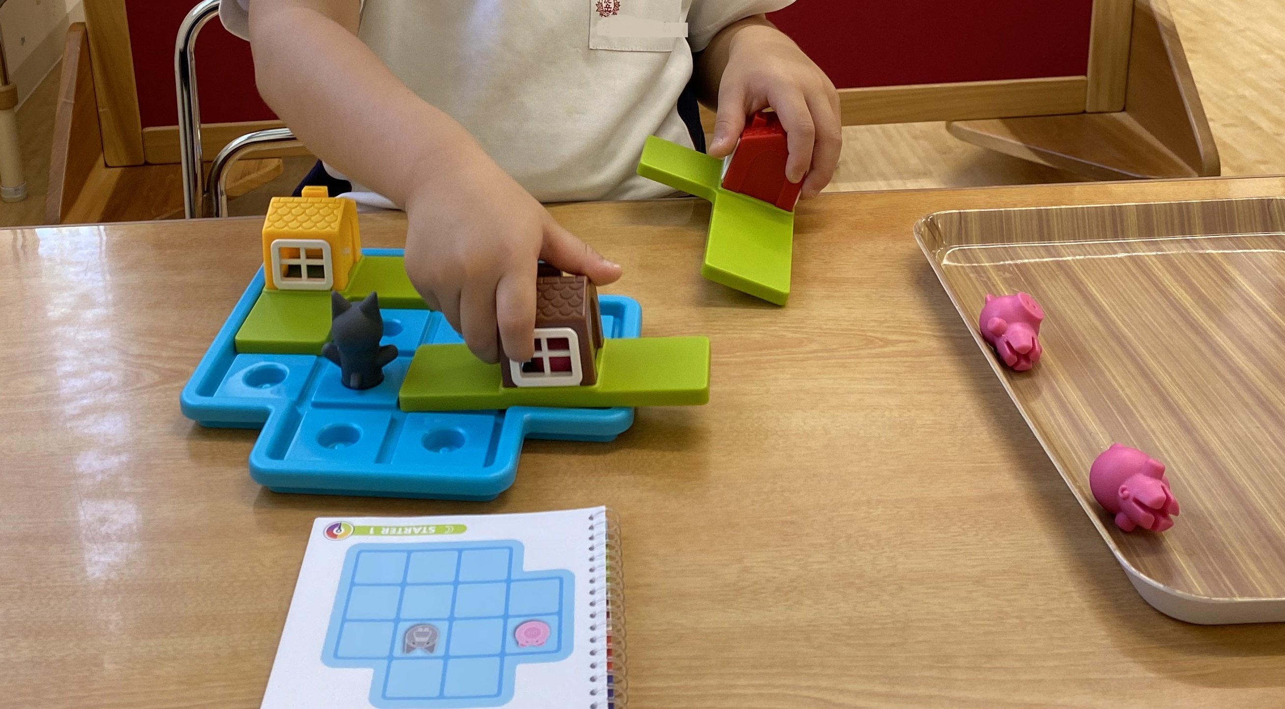 3匹のこぶた 2021年07月26日(月) 子どもたちに大人気の物語を題材にしたゲームです。 おおかみから逃げるため、こぶたがおうちに入ります。 空間把握やプランニングの力が必要で、大人でも楽しめます。