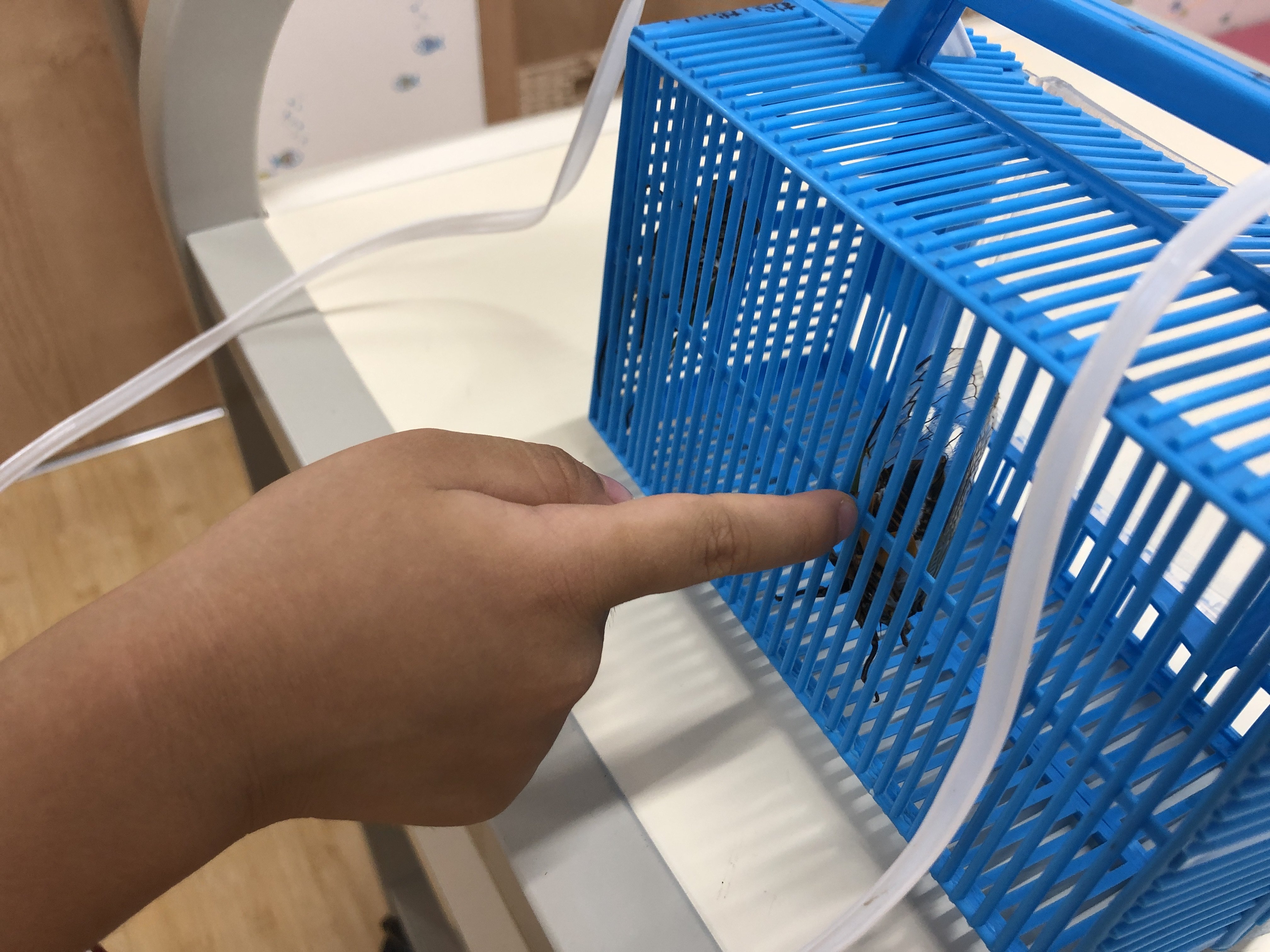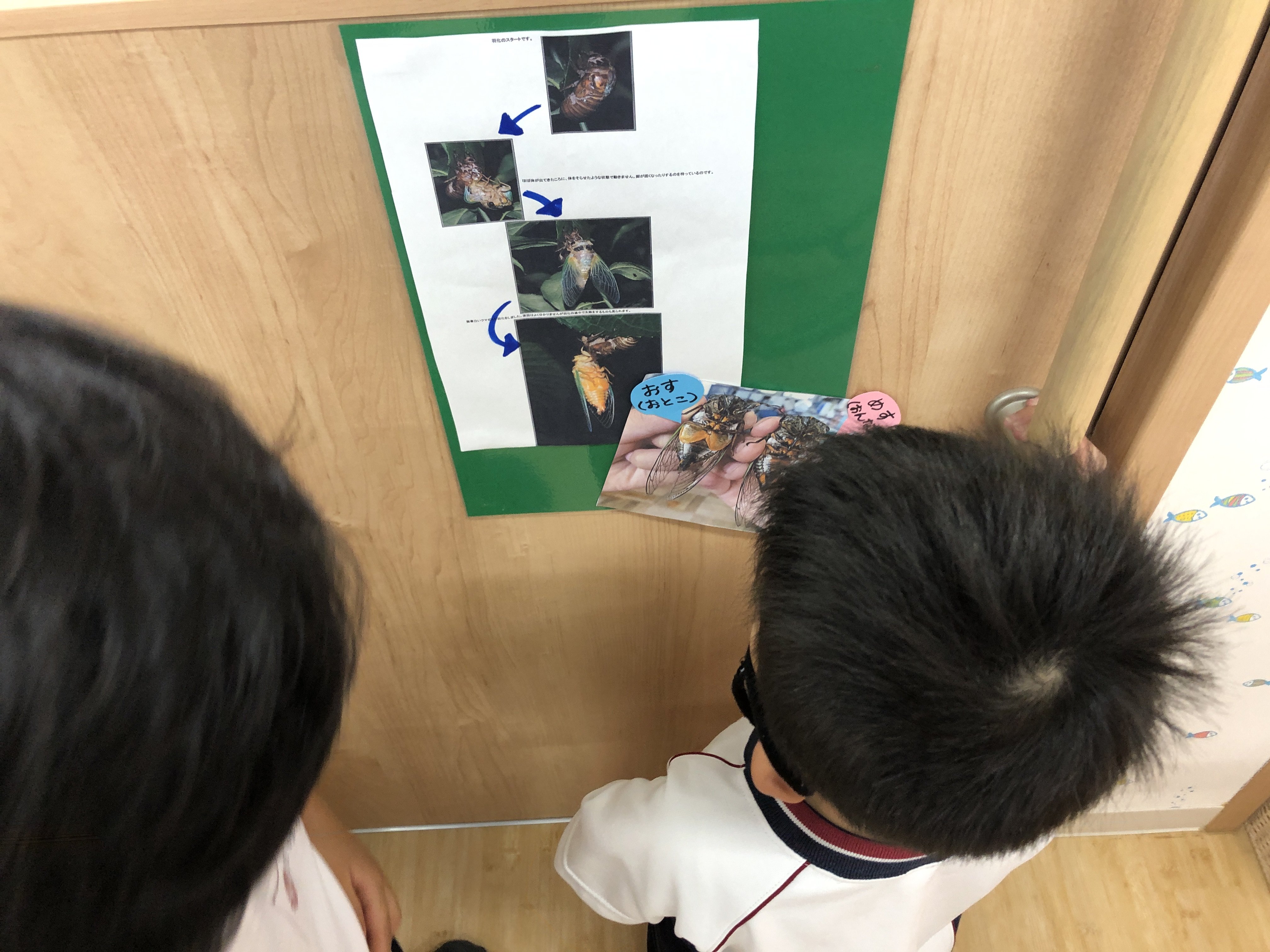 せみの抜け殻を見つけた子供たち。 動かないのはどうしてかなあ・・・。