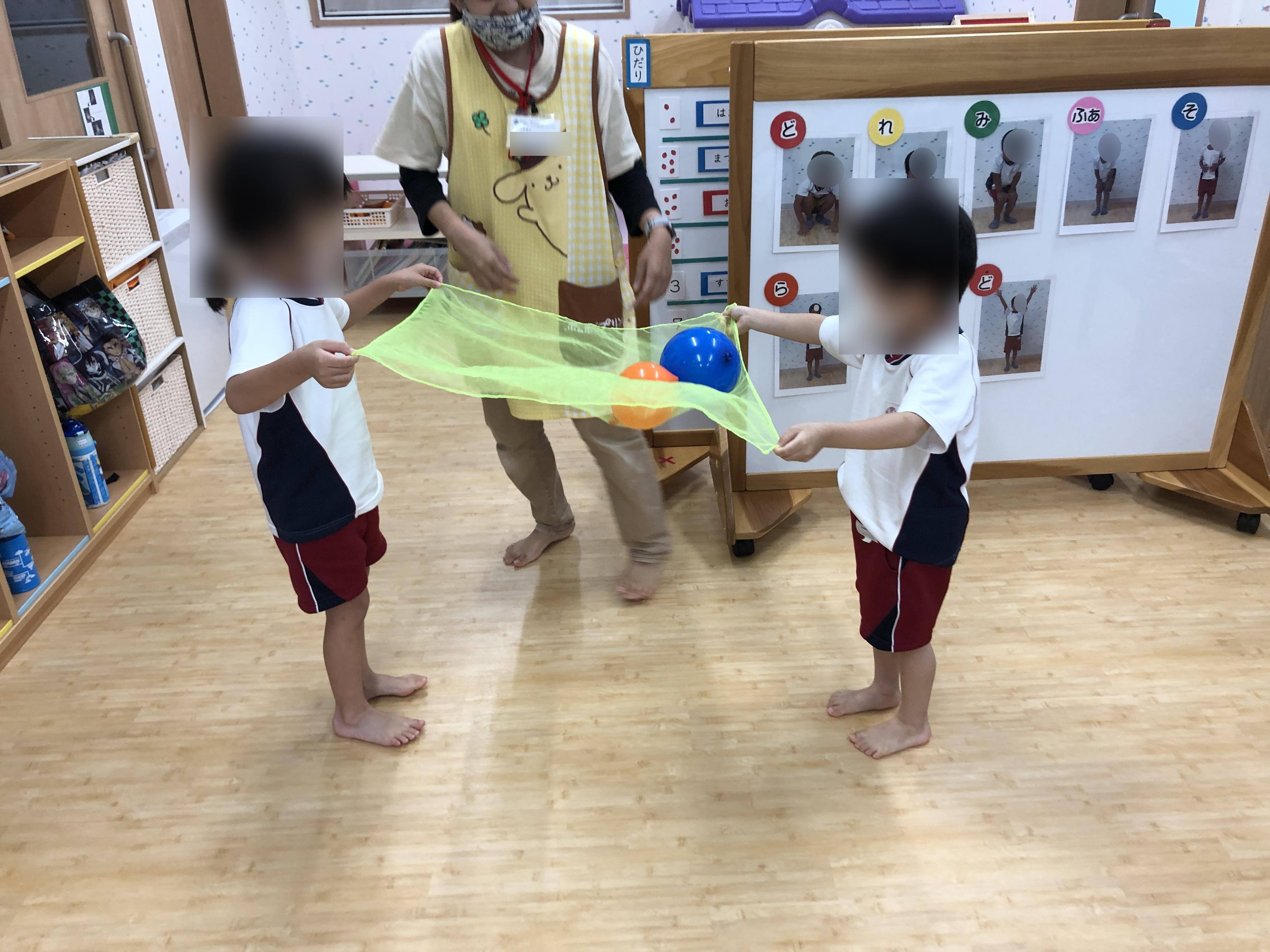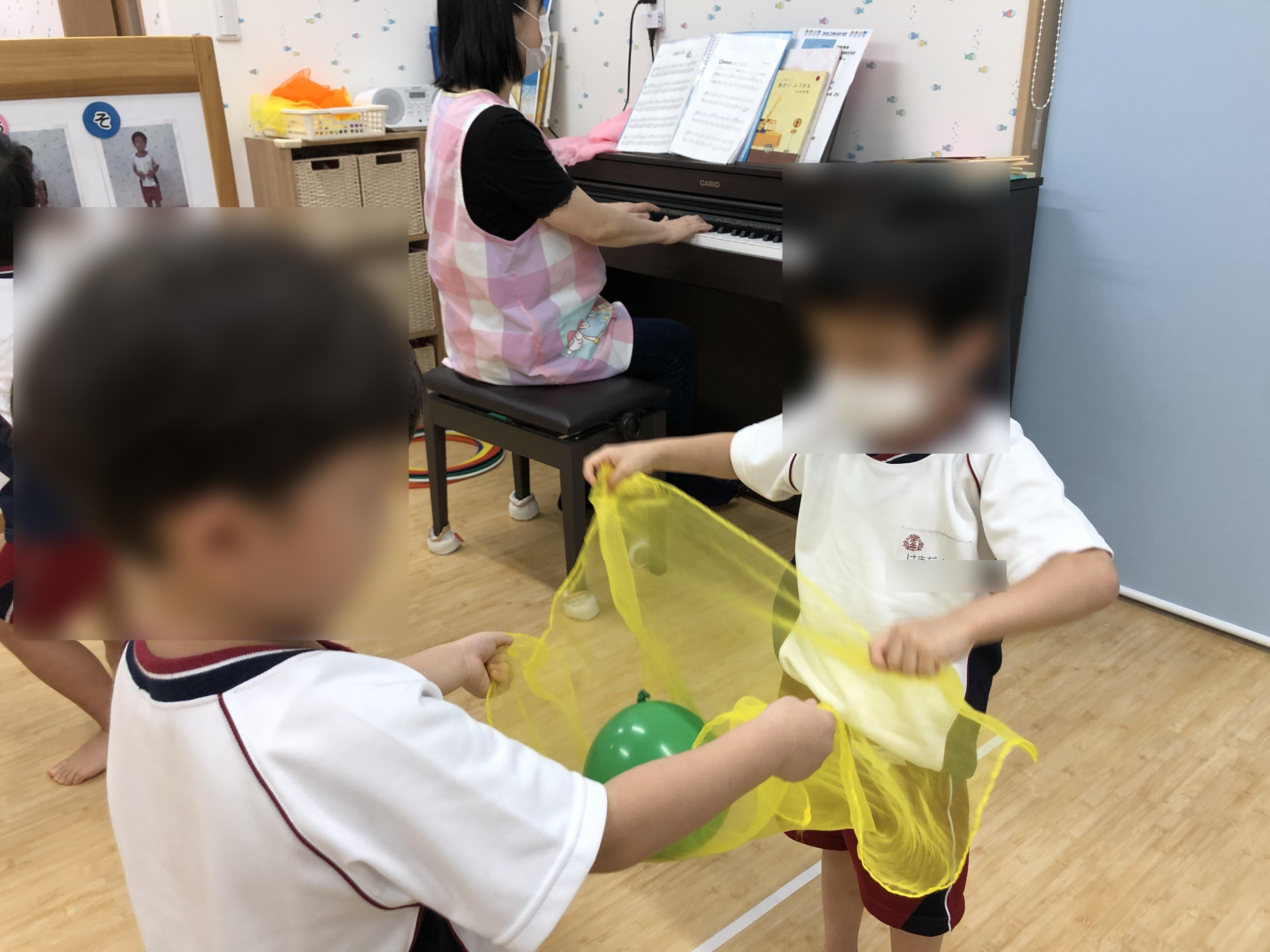 風船遊び 2021年08月20日(金) 今週のリトミックは、風船がテーマです。 音楽に合わせてシフォンを揺らしたり、友達と一緒に風船を運んだり。 ふわふわ風船を運ぶのは、力のコントロールや友達の動きに合わせるスキルが必要です。 しっかり持っていてね! ふ~わふ~わ!