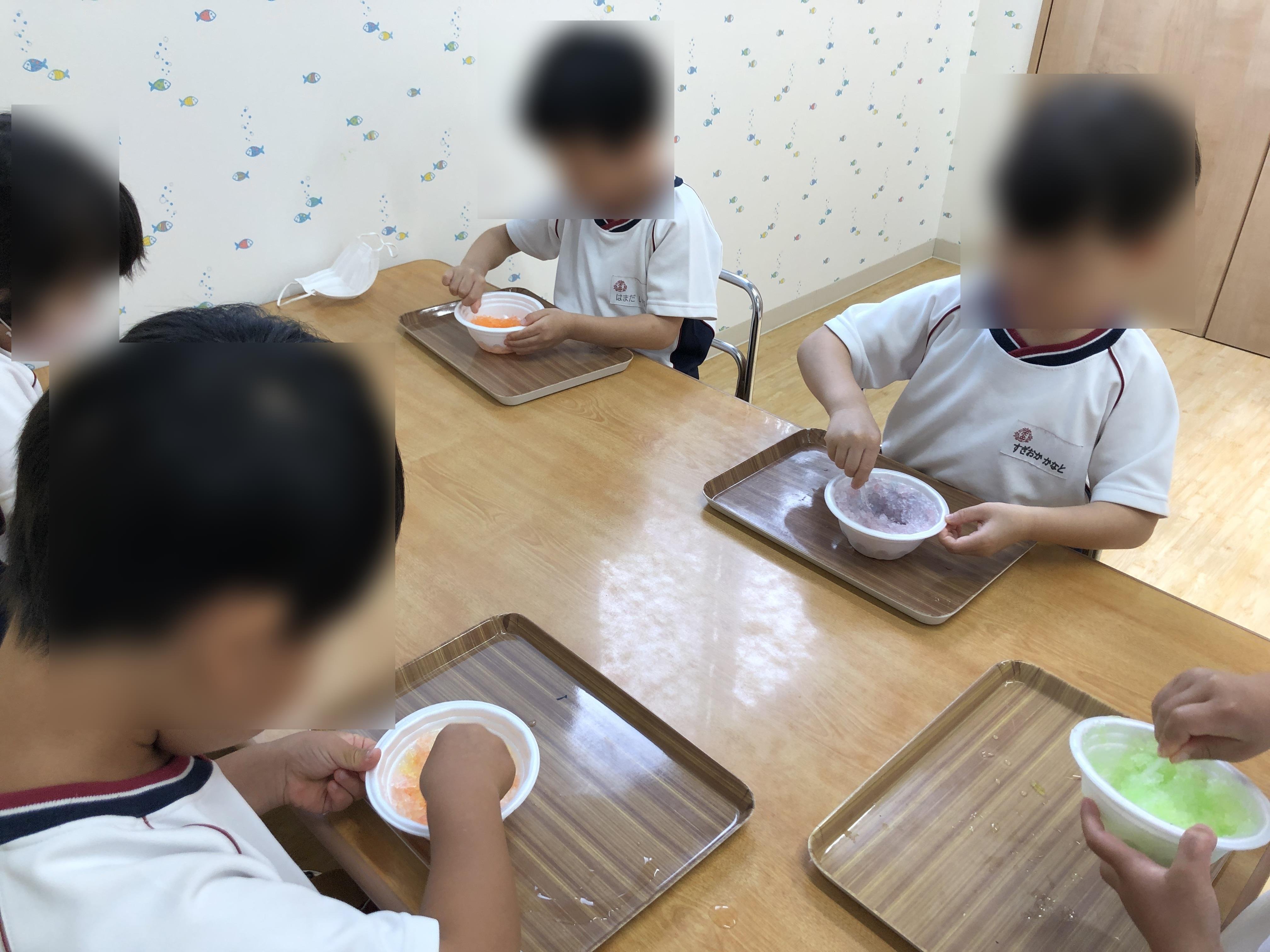 色遊び 2021年08月24日(火) 削った氷に色をまぜ、どんな色になるのか実験遊びをしています。 氷の感触と色がまざる楽しさに、子どもたちは夢中になって取り組んでいました。 何味にしようかな・・・ まぜまぜ~!どんな色ができるかな?
