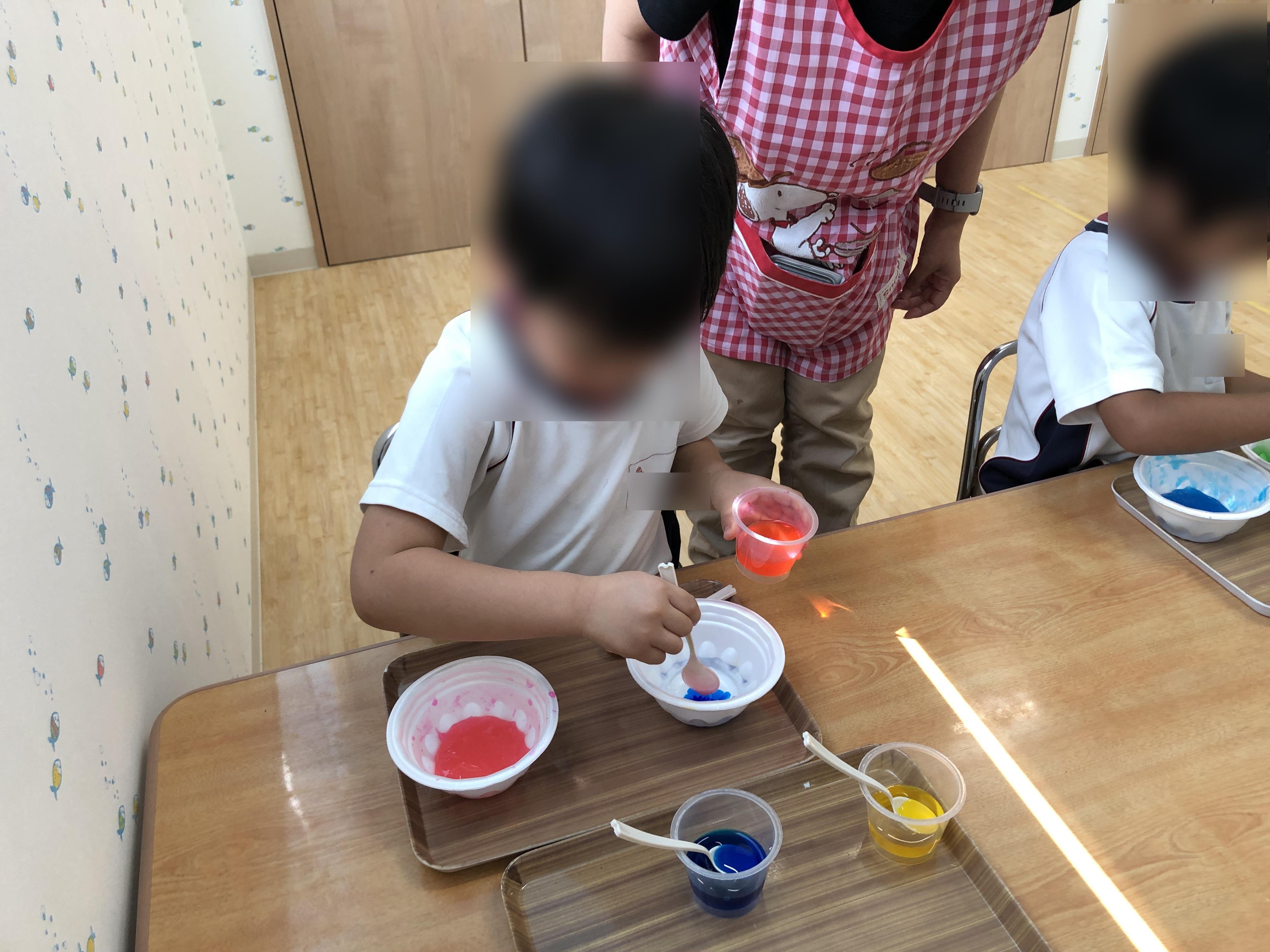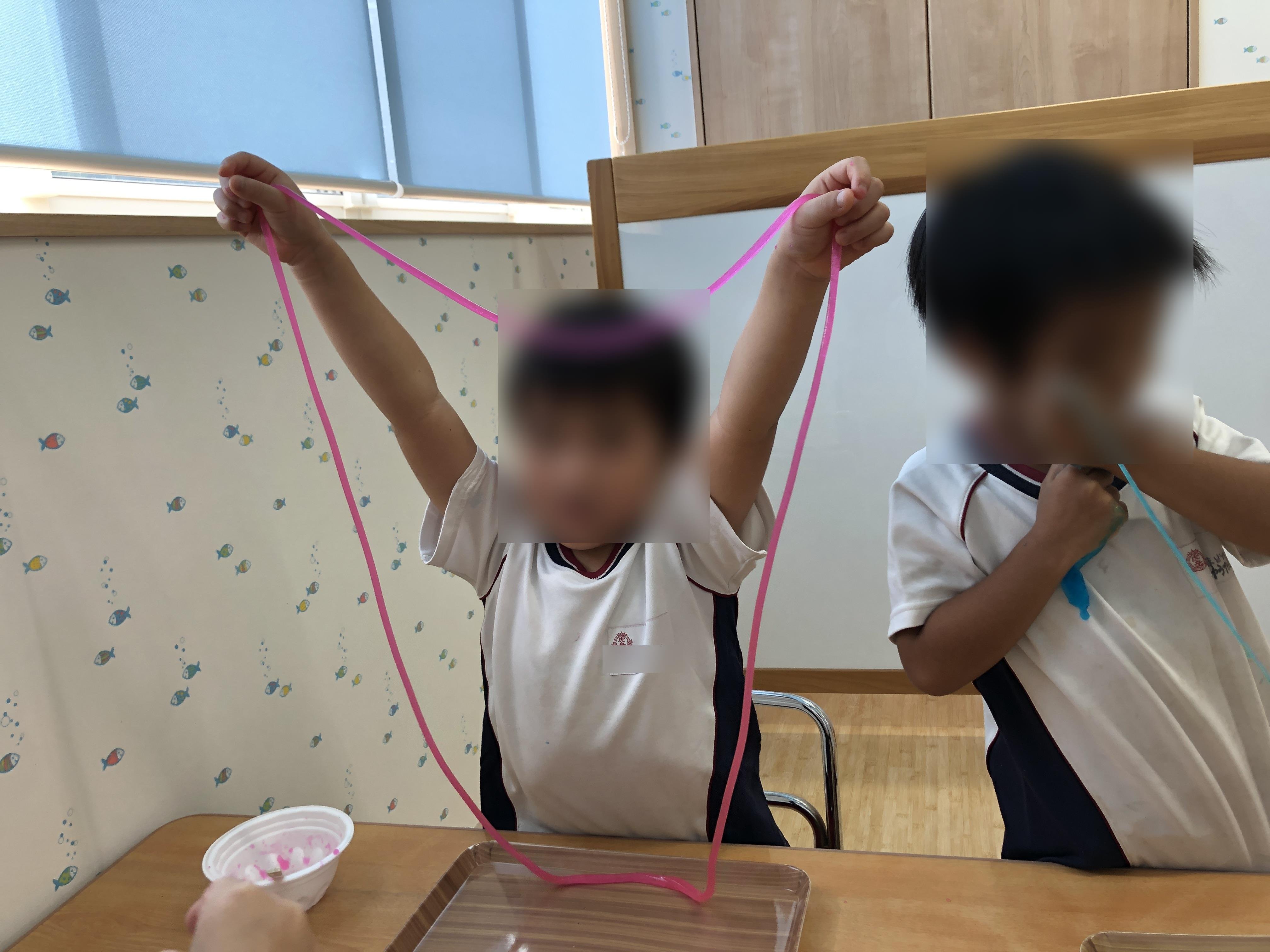 スライムを作ったよ 2021年08月31日(火) 色水あそびの応用で、スライム作りを楽しみました。 色水の量を変えてみたり何色かの色を混ぜてみたり・・・。 こぼさないように手元をしっかり見て取り組んでいました。 そーっと、こぼさずに・・・。 こんなに長くなったよ!