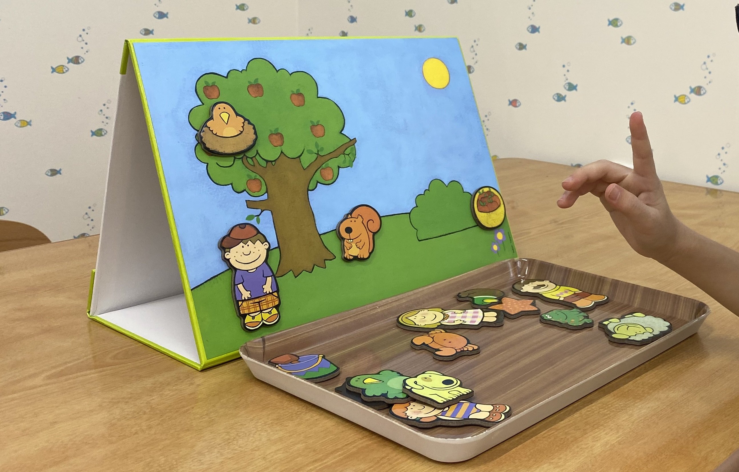 位置関係 2021年09月09日(木) 上、下、右、左という位置を表す言葉を知っていても、実際に配置することは苦手な子どもが多いようです。 この教材は、素材がマグネットになっているので、パズル感覚で楽しめます。 ことりさんの巣は、枝の上だね。