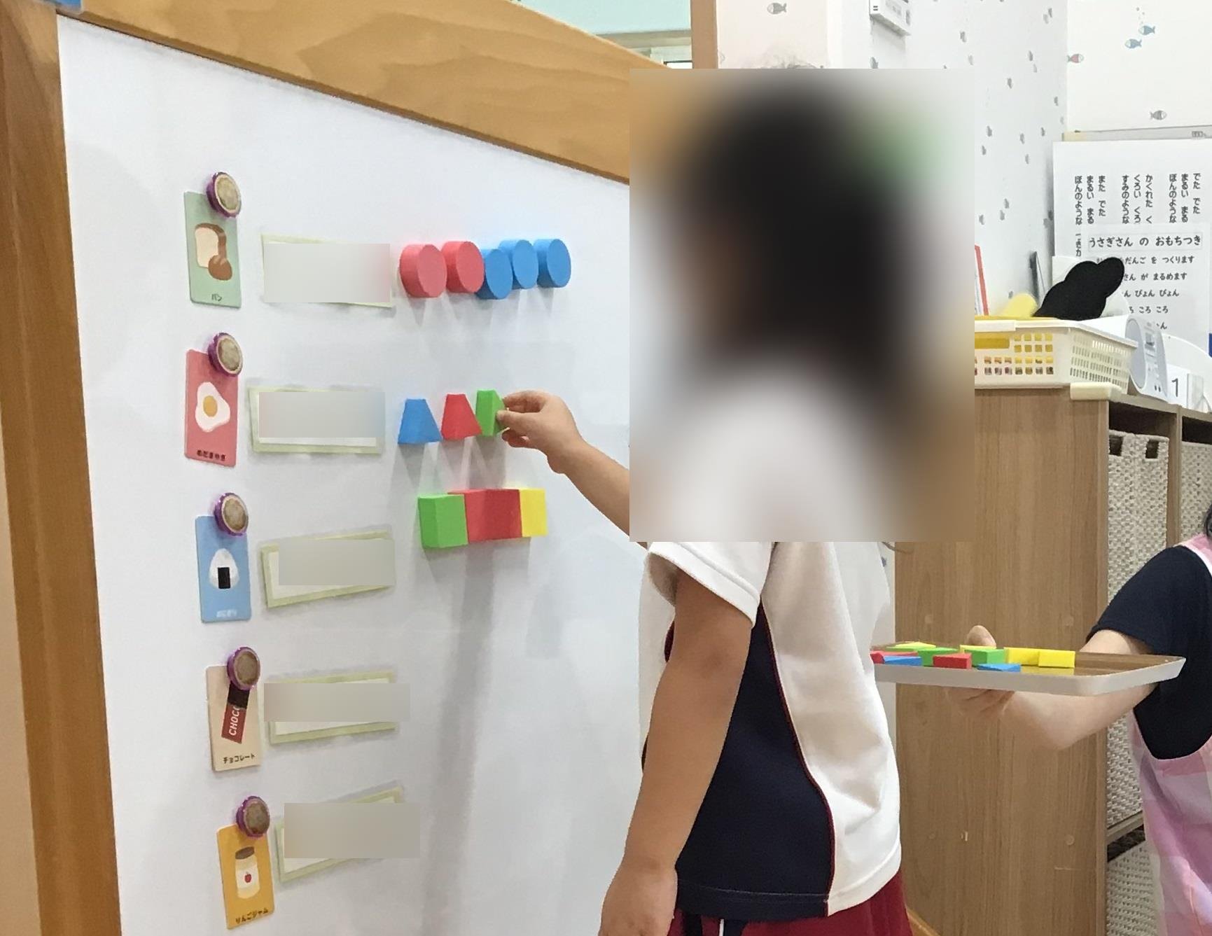 お月見団子を作りましょう② 2021年09月15日(水) もうすぐお月見です。 今日は子どもたちにお月見団子の準備を手伝ってもらいました。 いろいろな形のマグネットをお団子に見立て、指示されたものを並べていきます。 何色だったかなあ?