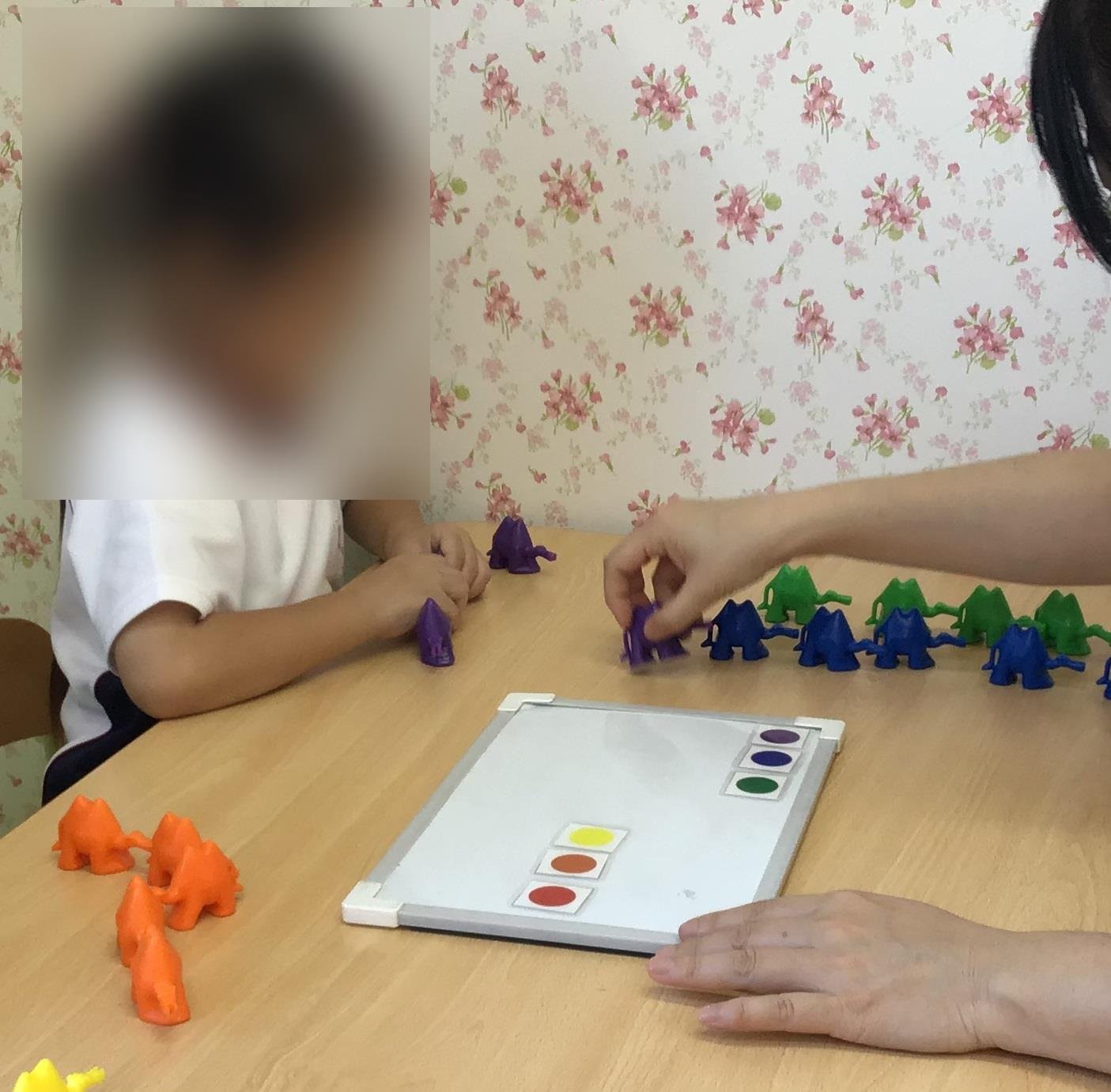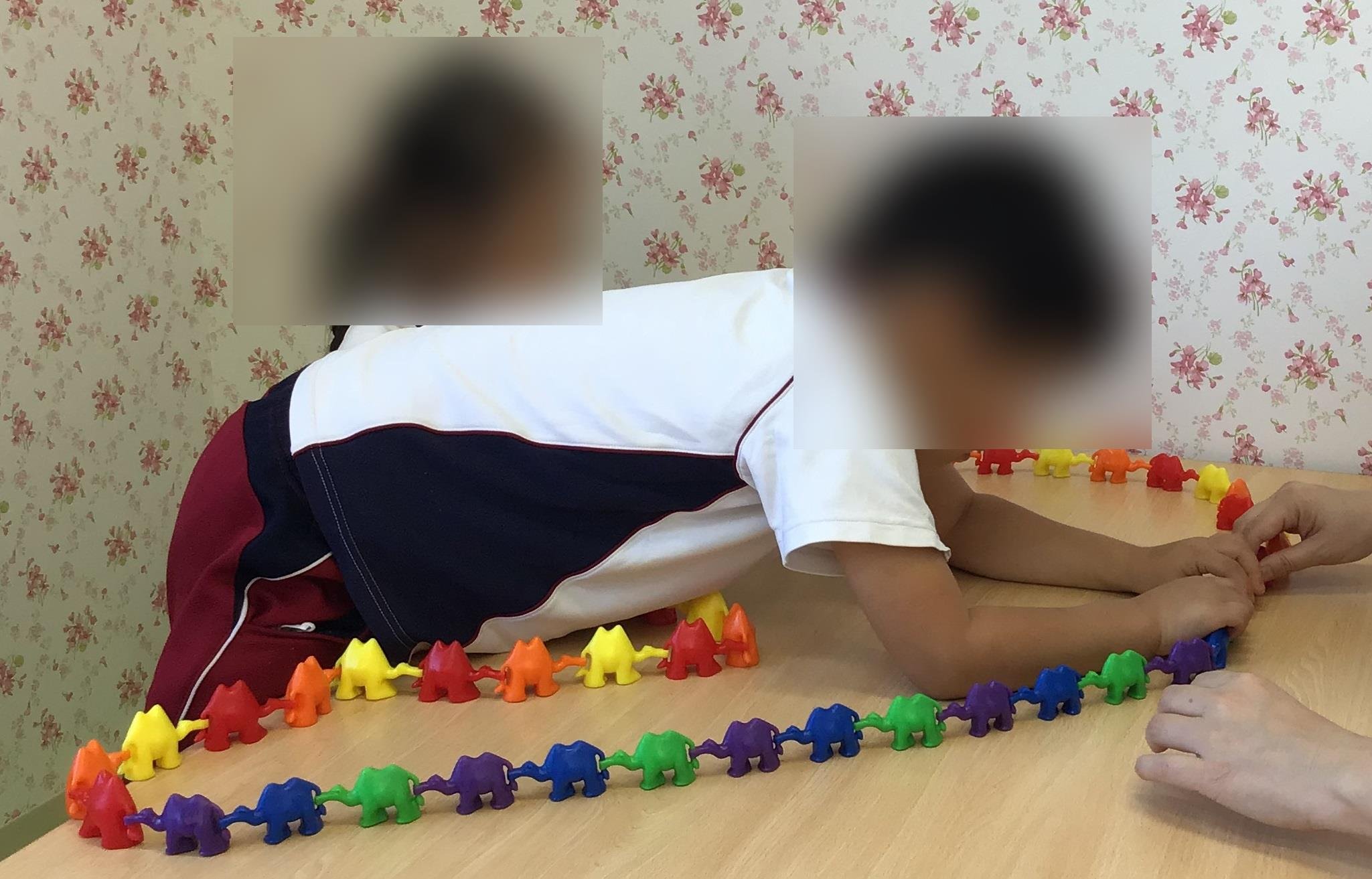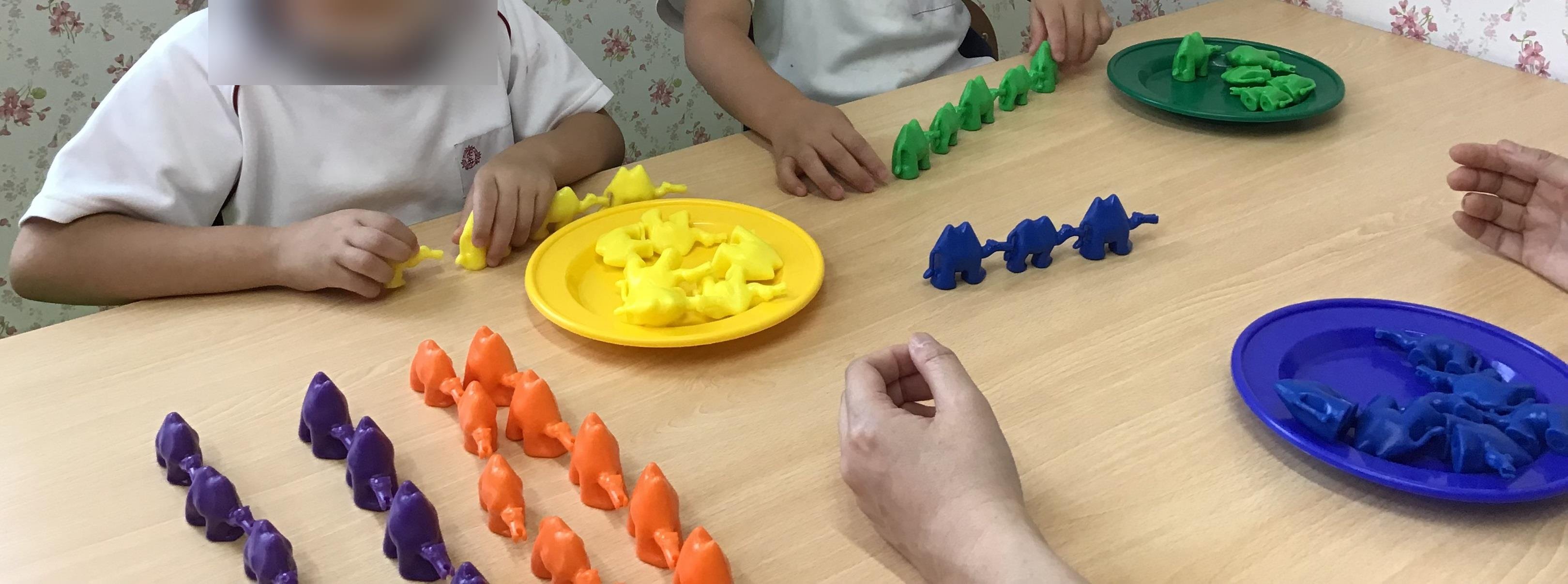 ラクダで遊ぼう② 2021年10月13日(水) 微細運動、マッチング、指示理解をねらいとしたラクダ遊びが続いています。 まずは色分け カードで示された色に合わせています 全部つなげてみるよ! 大きな円ができました