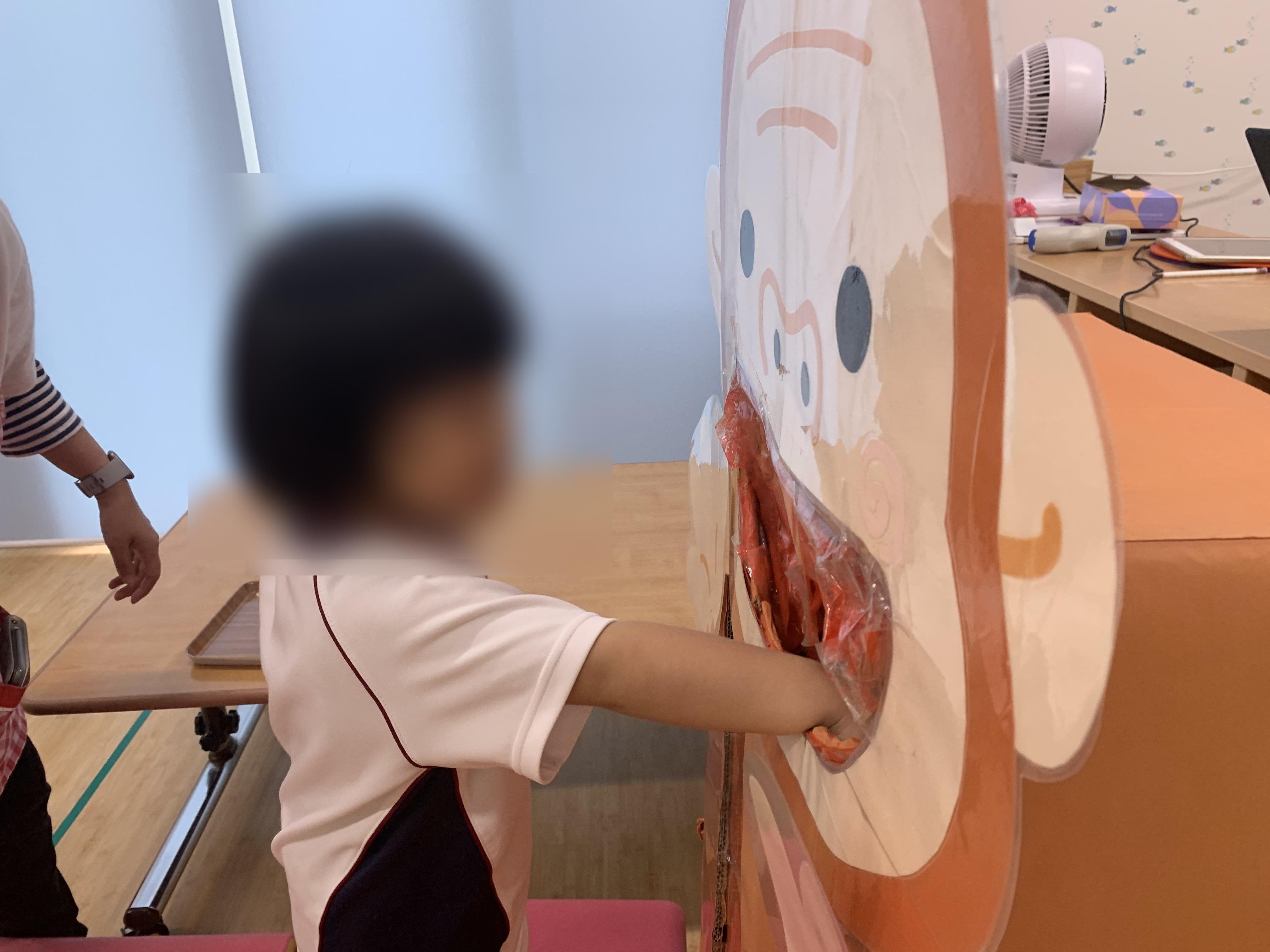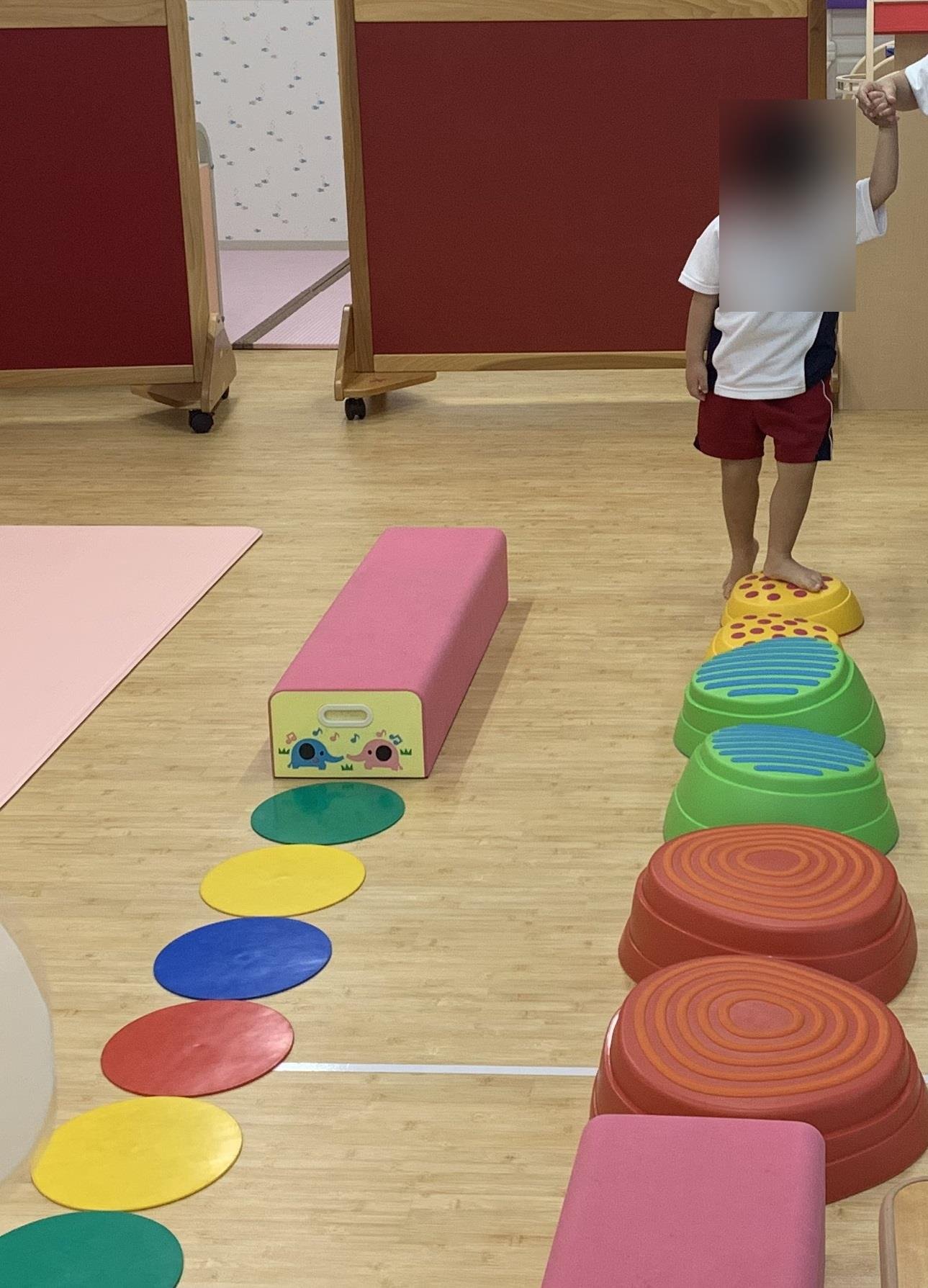 運動遊び 2021年10月22日(金) でこぼこ道を歩いて、ゴリラさんにくだものを届けに出発です。 初めは先生と手をつないで、ゆっくり進む子どもたちも、慣れると自分のスピードで歩けるようになってきました。 ゆっくり、ゆっくり・・・ お待たせしました! はい、どうぞ。