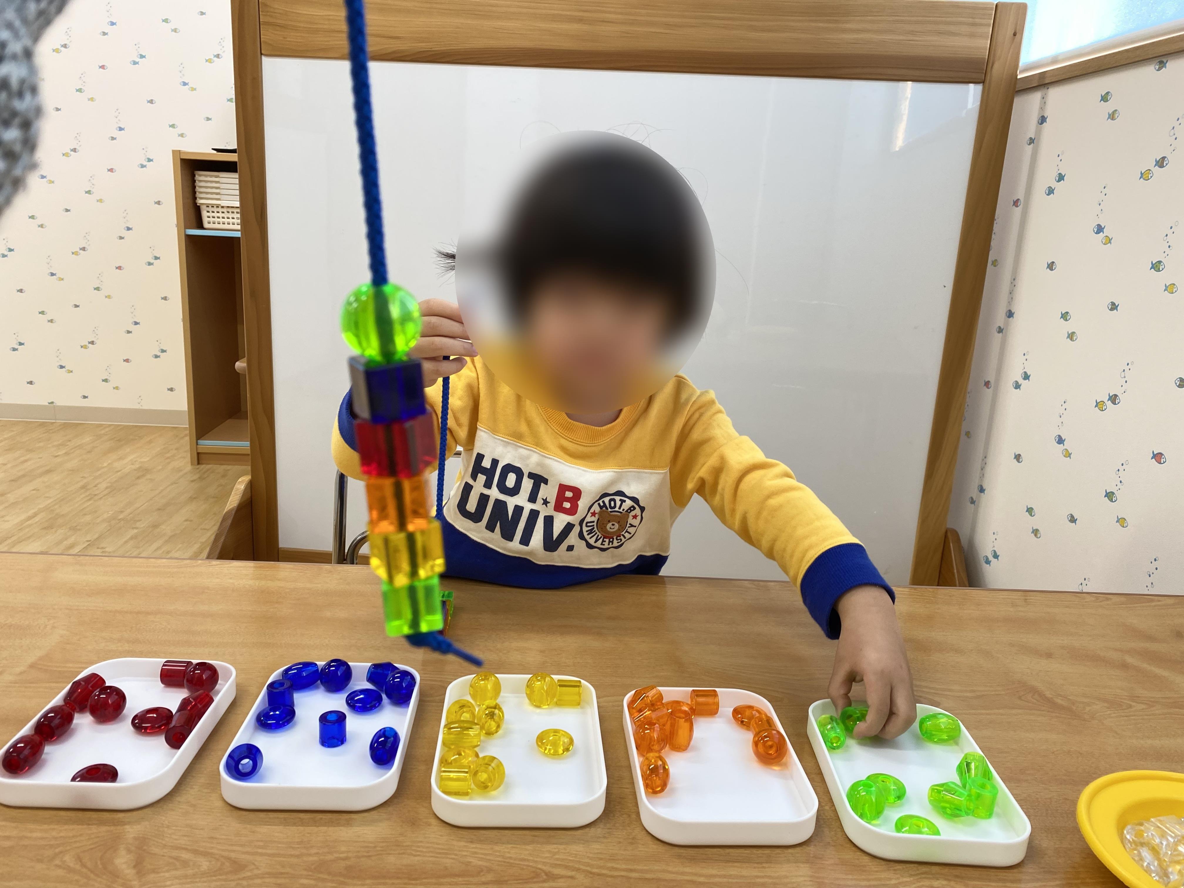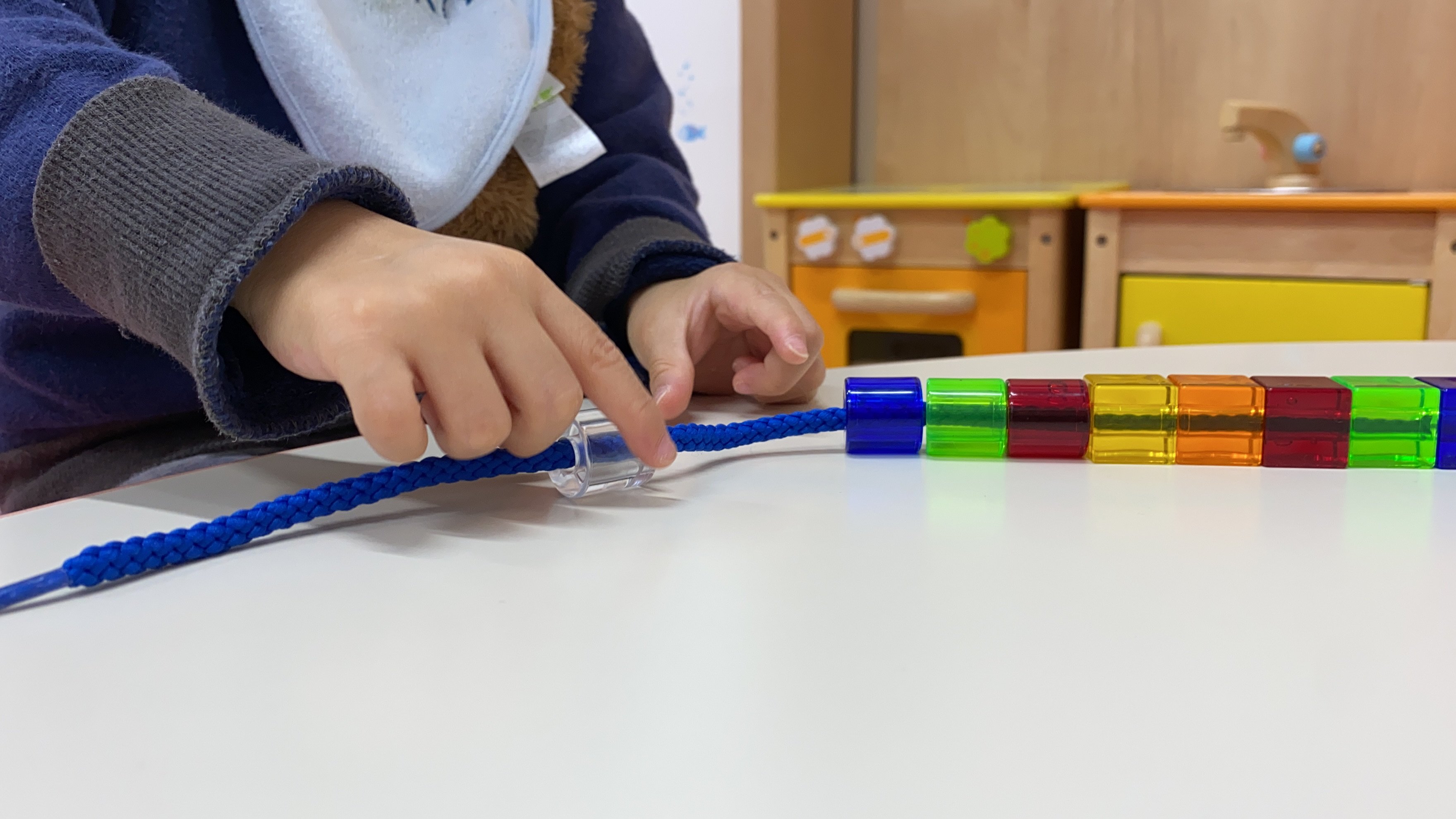 きらきらひも通し 2021年12月13日(月) 未就園のお友達が、透明素材のひも通しに挑戦しています。 ひもが透けて見えるので、穴にひもが通る様子を見ることができます。 ひもが見える~! 次は、みどりだね!