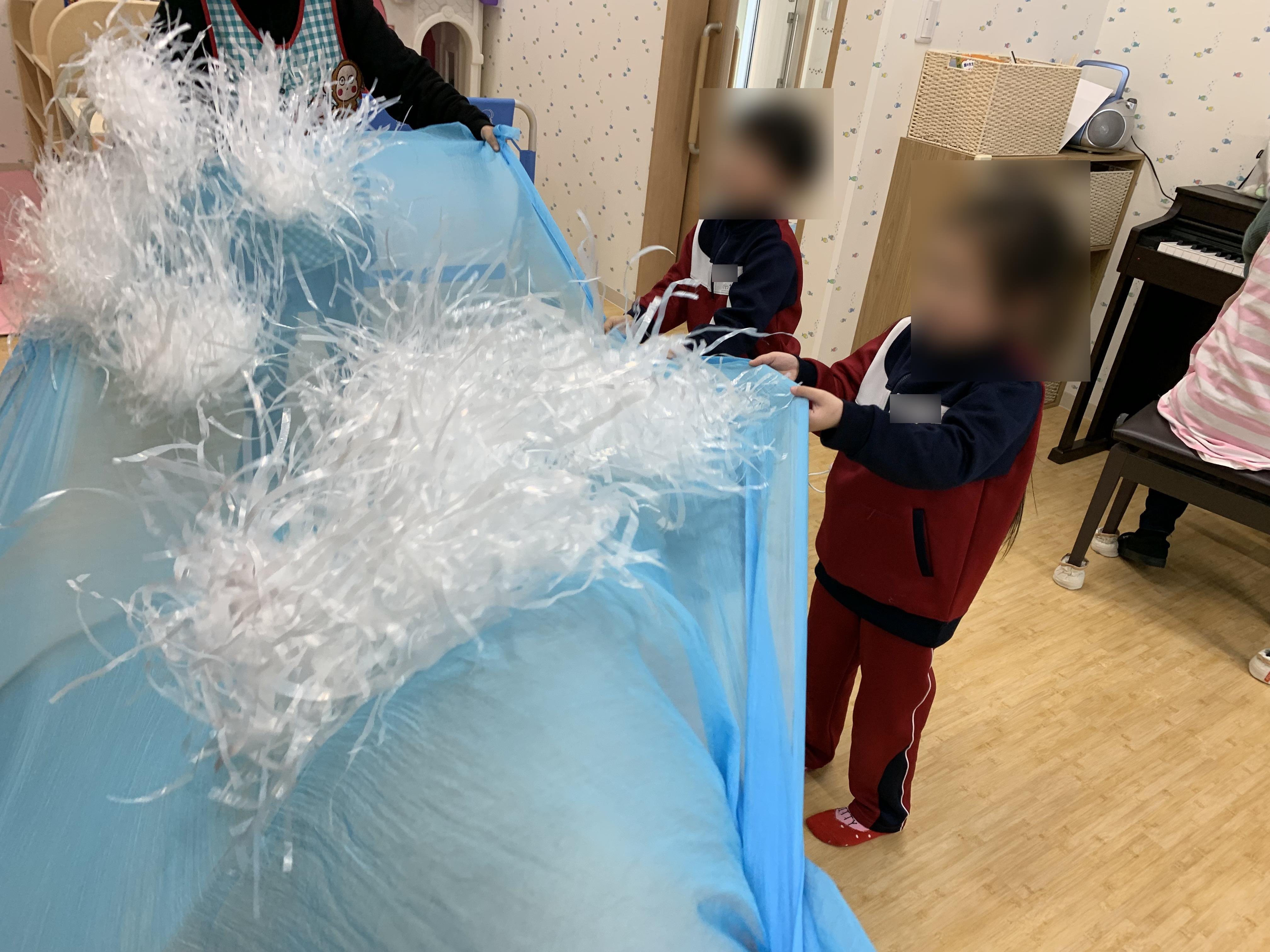 雪遊び① 2022年02月09日(水) 2月前半のグループ療育テーマは「雪遊び」です。 雪に見立てたポンポンでのリトミックや、ゆきだるまや雪の結晶製作を楽しみます。 雪が降ってきたよ~! 雪やこんこの曲に合わせて・・・