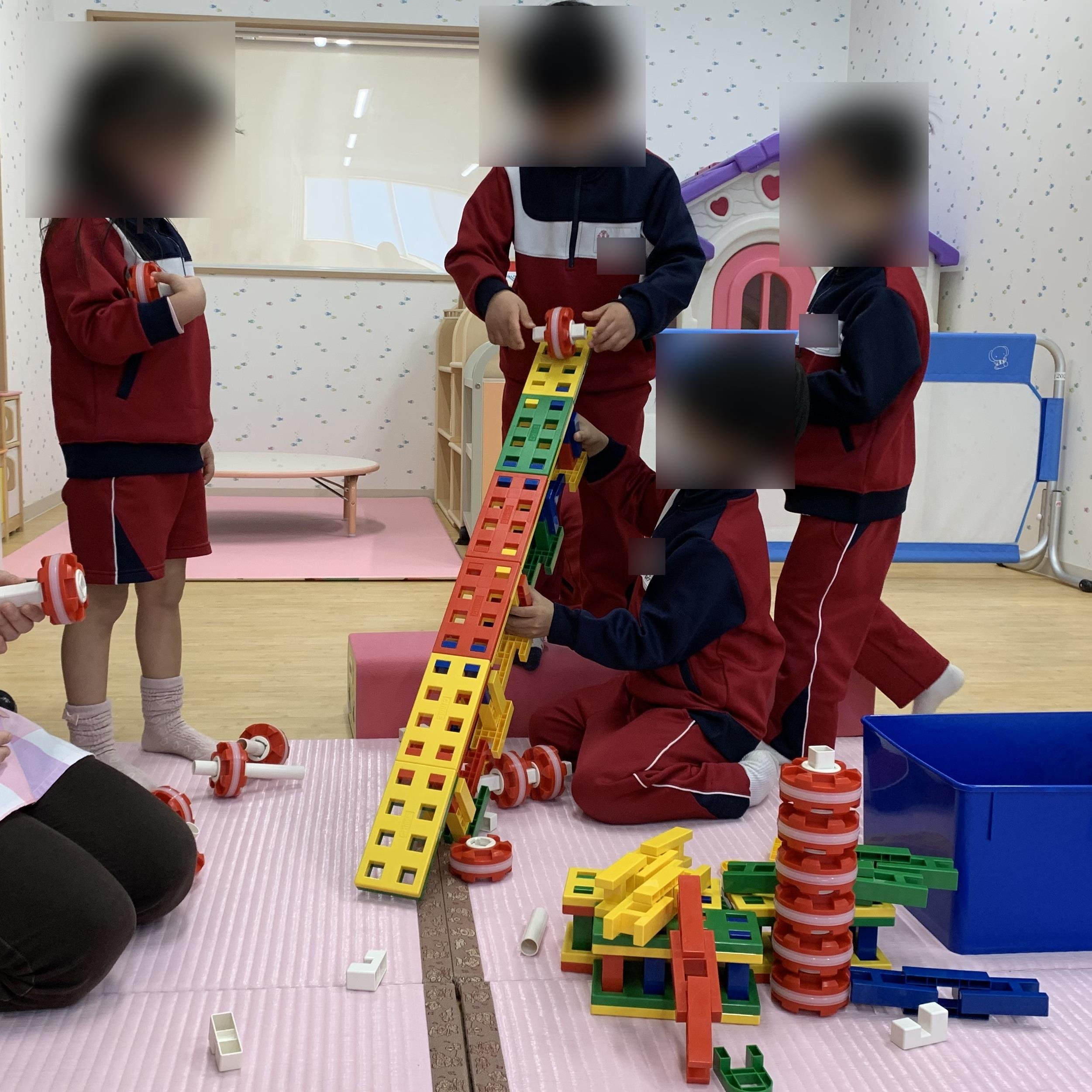 好きな遊びの時間に、子どもたちがブロック遊びをしていました。 初めは個人で遊んでいたものが、だんだんとつながっていき・・・。