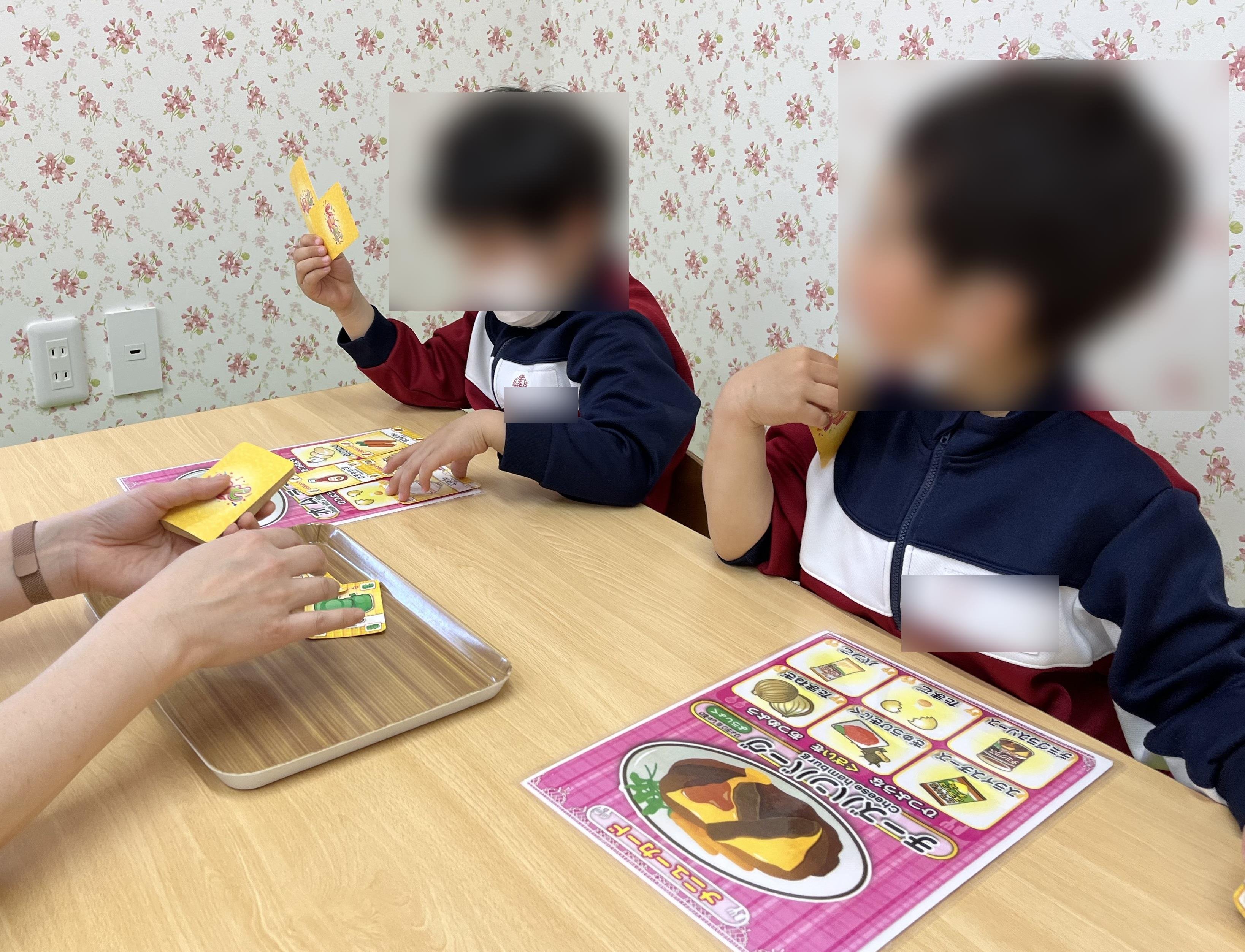 クッキング遊び 2022年03月23日(水) 今年度最後のテーマはクッキング遊びです。 例えばカレーライスは「お肉、じゃがいも、人参、たまねぎ、カレールー」からできています。 作り方を並べたり、材料を集めたり、ゲームの中で楽しく学んでいきます。 チーズハンバーグに挑戦!