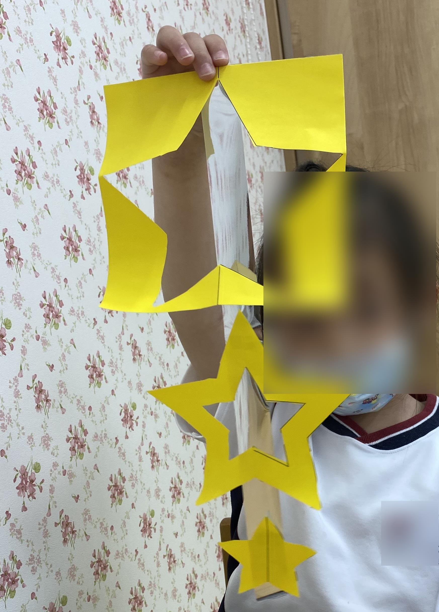 はさみが使えるようになったお友達が、より高度な切り紙に挑戦しています。 はさみの角度や刃の開き具合など、集中力と手先の力加減が必要です。
