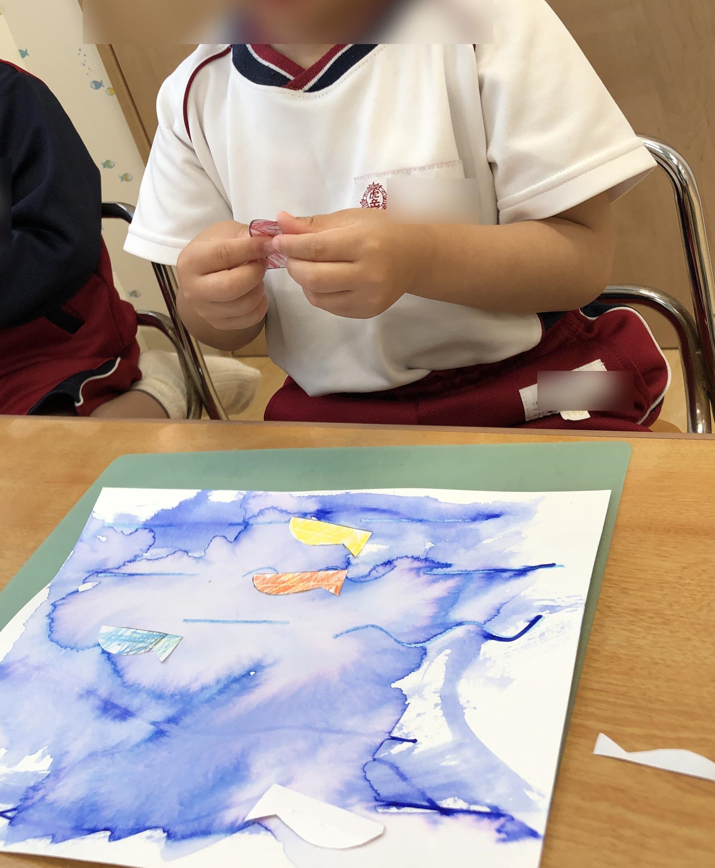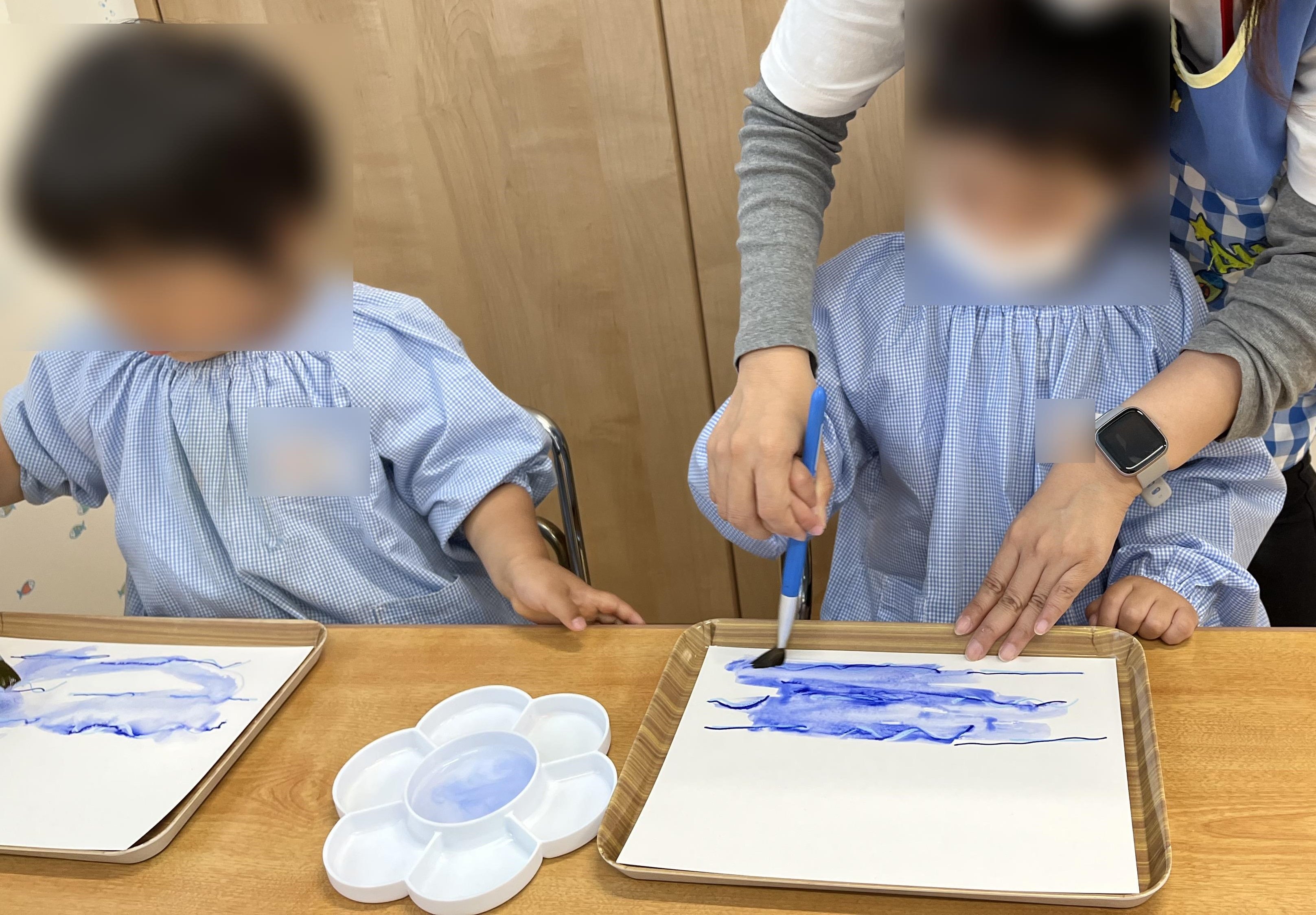 こちらのグループでは、めだかさんの川づくり。 筆がすべる感触を楽しむ子どもたちです。