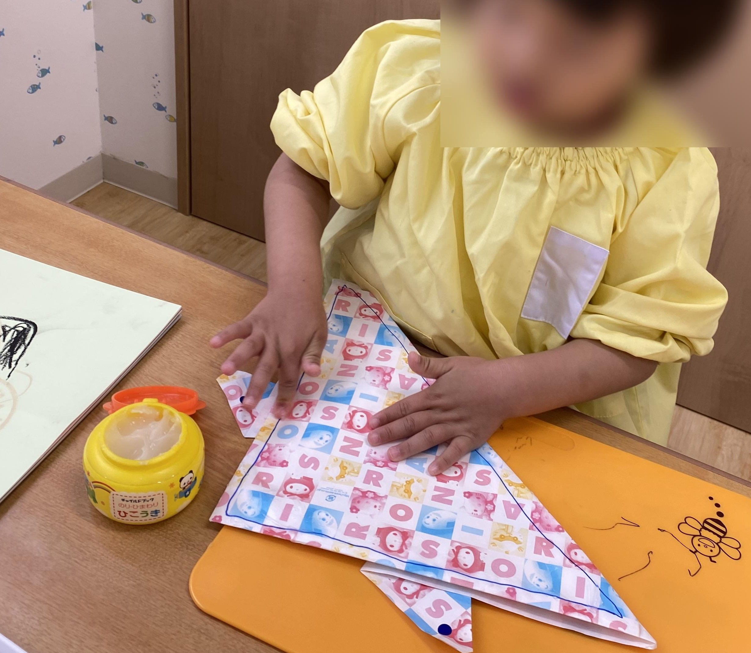 のりの使い方 2022年05月31日(火) 幼稚園などで使われる「のり」を扱うことが苦手な子どももいます。 どこに塗ればよいのか、印をつけてあげることで視覚的にわかりやすくなるかもしれません。 線があるとわかりやすいね。