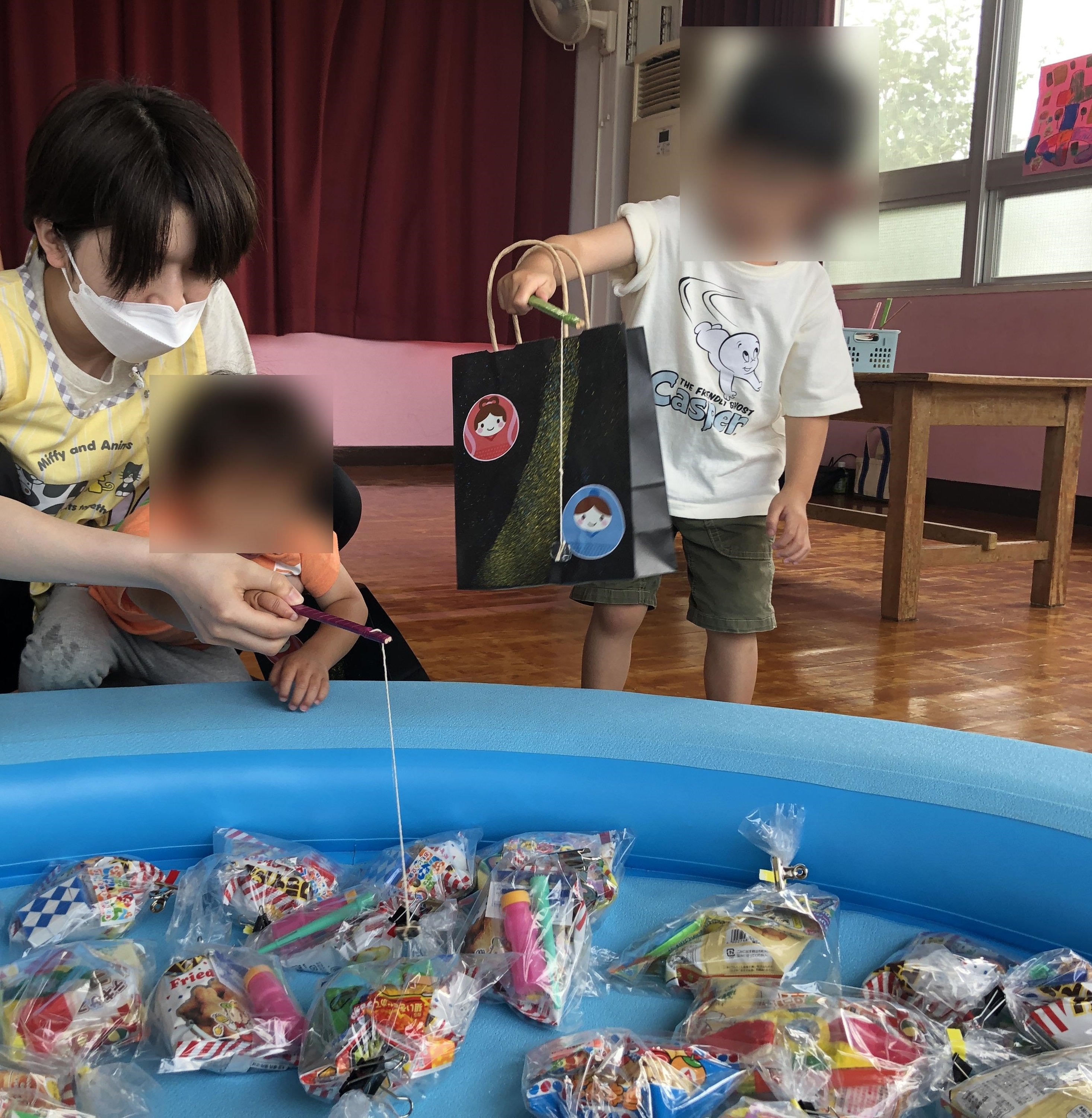 七夕まつりに参加しました。 2022年07月07日(木) 未就園のお友達が、虎岳幼稚園の七夕まつりに招待されました。 ヨーヨーや魚釣りなど、お友達と一緒に楽しみました。 どれにしようかな~ おまつりの雰囲気、いっぱいです。