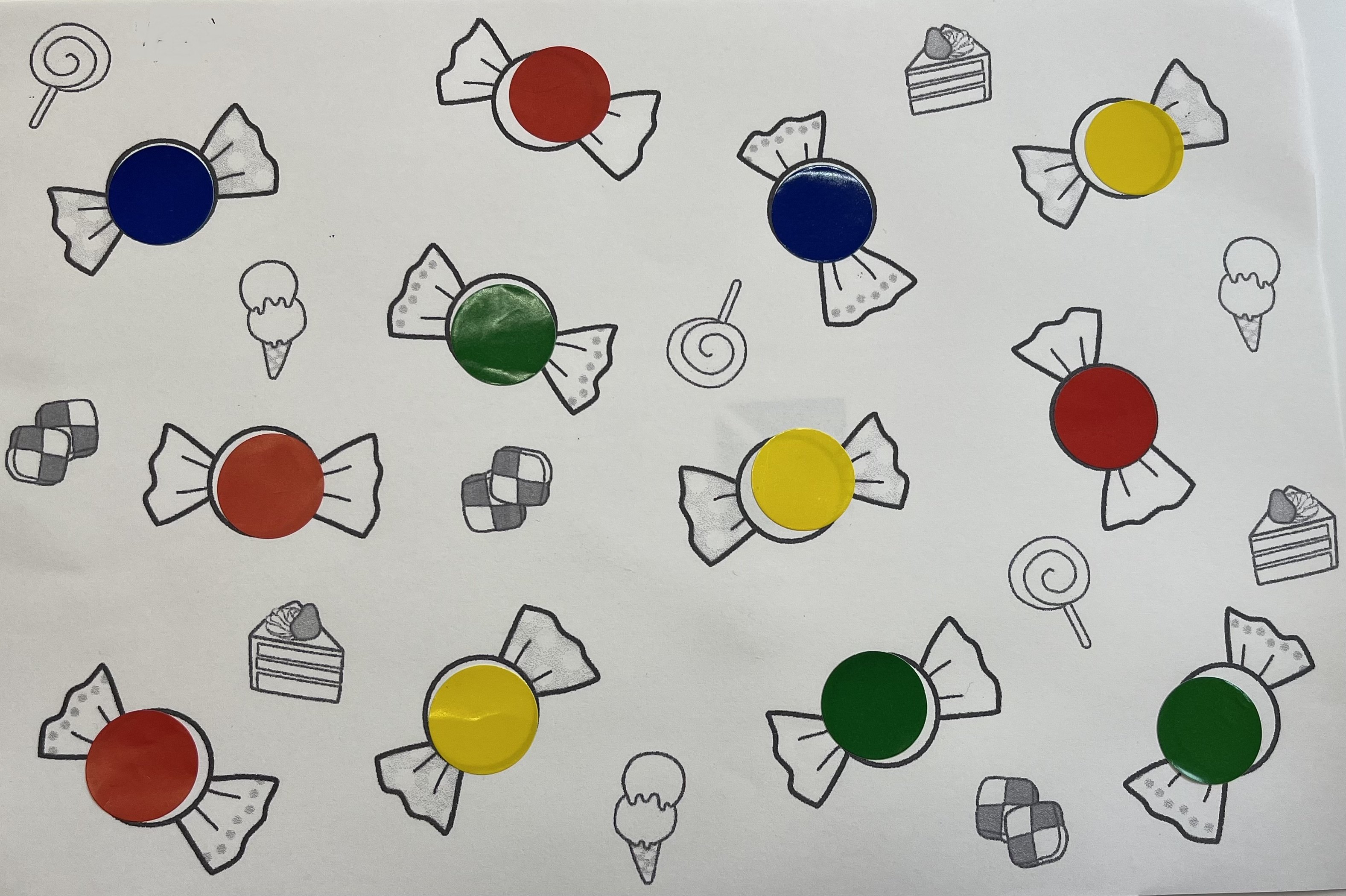 色とりどりのおいしいキャンディができました。 円の中に貼る作業は単純に見えますが、指先の細かい動きと目で見て確認する認知力が必要です。