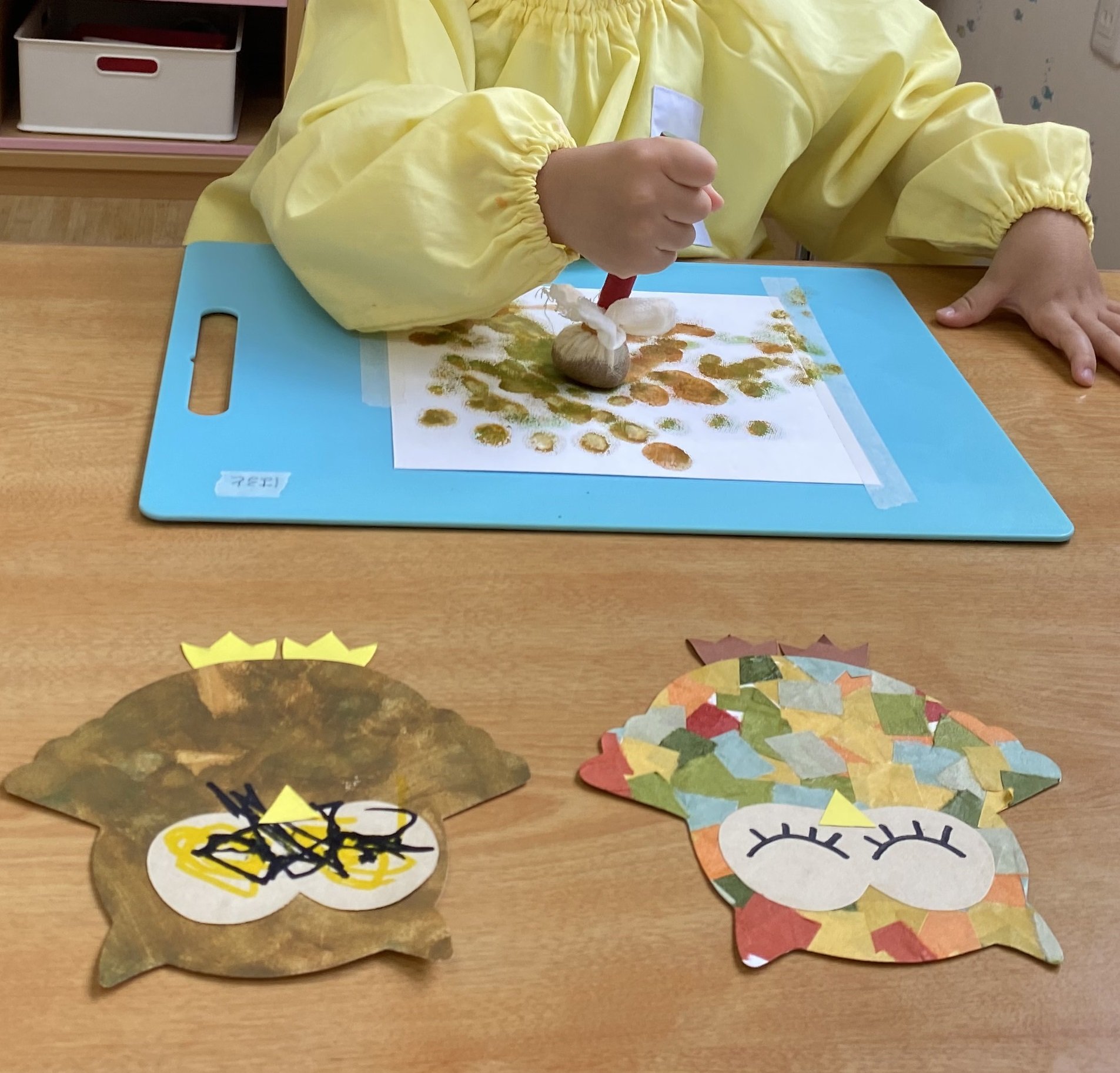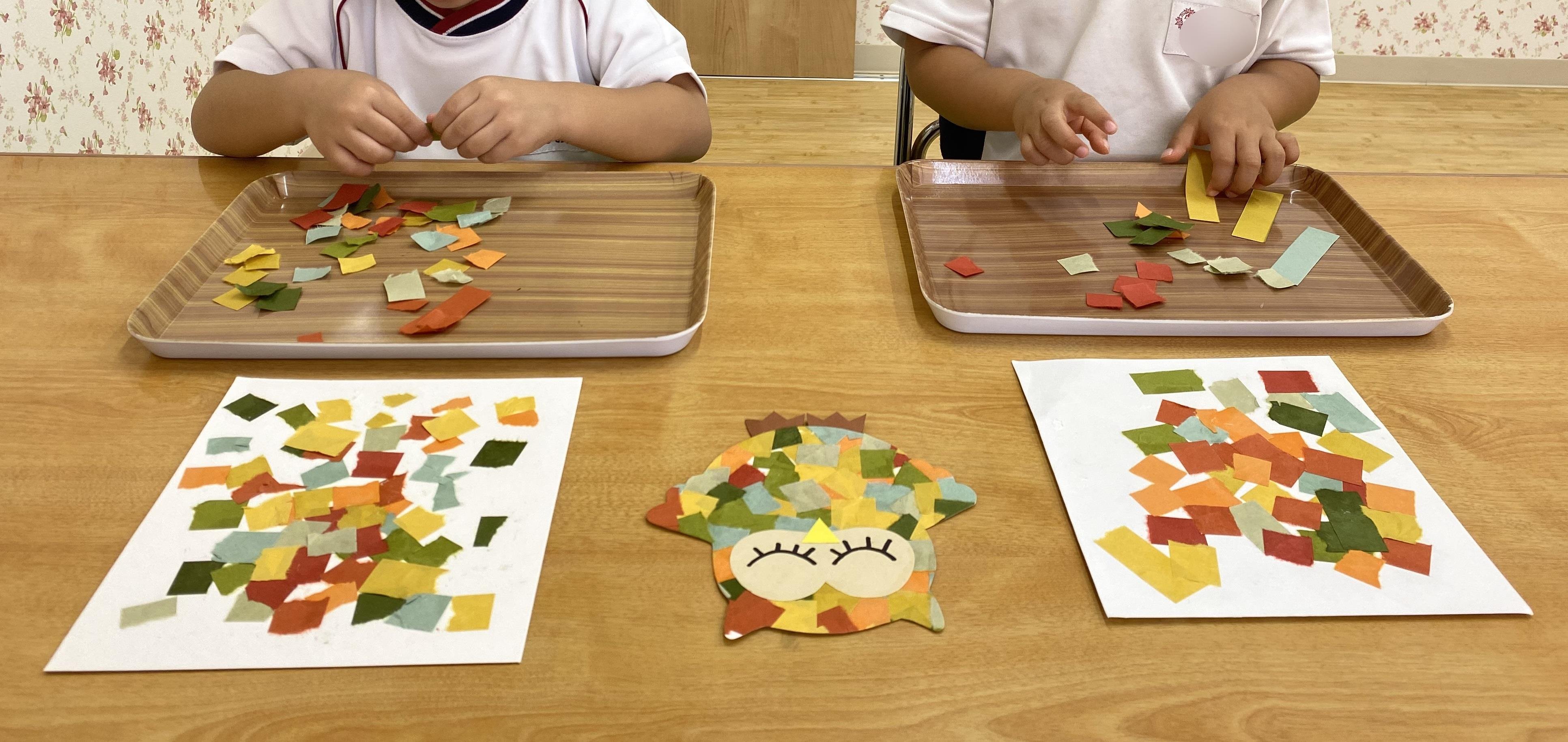 絵具のスタンプやちぎり絵で、ふくろうを作りました。