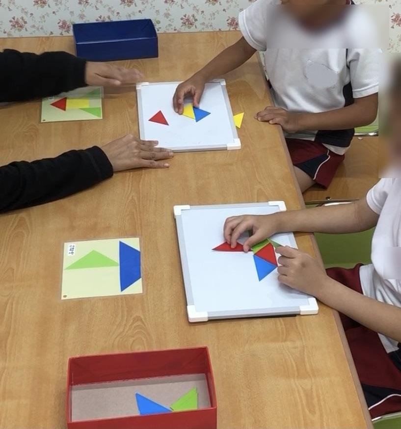 色板を使って、模様構成をしました。 お船やロケット、単純な形の組み合わせですが、なかなか難しい課題です。