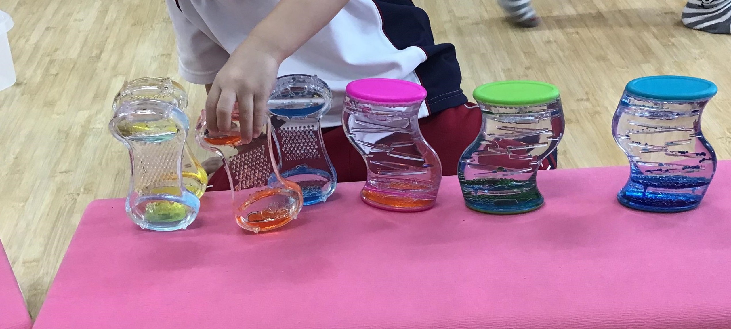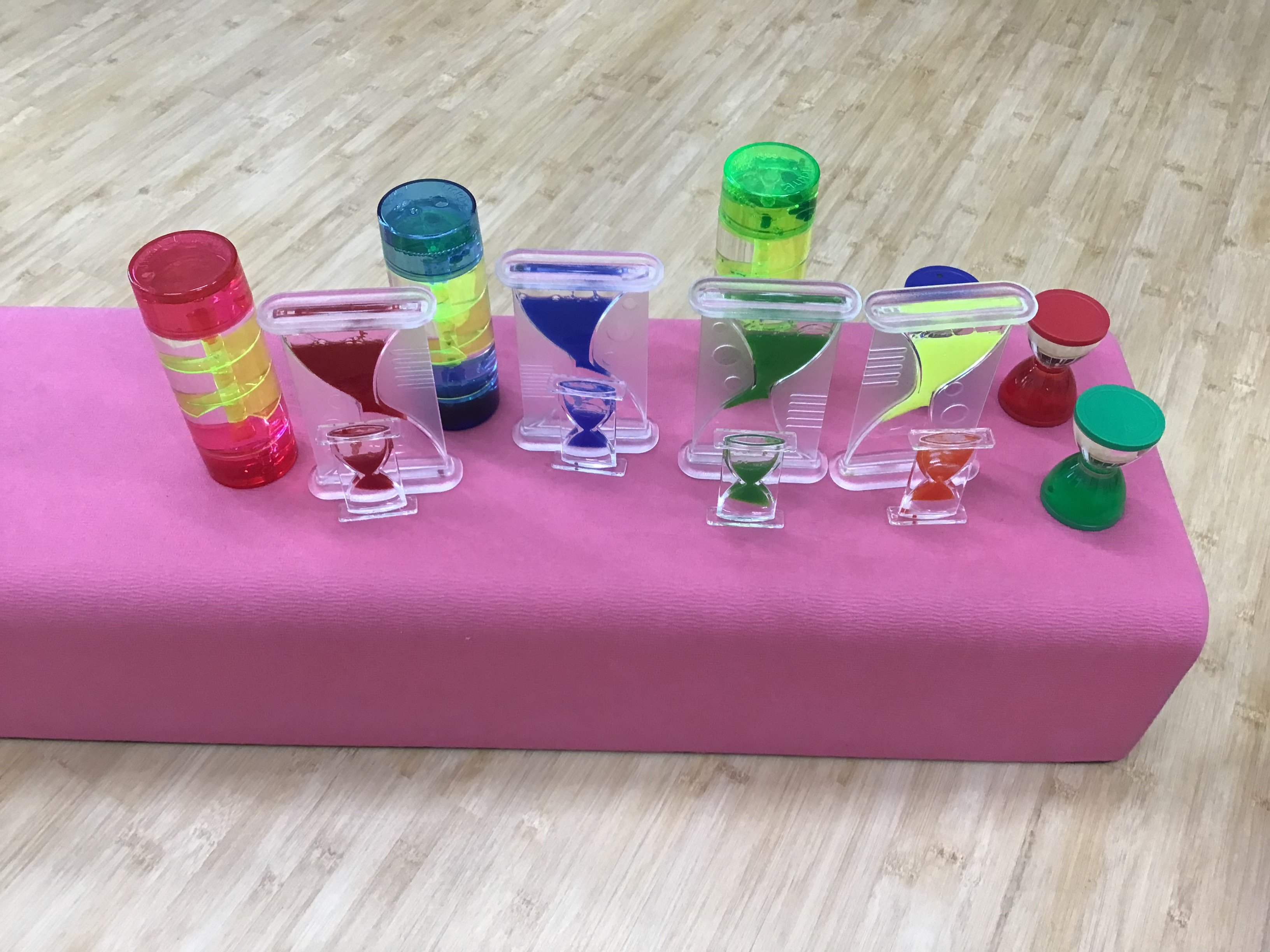 好きな遊びの時間で、オイル時計は静かなブームです。 色順に並べたり、落ちてくる砂や色水を観察したり・・・