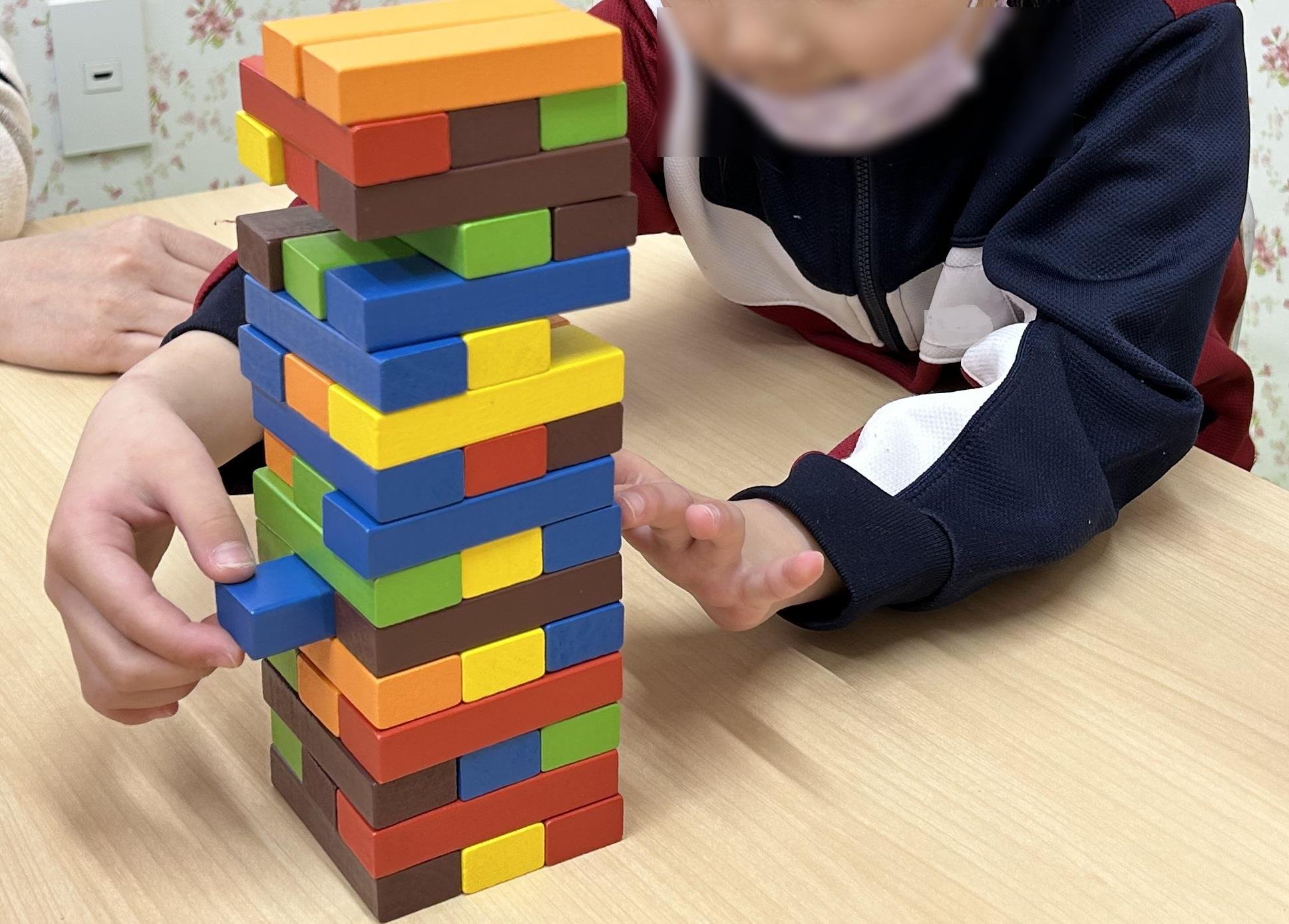 そーっとそーっと・・・ 2023年03月20日(月) 幼稚園を卒園した5歳児のお友達とゲームをしました。 積み上げられた構造から崩れにくい部分をみつけて、慎重に抜いていきます。 塔が崩れないか、みんなドキドキです。 ドキドキ・・・