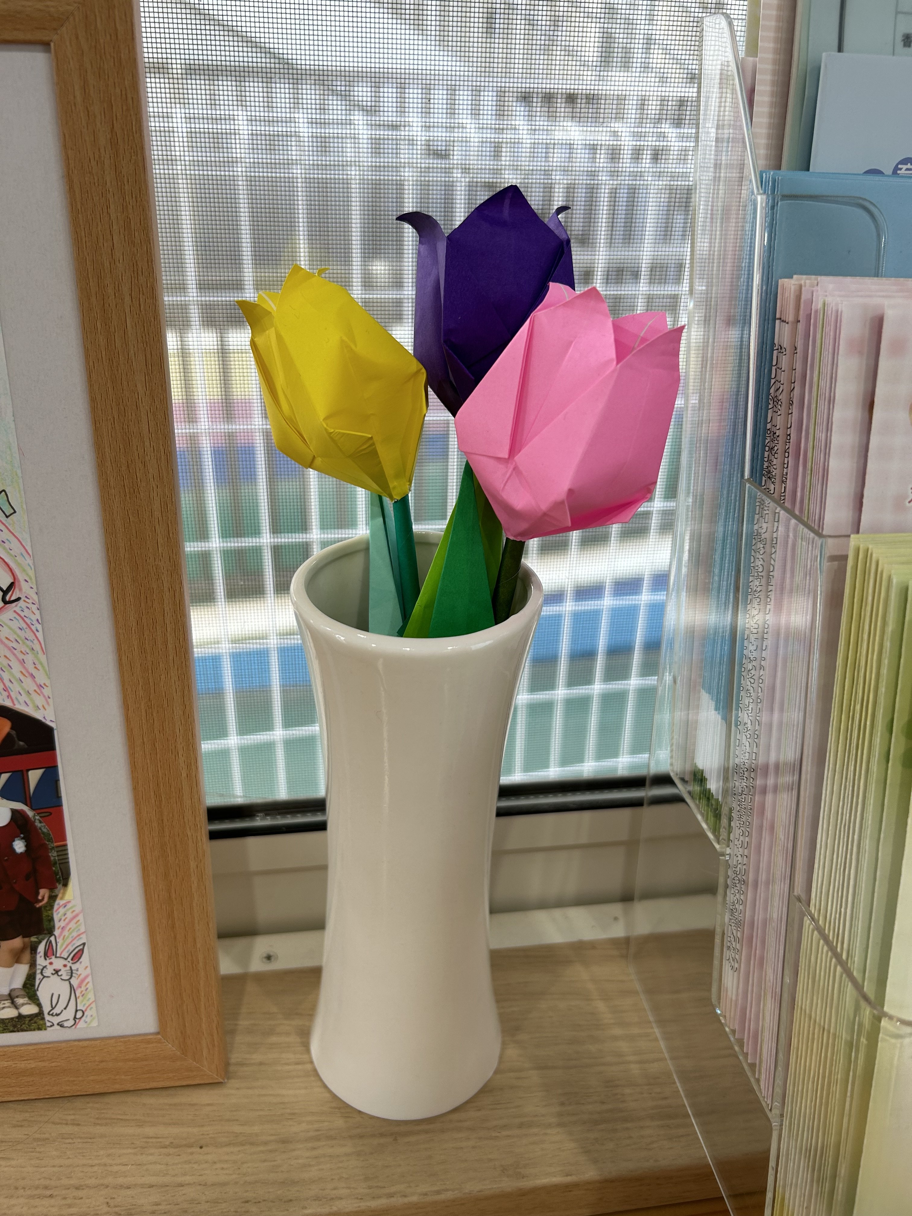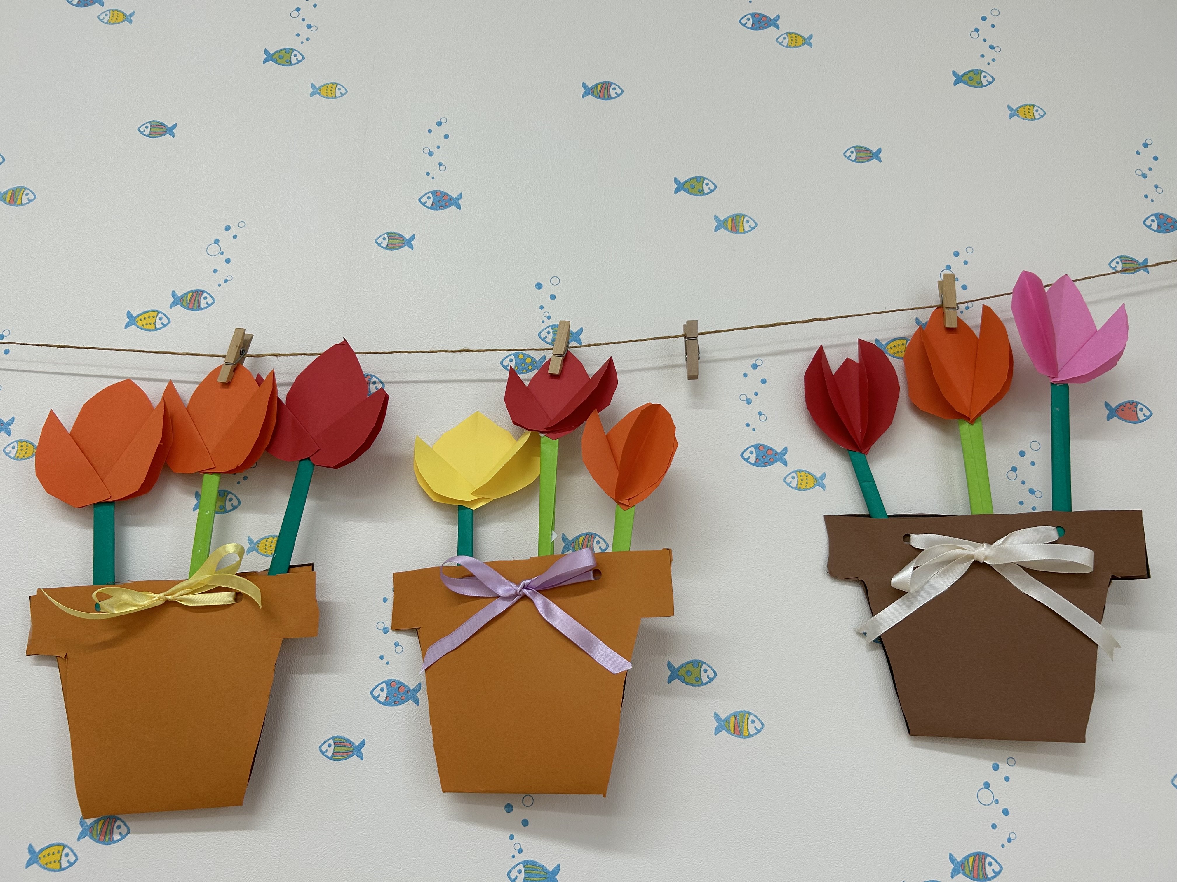 チューリップ 2023年04月06日(木) 4月前半の4,5歳児は、チューリップを製作します。 はさみやのりも上手に使えるようになってきました。 ならんだ~♪ ならんだ~♪ チョキチョキ 卒園児のお友達がもってきてくれたチューリップです。