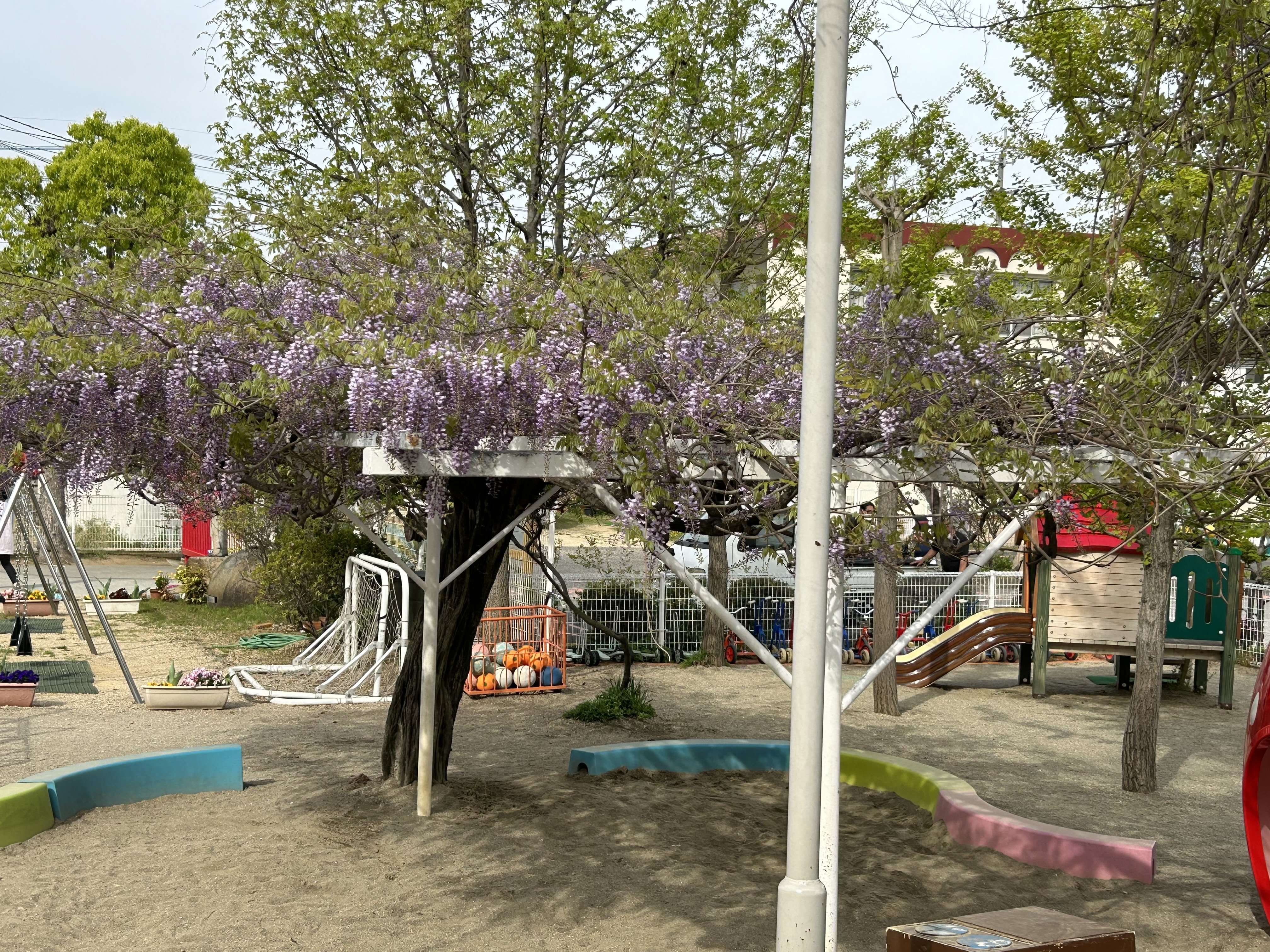 幼稚園の園庭は、藤の花が満開です。