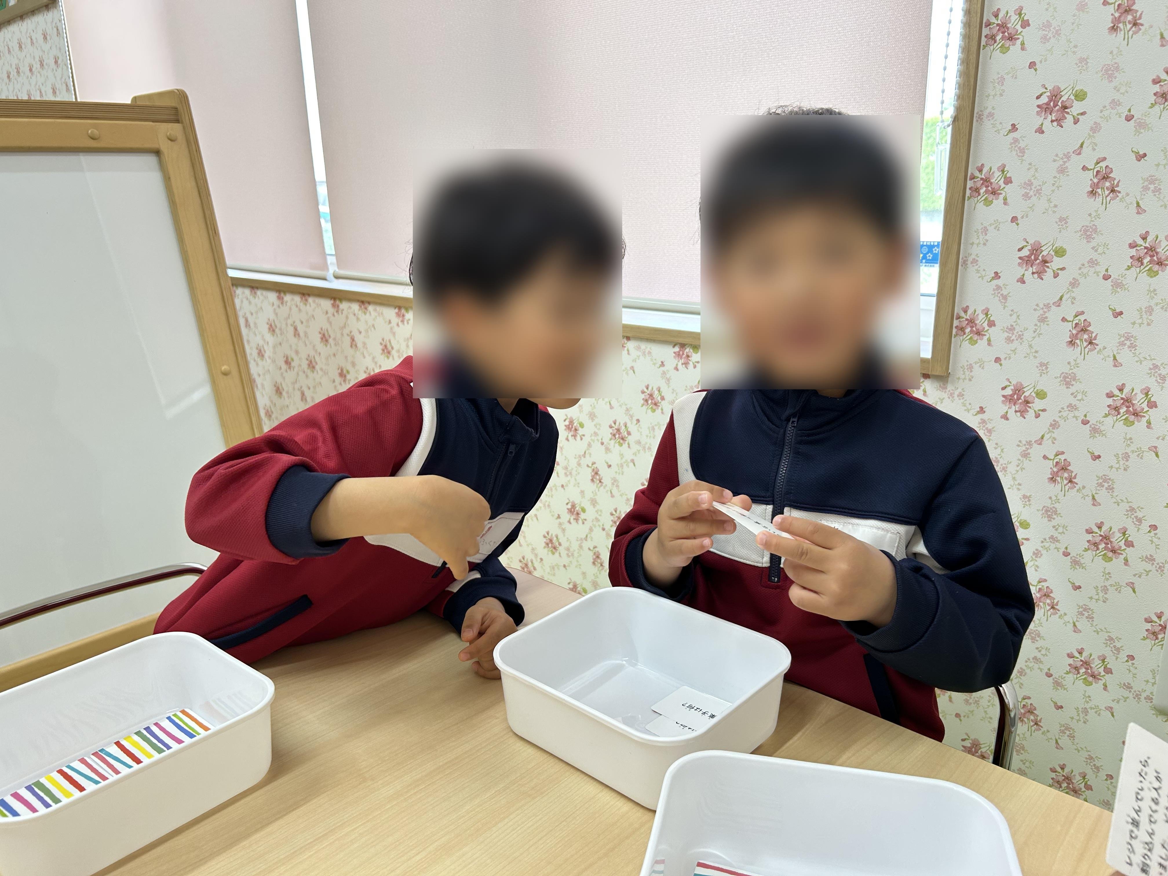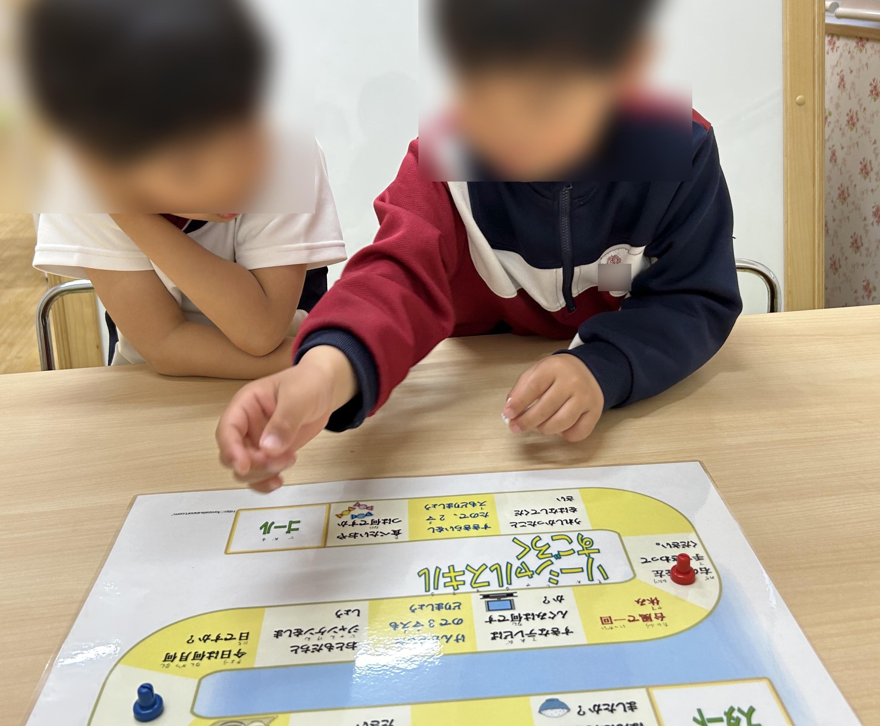 ソーシャルスキルゲーム 2023年04月28日(金) 年長児のお友達が、ゲームを楽しみました。 すごろくやカードで遊びながら、集団生活のマナーに気づけるように支援しています。 3つ、進むよ! カードの質問にこたえる遊びです。 ねえねえ、なんて書いてるの?