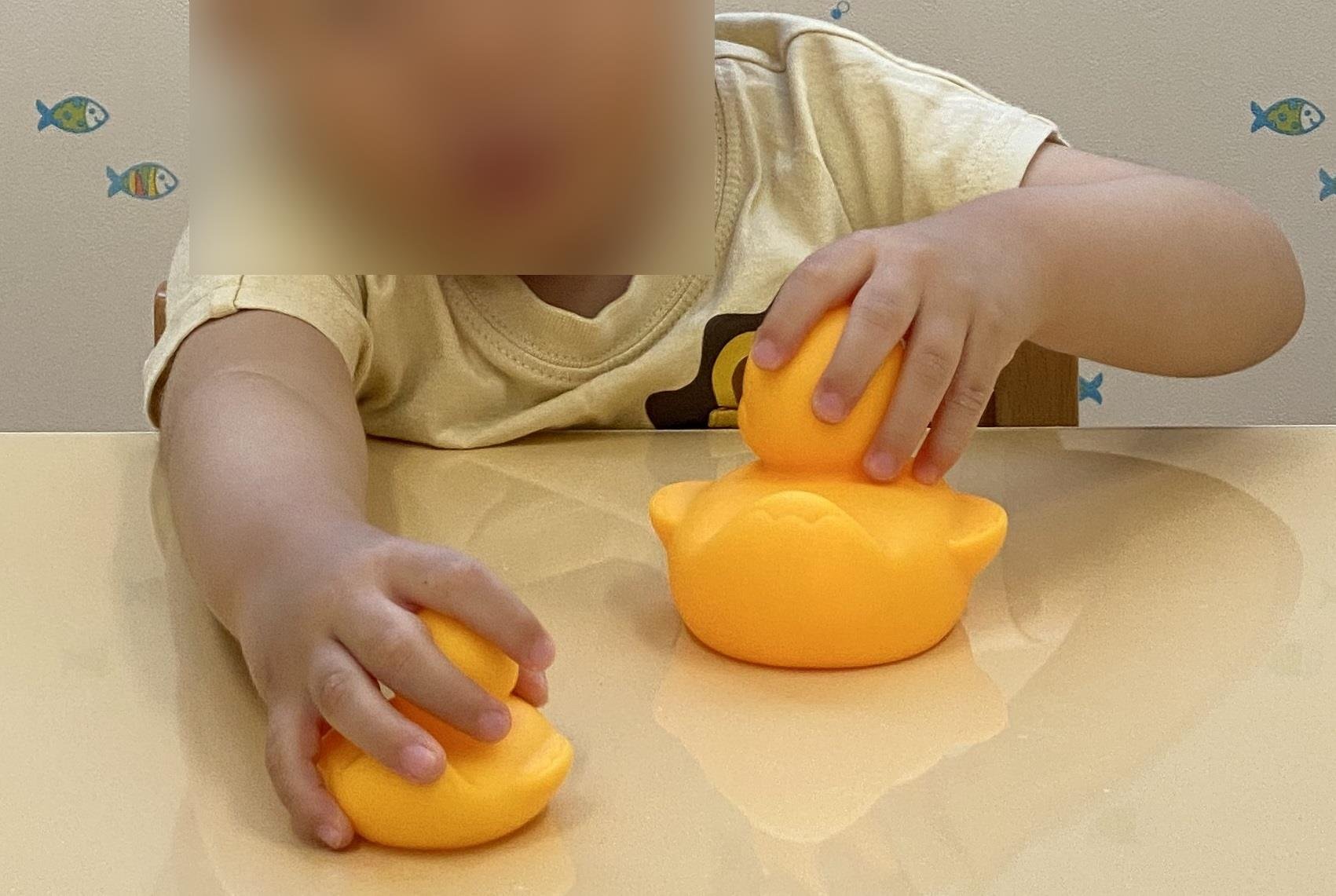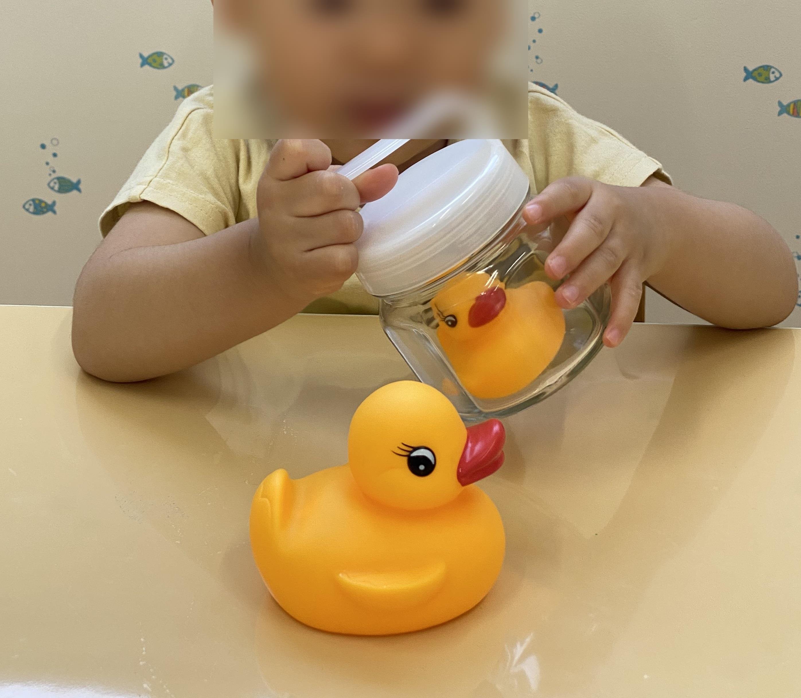 未就園のお友達がかわいいあひるさんを見つけました。 ビンに入れたりふたをしめたり・・・。 いろいろな遊びを楽しみました。
