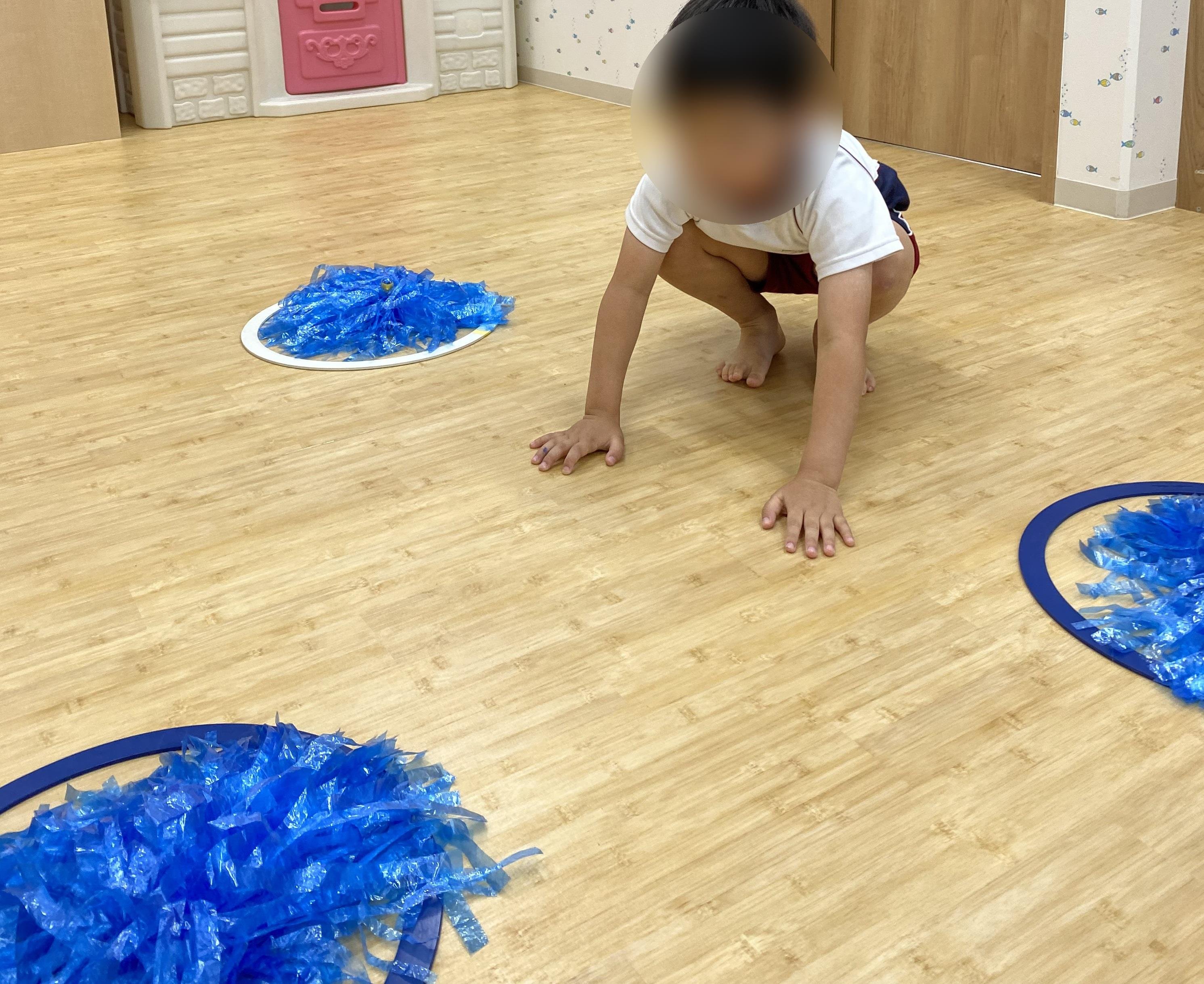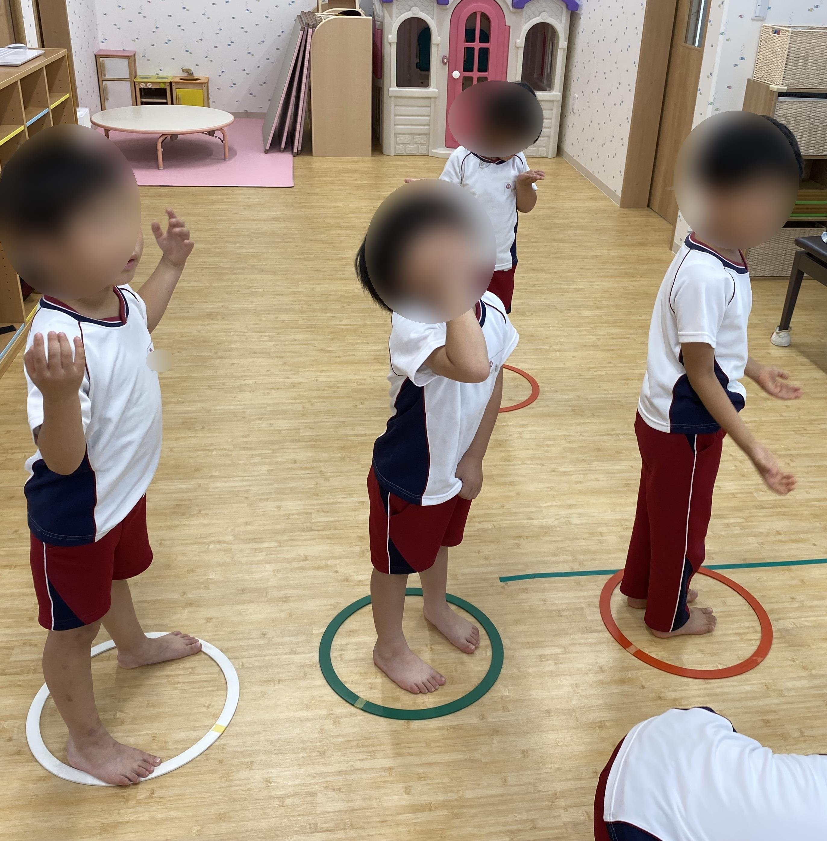 リトミック「雨の日のお散歩」 2023年06月20日(火) 音楽に合わせてカエルやかたつむりに変身! 水たまりを飛び越えたり、雷の音で止まったり・・・ いろいろな表現を楽しみました。 かえるさん、ぴょーん! 雨、降ってくるかな~?
