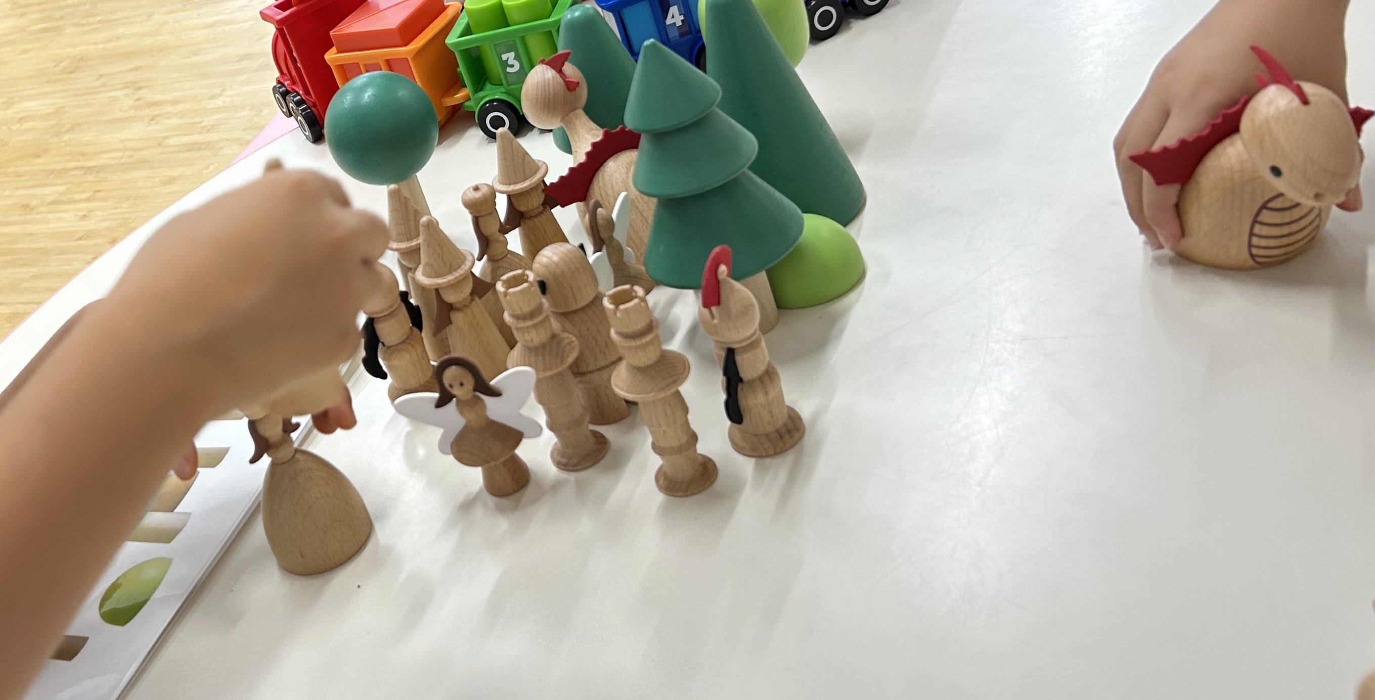 メルヘン積み木 2023年06月22日(木) 新しい教材が届きました。 ドラゴンや妖精、不思議な生き物と森の木々。 どんなお話ができるかな? みんな、集合したよ。 ならんでくださ~い。 この子、迷子なの・・・