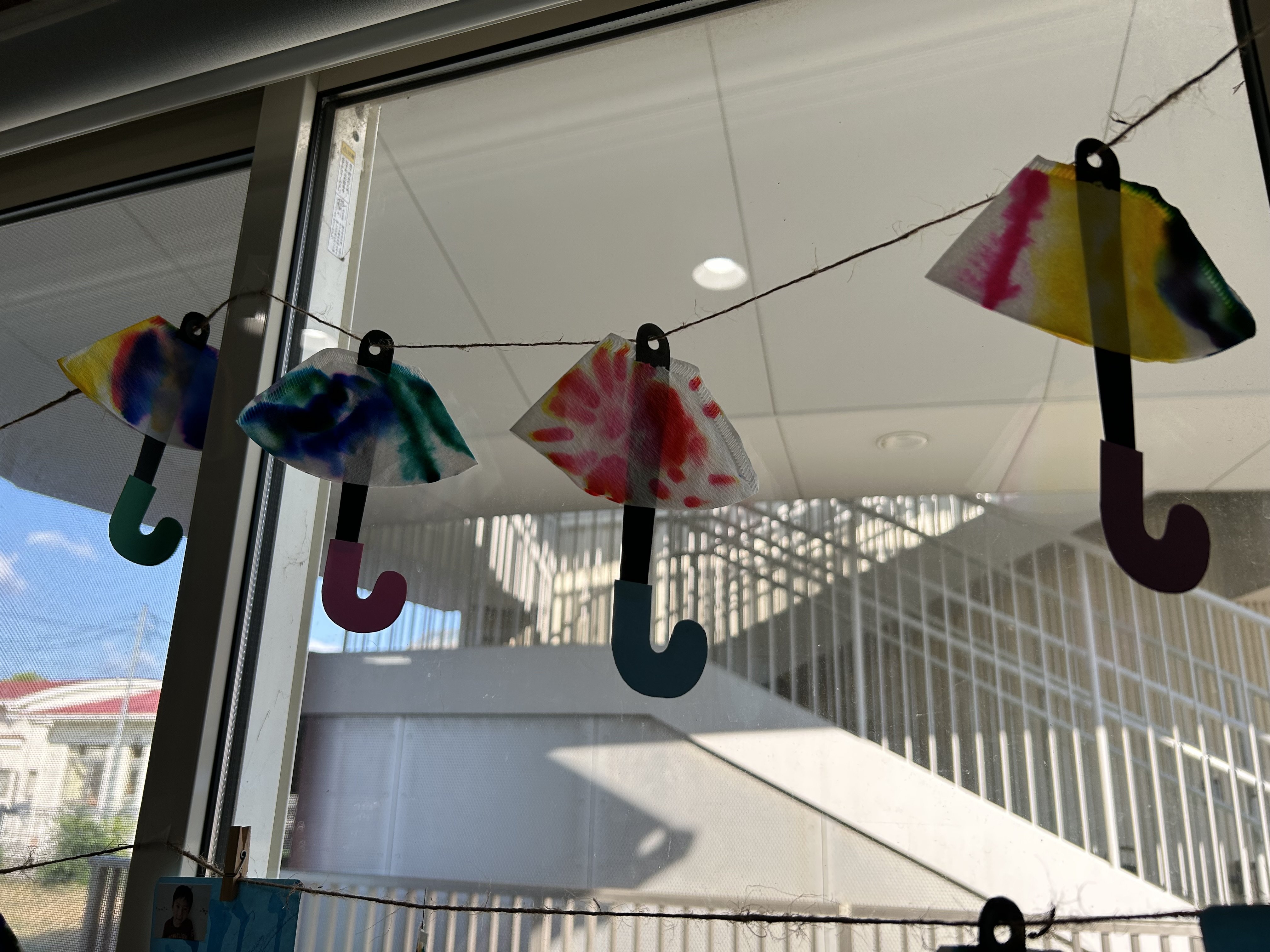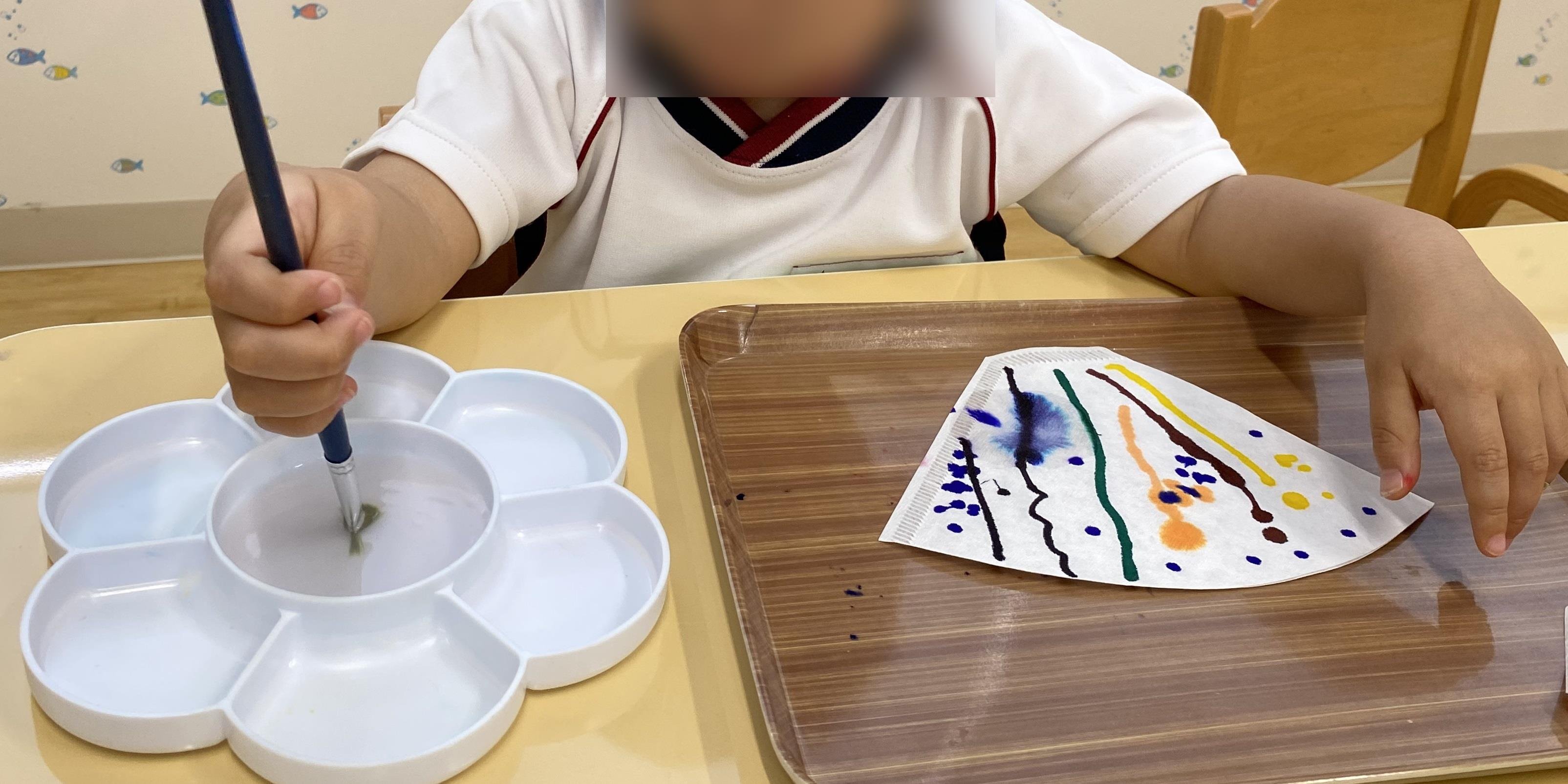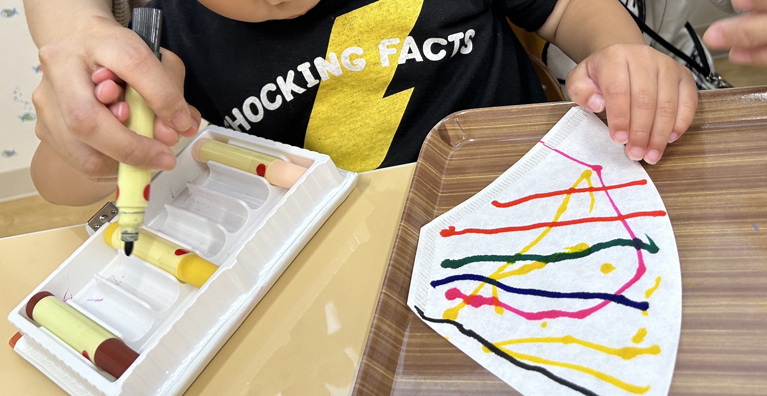 水性ペンでにじみ絵遊びをしました。 子どもたちは、水にぬれて広がる色を興味深く見ていました。