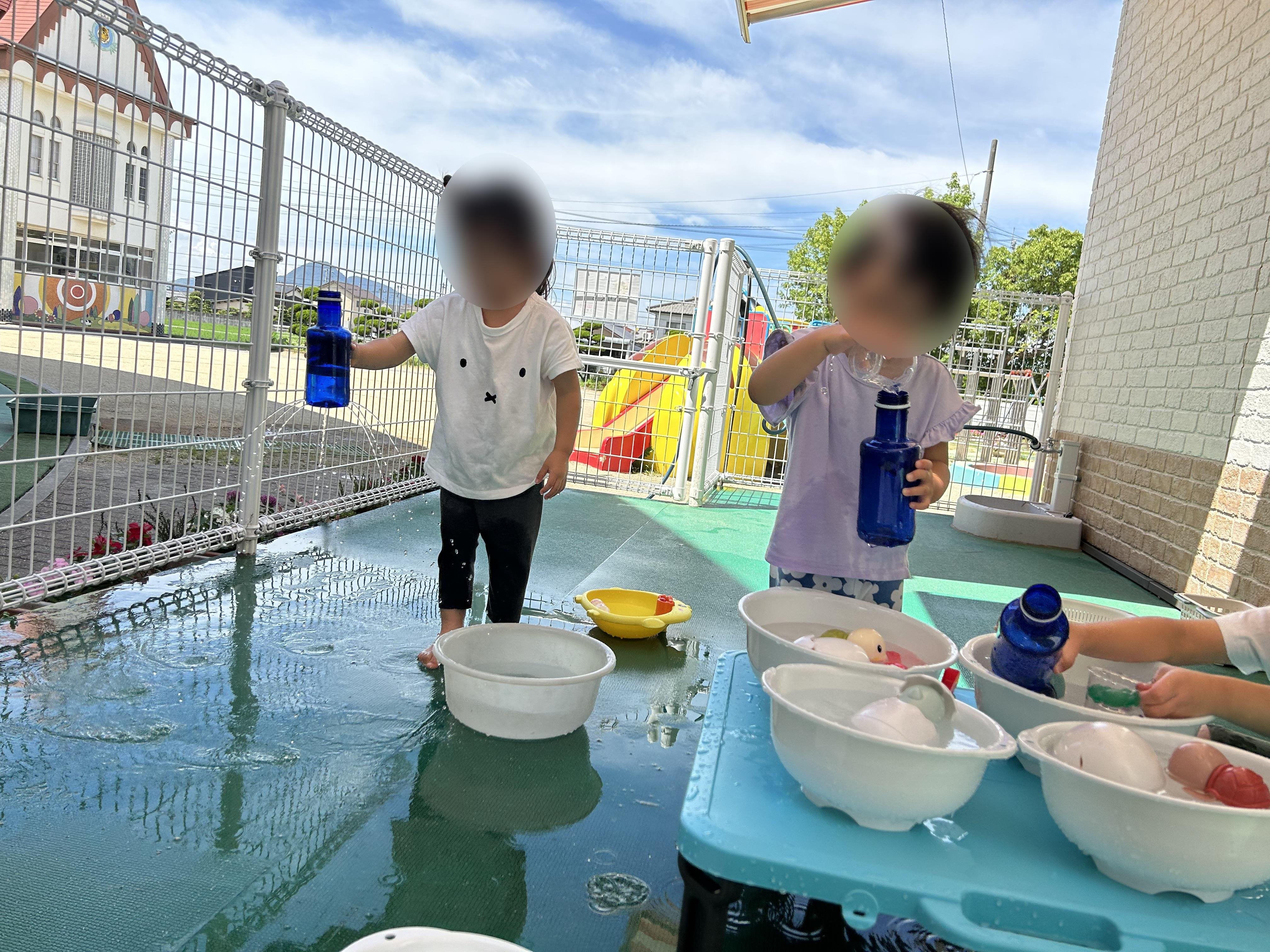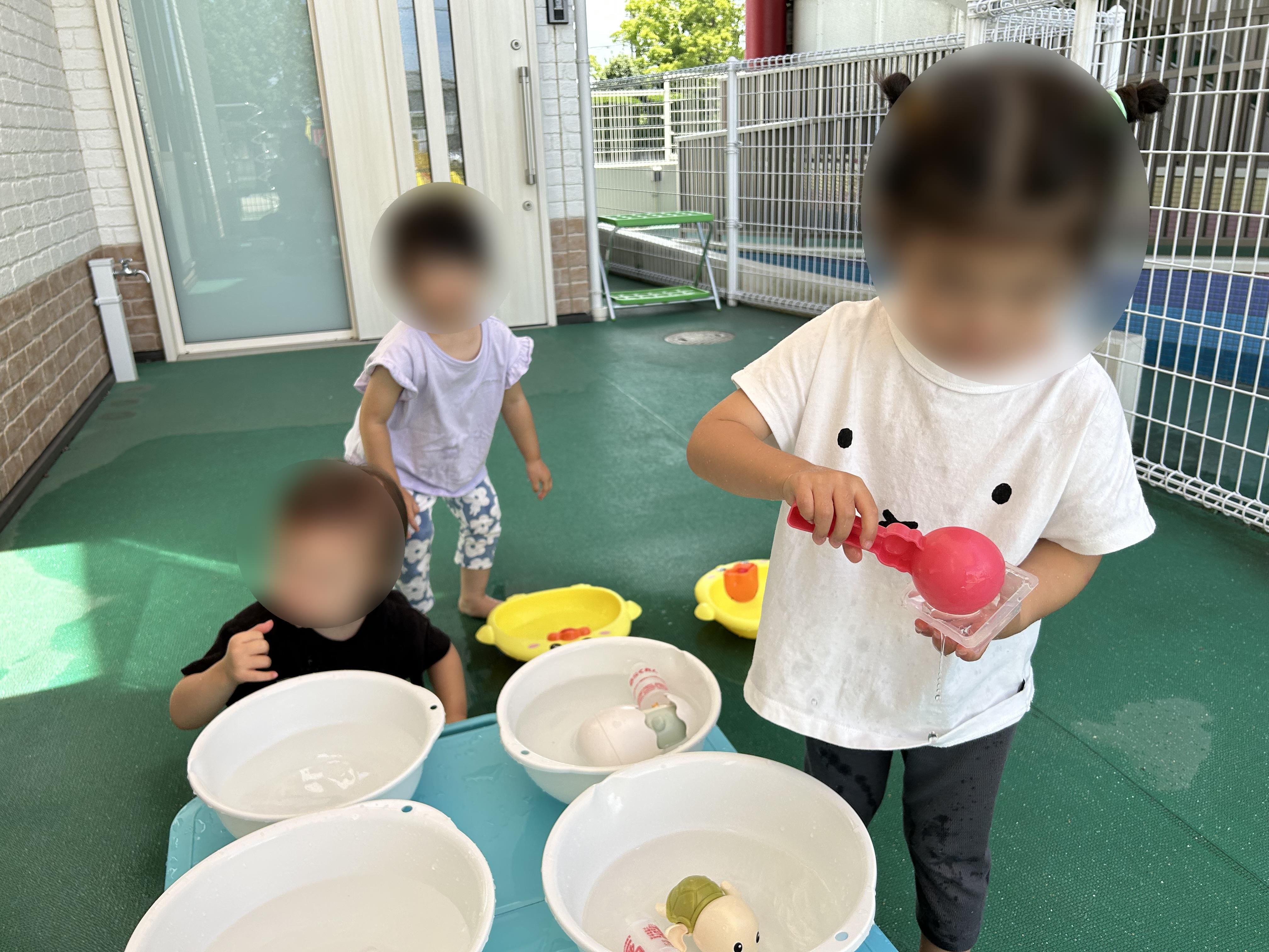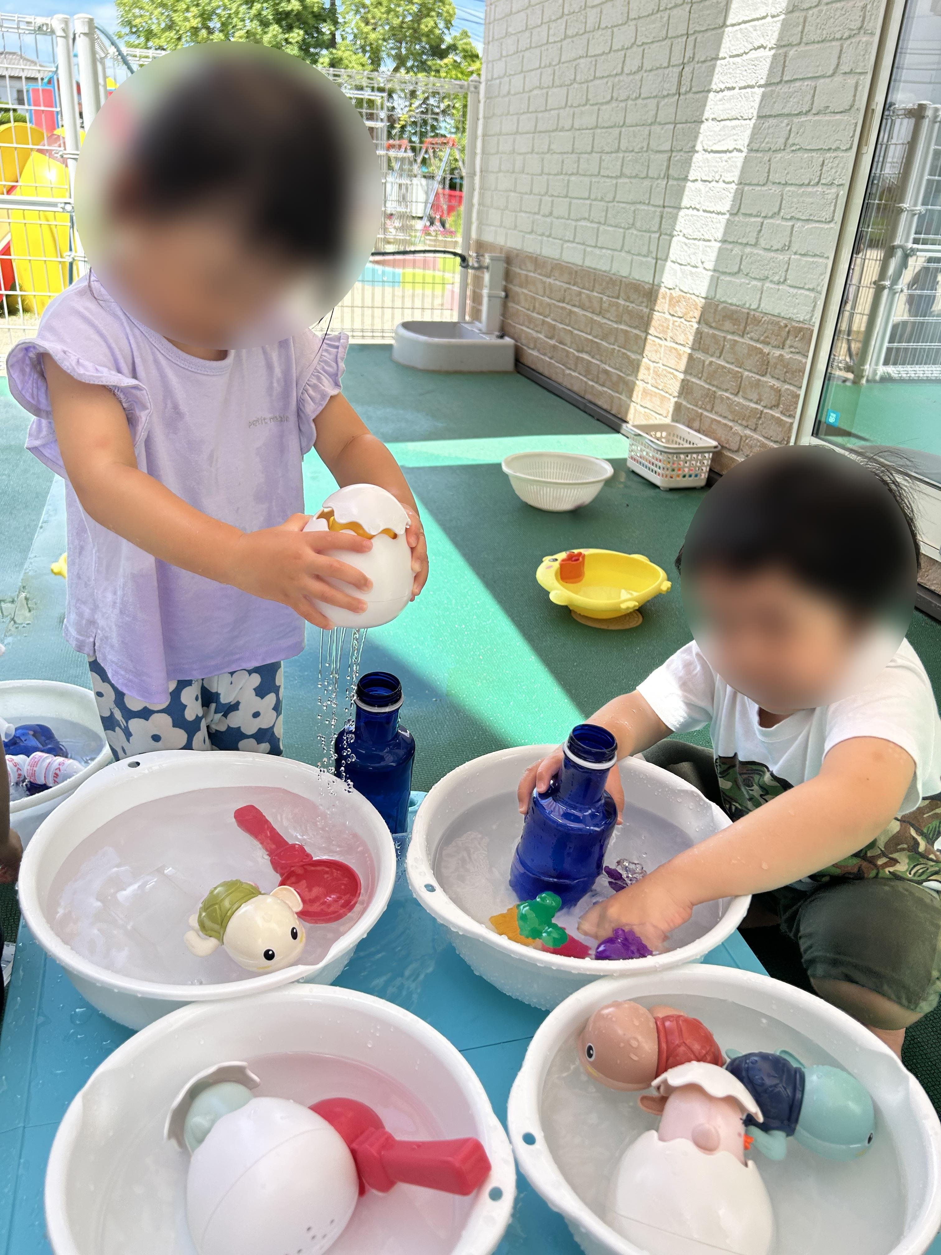未就園のお友達がテラスで遊んでいます。 何に見立てているのか、とても楽しそうでした。