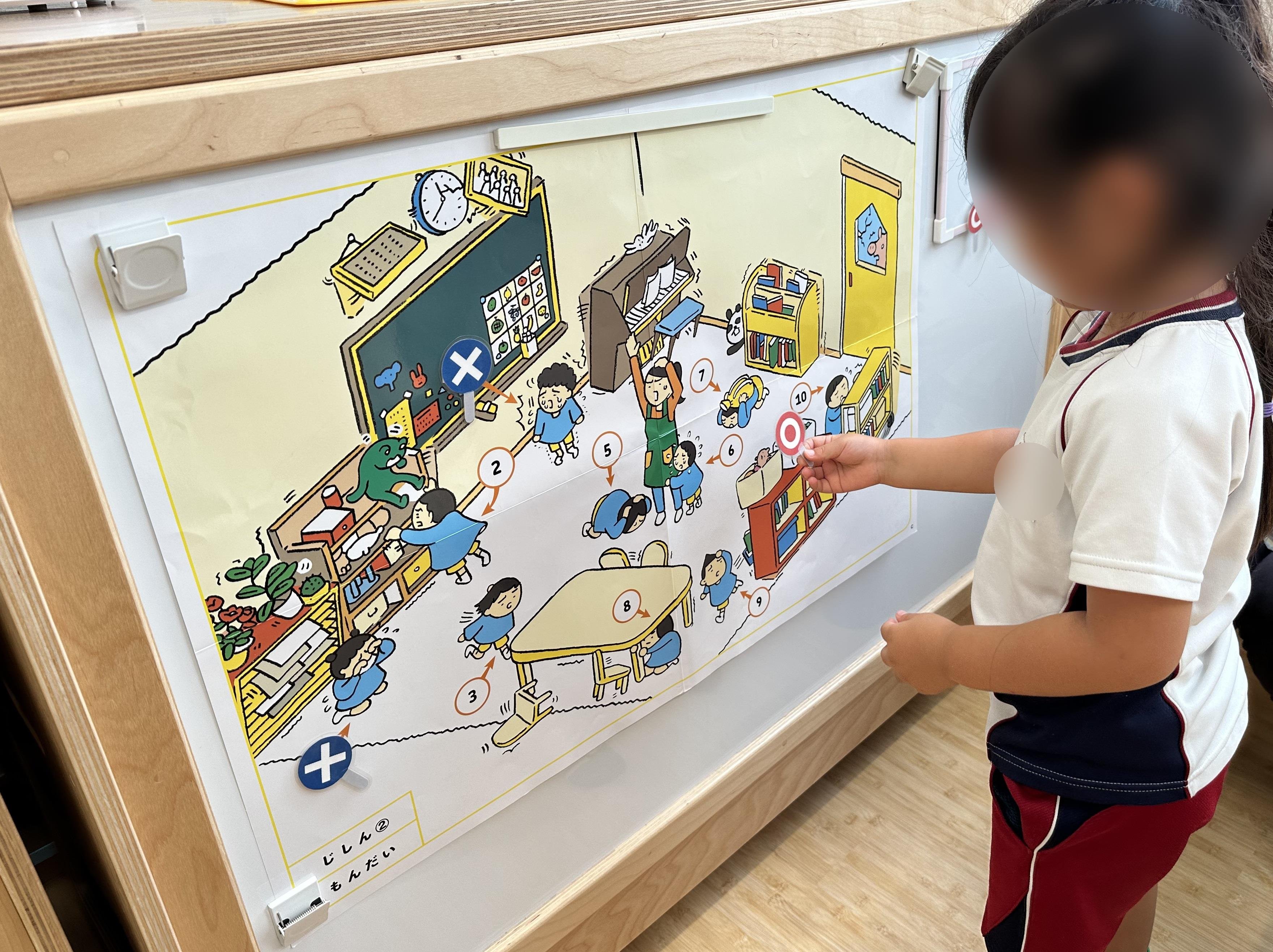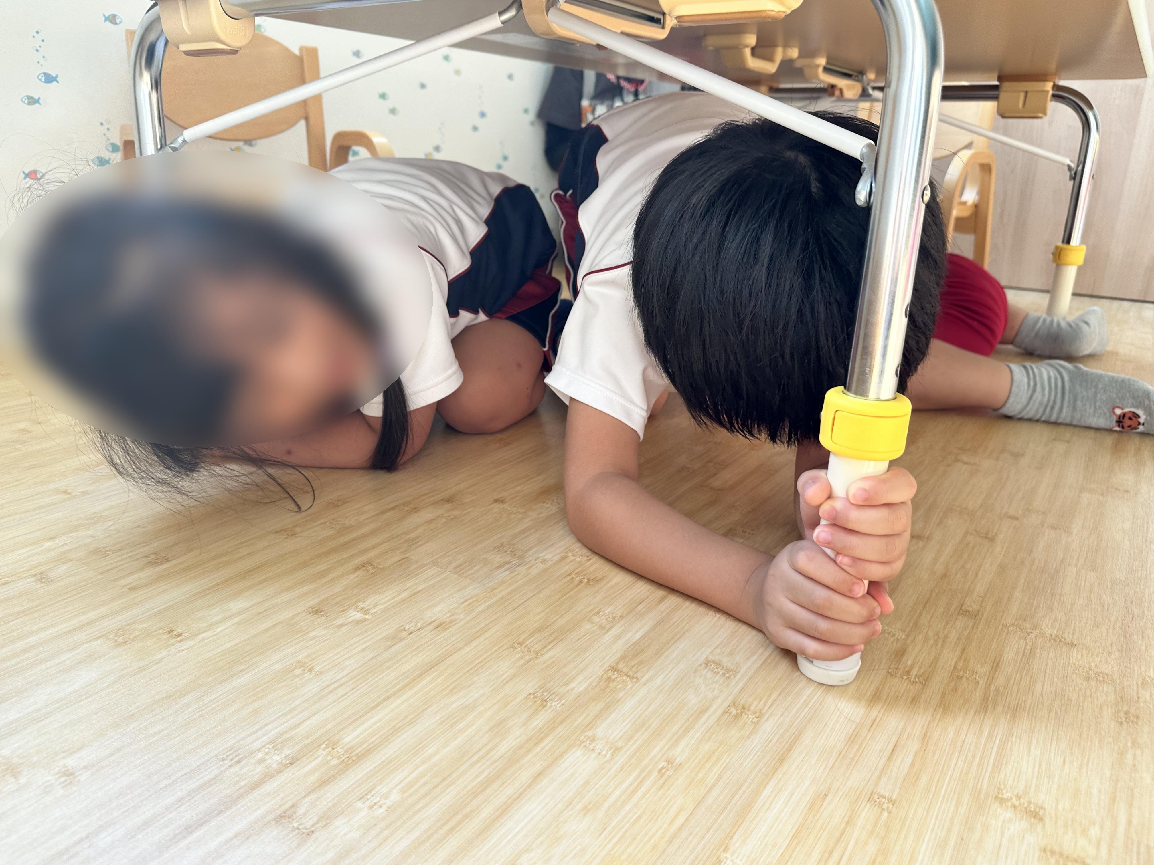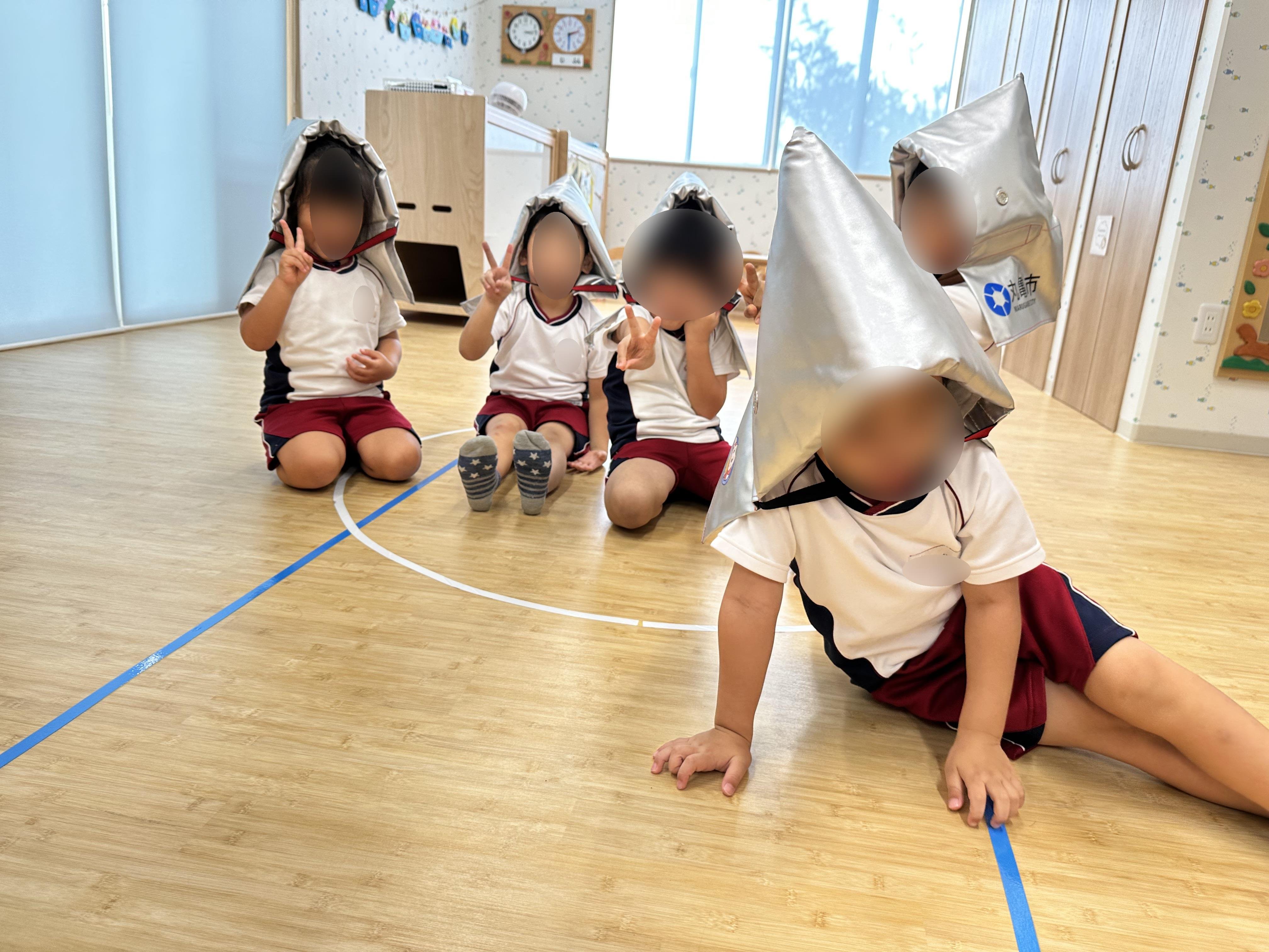 避難訓練 2023年09月12日(火) 今週は避難訓練(地震)習慣です。 危険な箇所や避難の方法をみんなで確認しました。 モノが落ちてきたらあぶないね。 まだ揺れてるかなあ・・・ 防災頭巾をかぶりました。