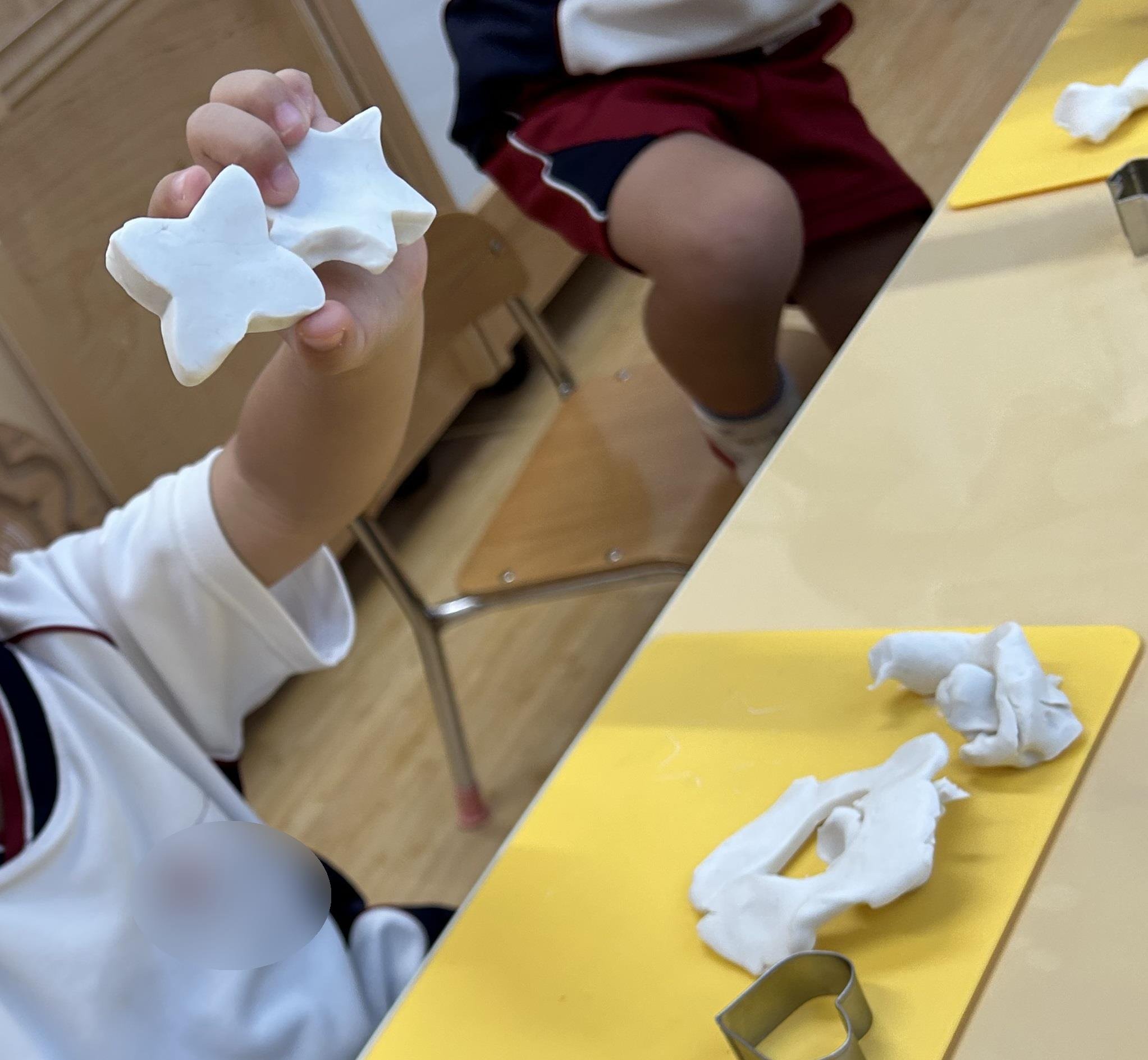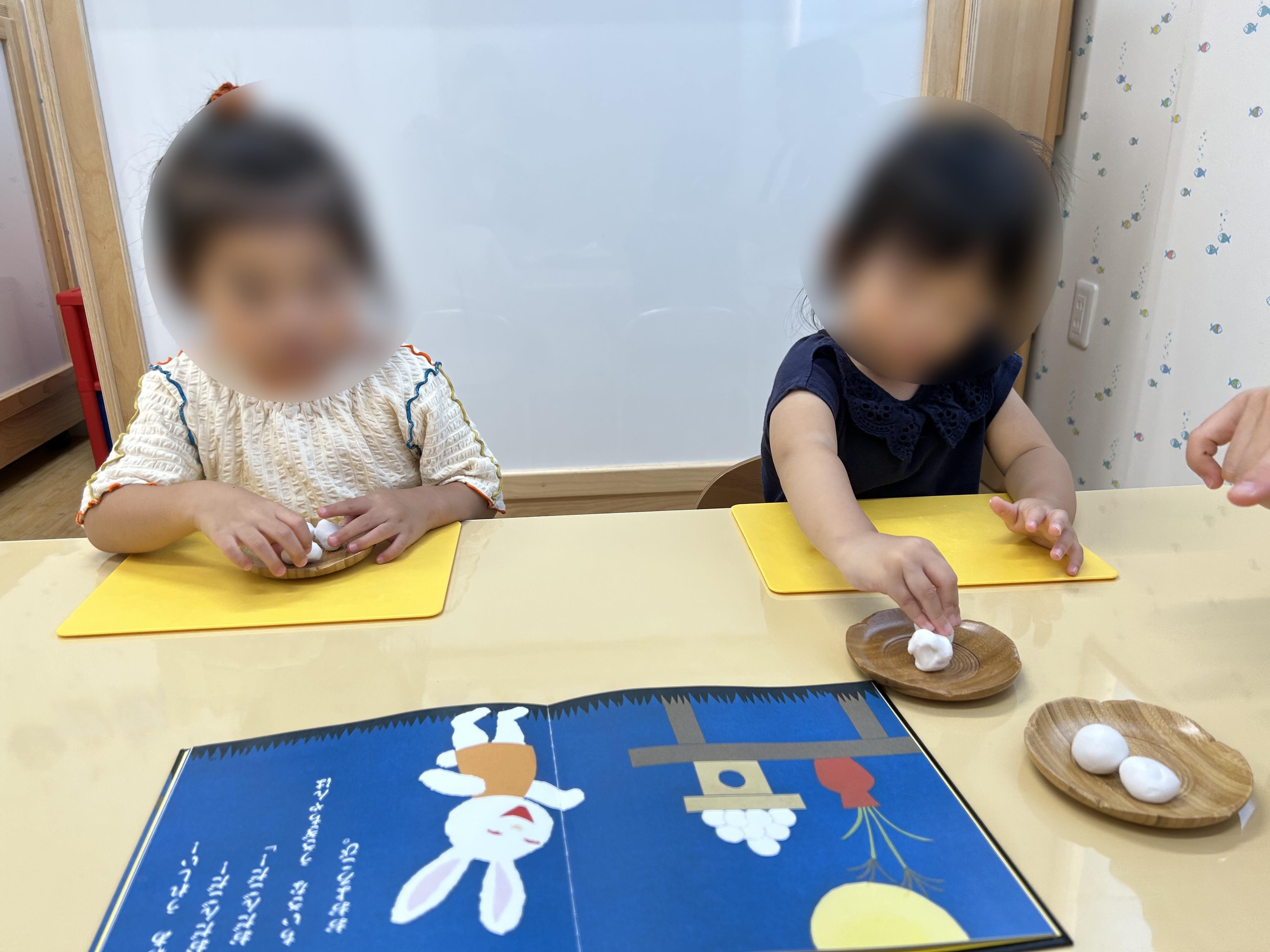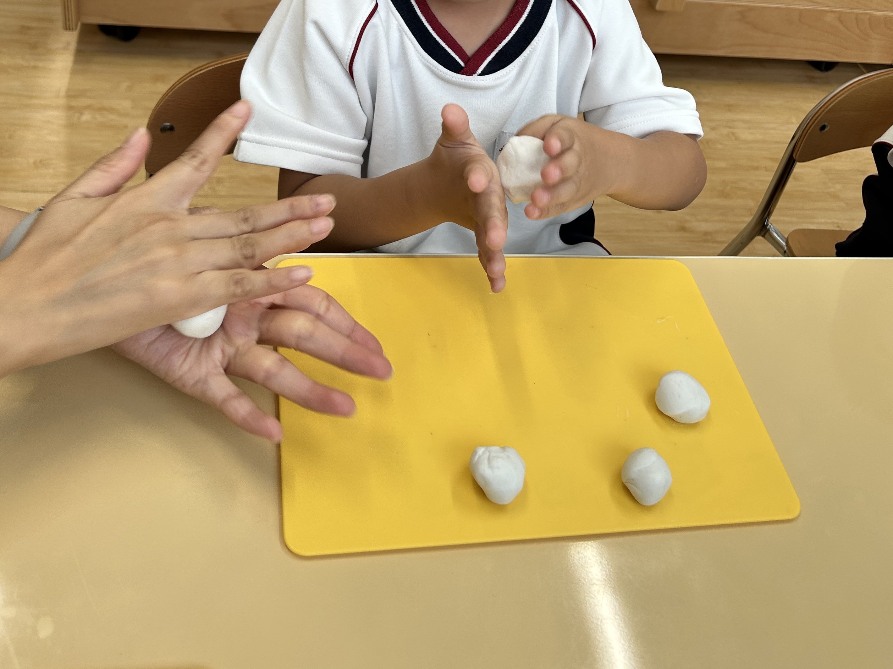 お月見だんごを作ったよ! 2023年09月19日(火) 粘土を使ってまあるいお団子を作ってみました。 粘土の感触や性質を楽しみながら、いろいろな形ができました。 うさぎさんとおんなじだね! おててでくるくる~ みてみて~!
