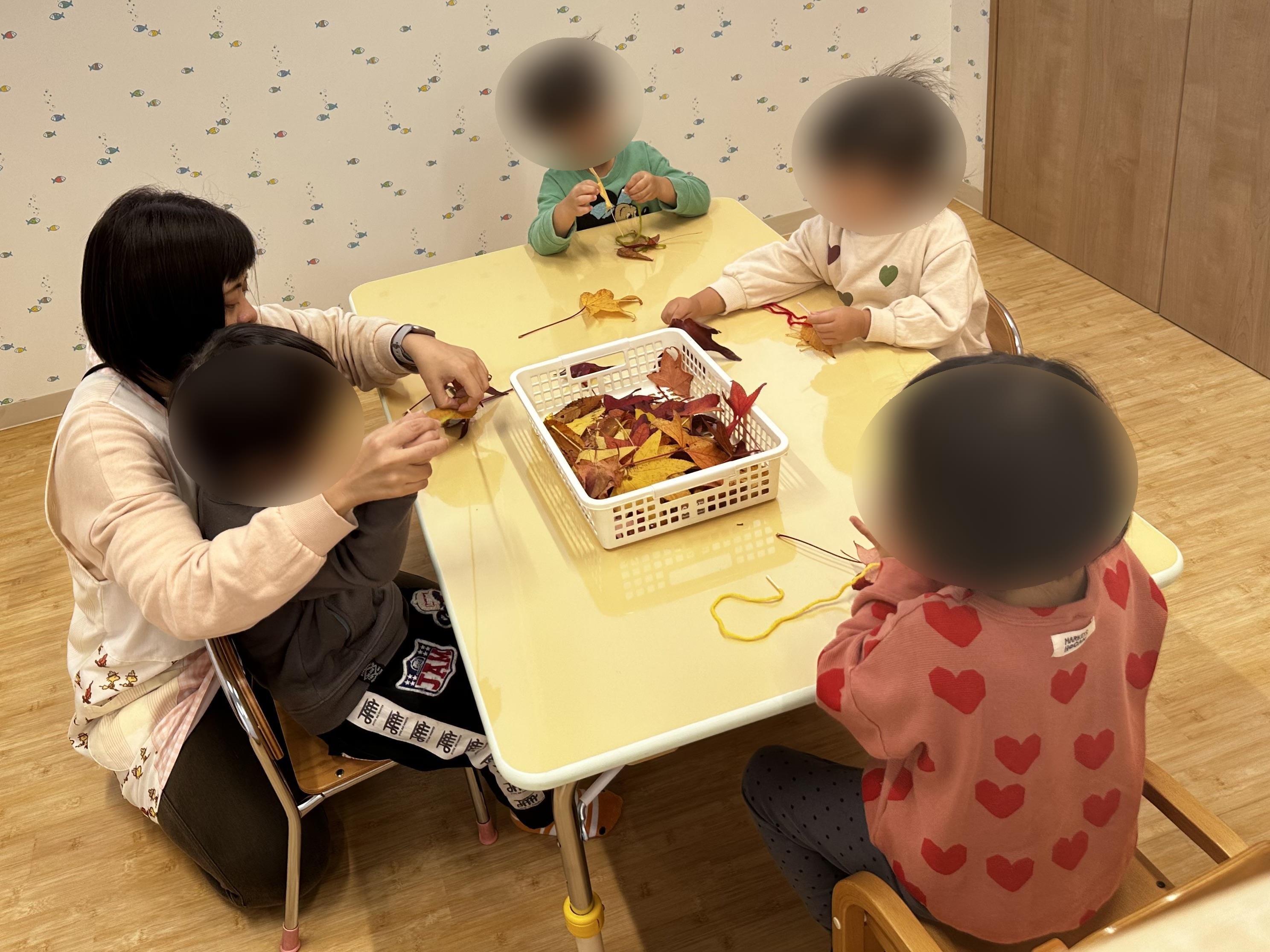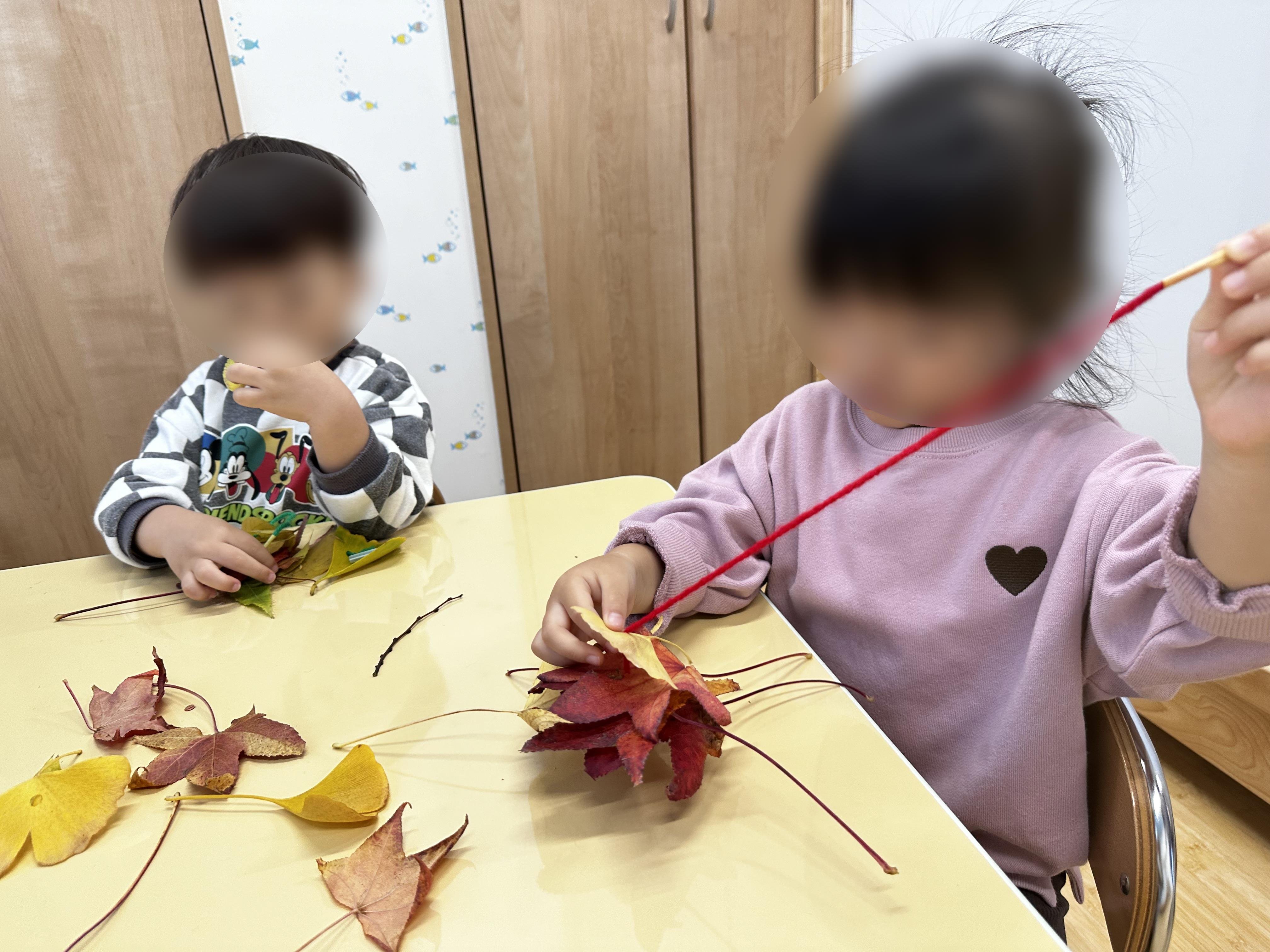 未就園のお友達もお部屋で葉っぱをつないでみました。