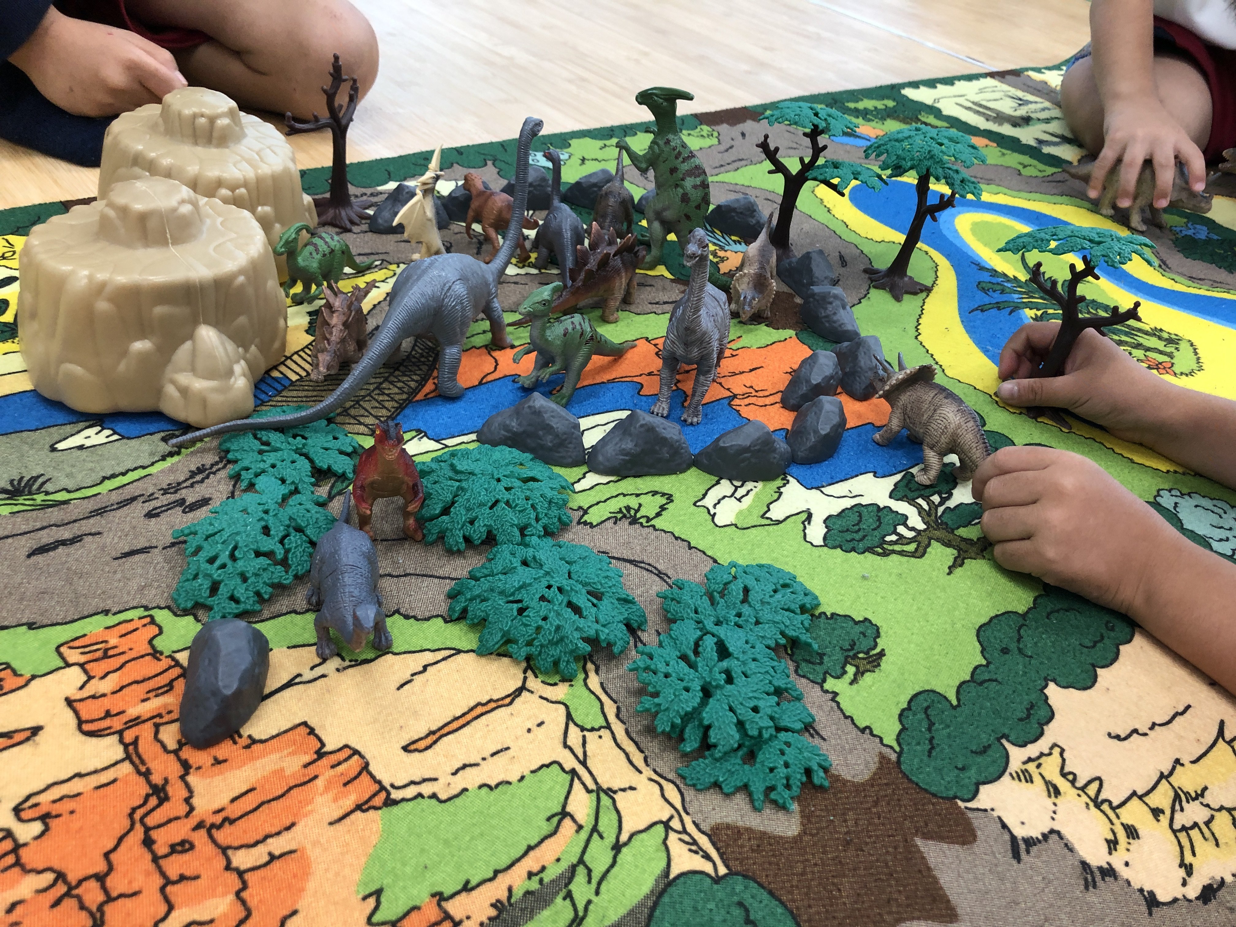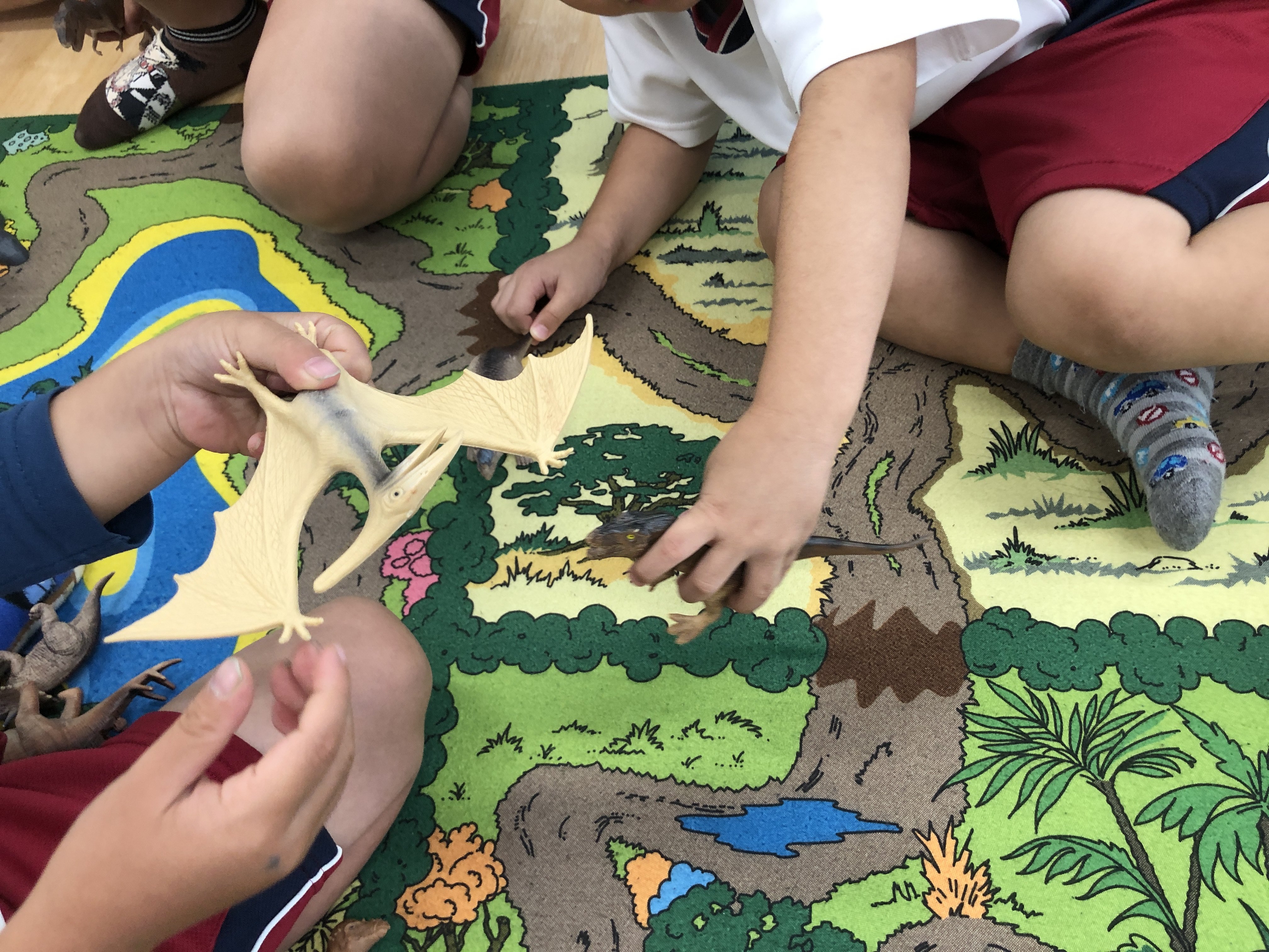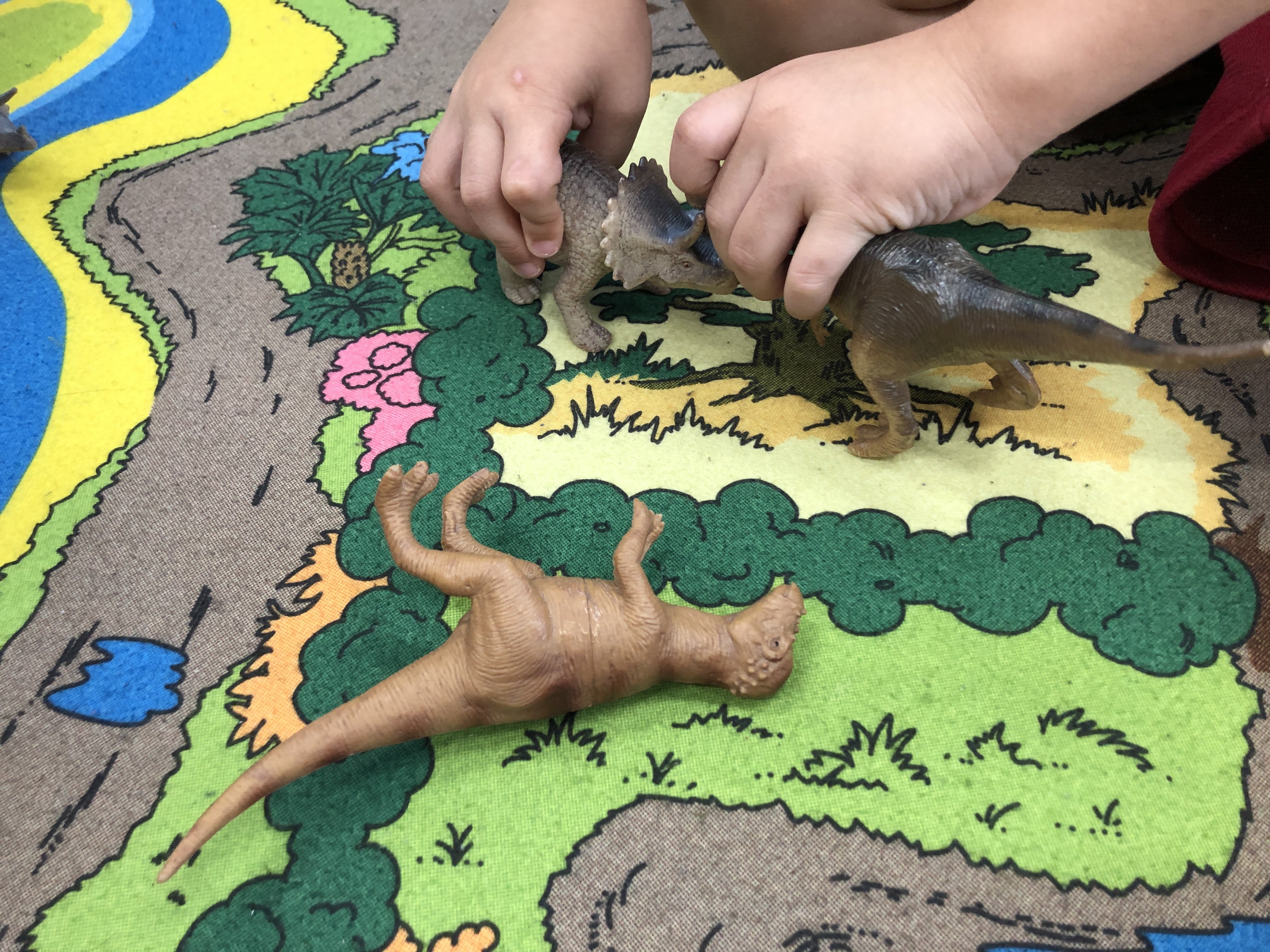 恐竜の世界 2020年10月22日(木) 「好きな遊び」も療育では大切な時間です。 子どもたちに大人気なのは「恐竜ごっこ」。 いろいろなフィギュアを並べ、お話や戦いの世界を作りながら、夢中で遊んでいます。